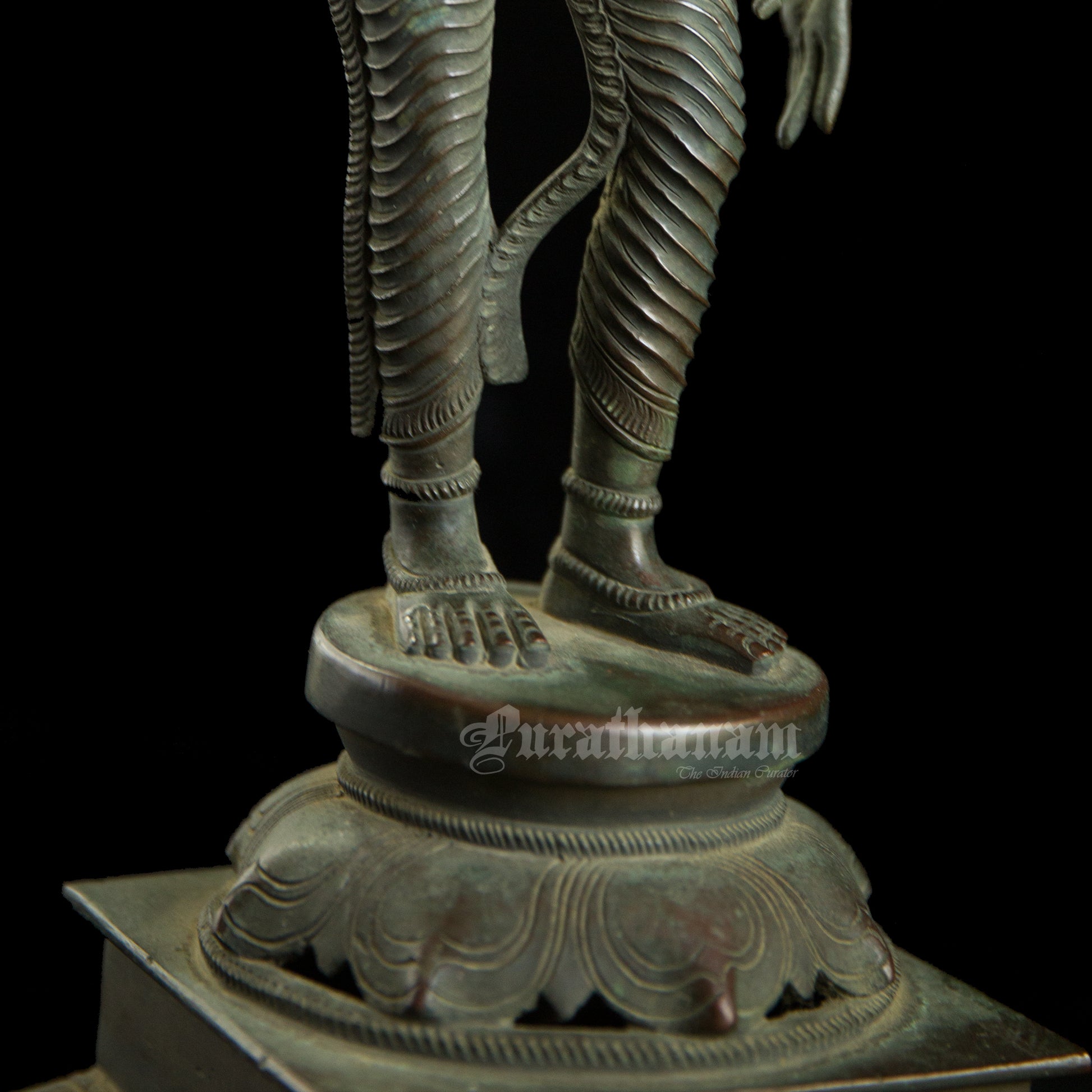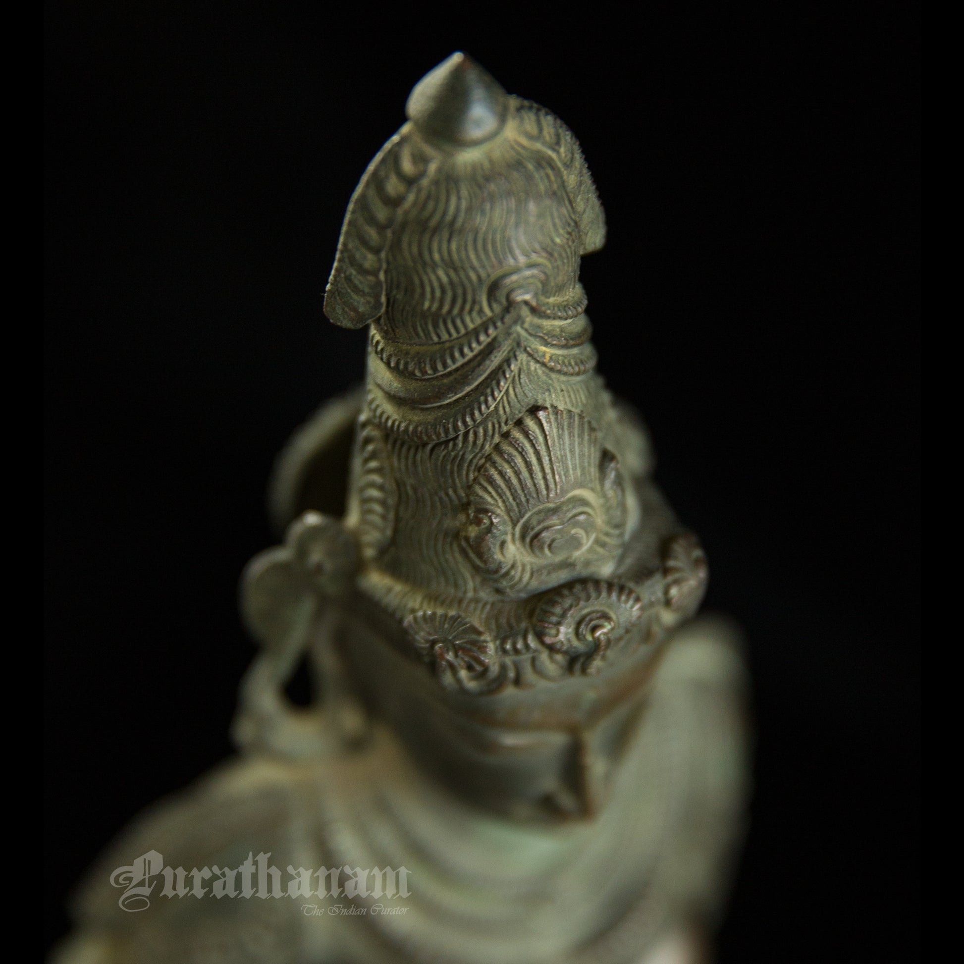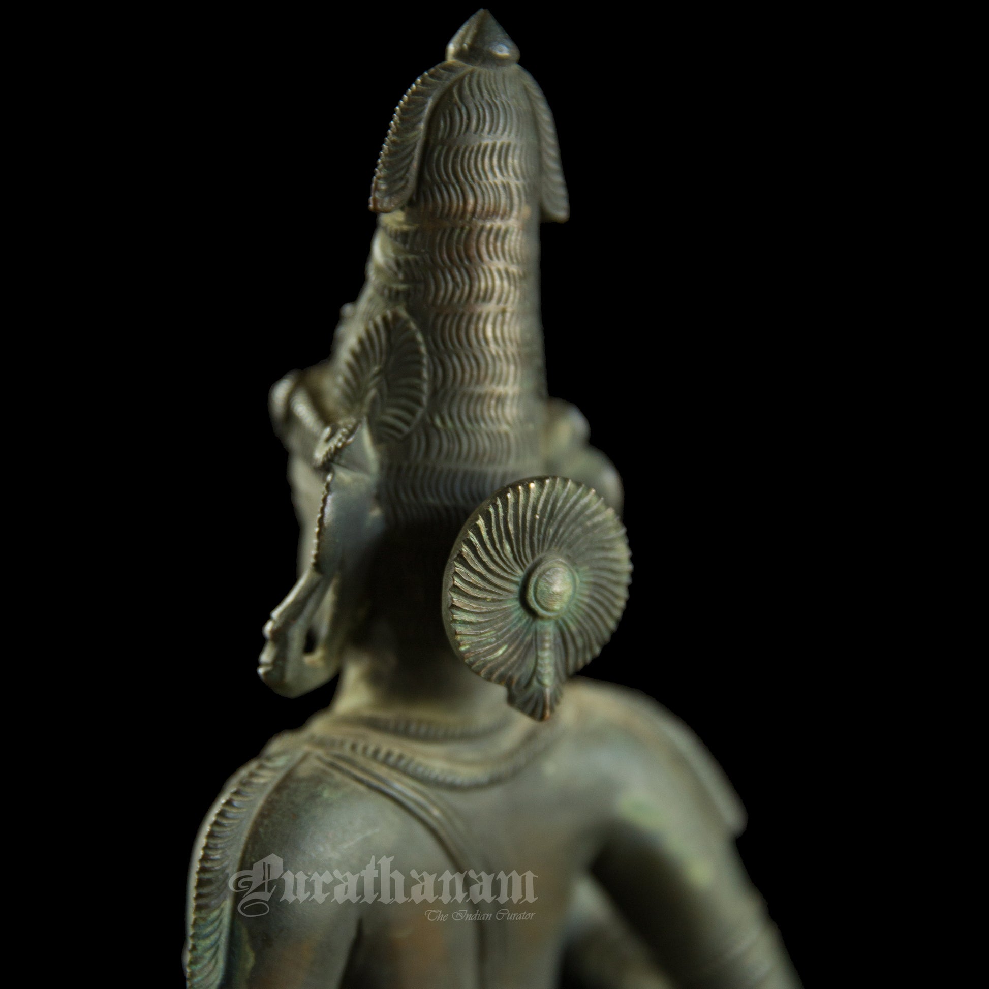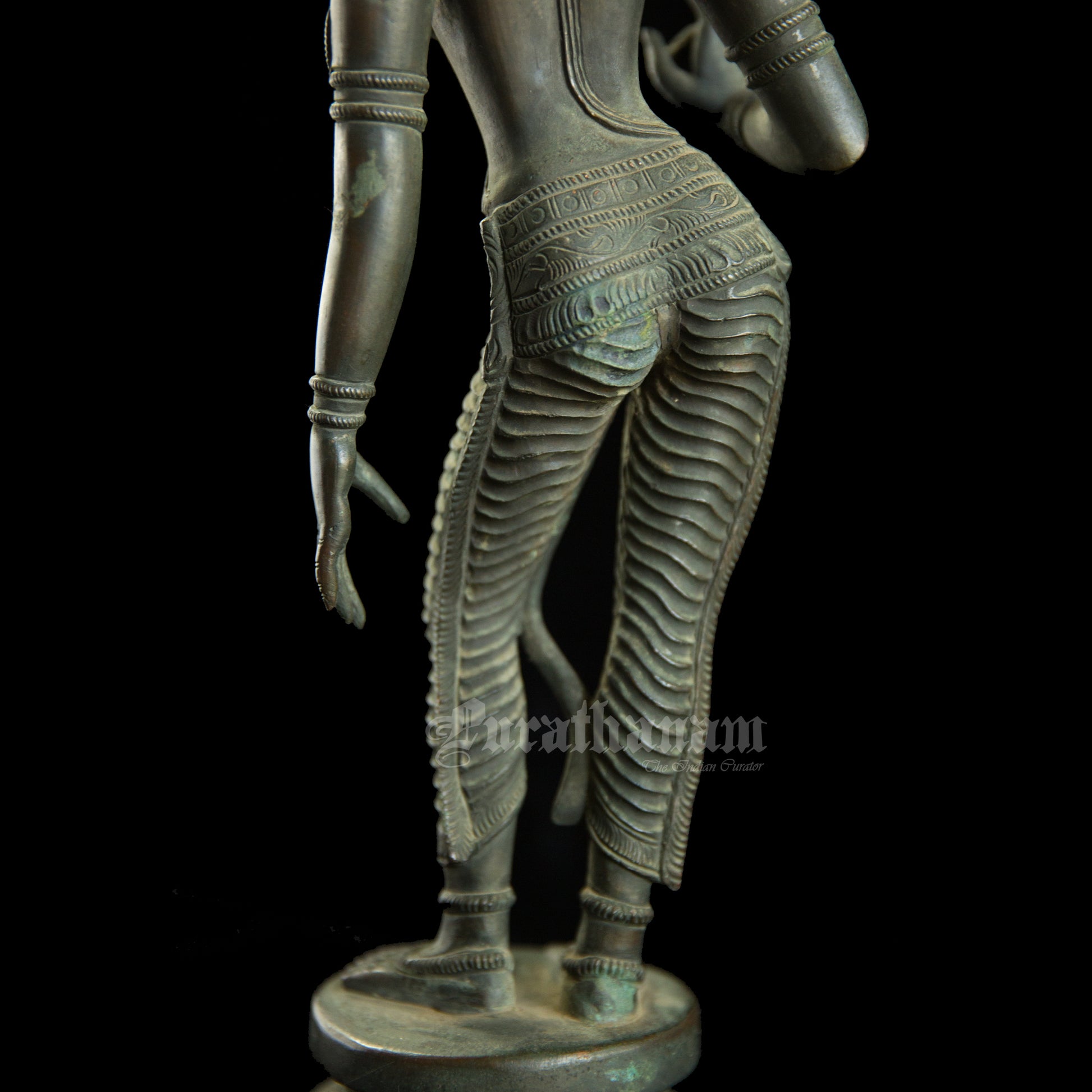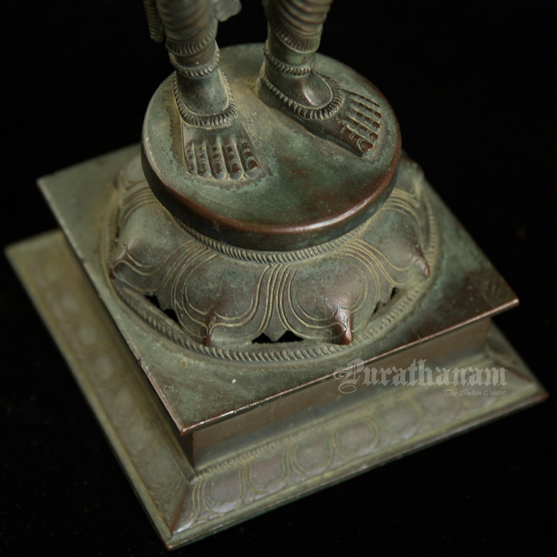Here we have an elegant looking figurine of the Hindu deity Parvati. Made of bronze, this piece has immaculate details of ornaments and garments along with decorative designs on the pedestal she stands on. It is believed that Parvati is the daughter of Himavan the mountain and Mena. In Sanskrit a mountain is called a Parvat. Parvati is the symbol of Shakti or power in a woman and her strength. With a North Eastern style of structure, this Parvati has an elegance that can't be described in words. With each detail adding to the beauty, the figurine could be the zing that you need for your space.