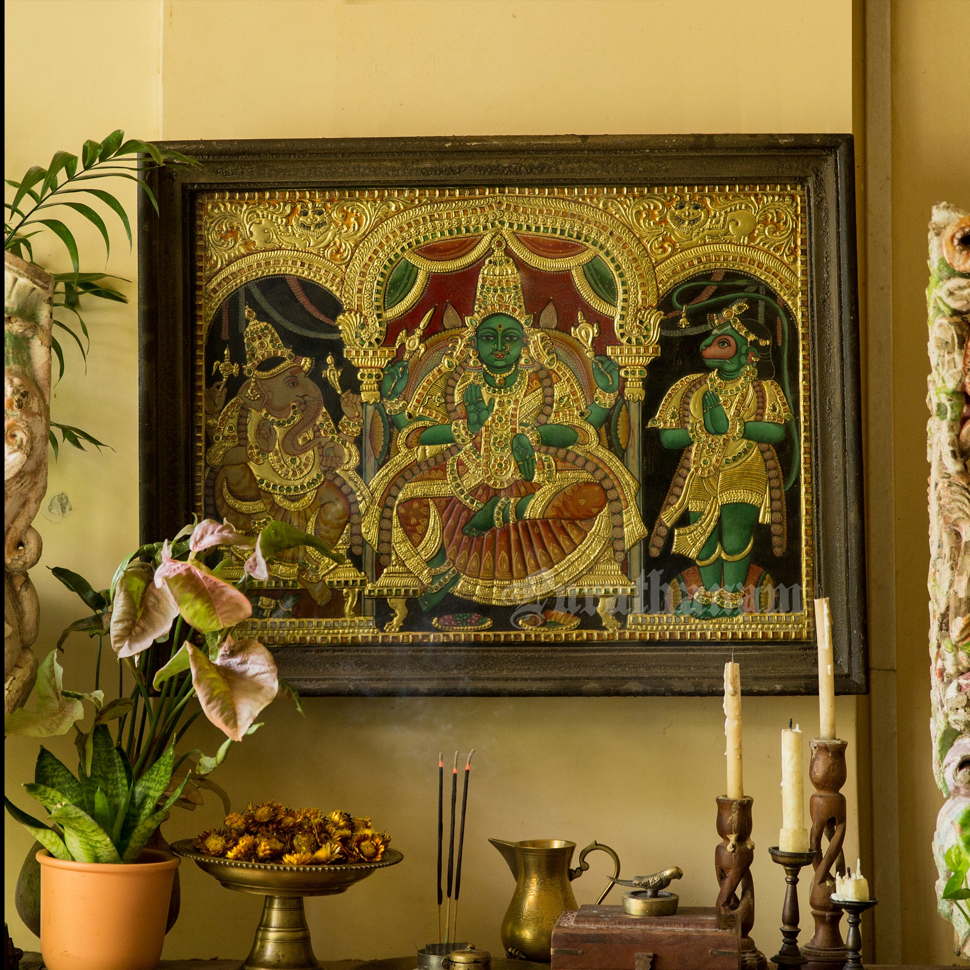Here is an unique Tanjore painting of Parvathi seated between Ganapati and Hanuman. Both Hanuman and Ganapathi are known as Mangal Murti meaning symbols of auspiciousness and both are worshiped on Tuesdays. They both together are called “Aadyantha Prabhu”. It is said that our worship should begin with Ganesha and end up with Anjaneya. There’s a belief that Ganesha rules over our senses. So the purpose why Ganesha is placed at the entrance of a temple is to ensure that we have our senses in our control when we enter a temple to worship. So he is 'Aadhi' or he is the beginning. Similarly, Lord Hanuman is worshipped at the end. This is because Lord Hanuman blesses people to ensure they hold onto their faith and not lose hope. He is the god of bravery, helping people stay on the path of righteousness and confidence. Hence he is 'anta' or end. So here the Unknown artist has imagined Goddess Parvathi in the Center which is pretty rare sight.