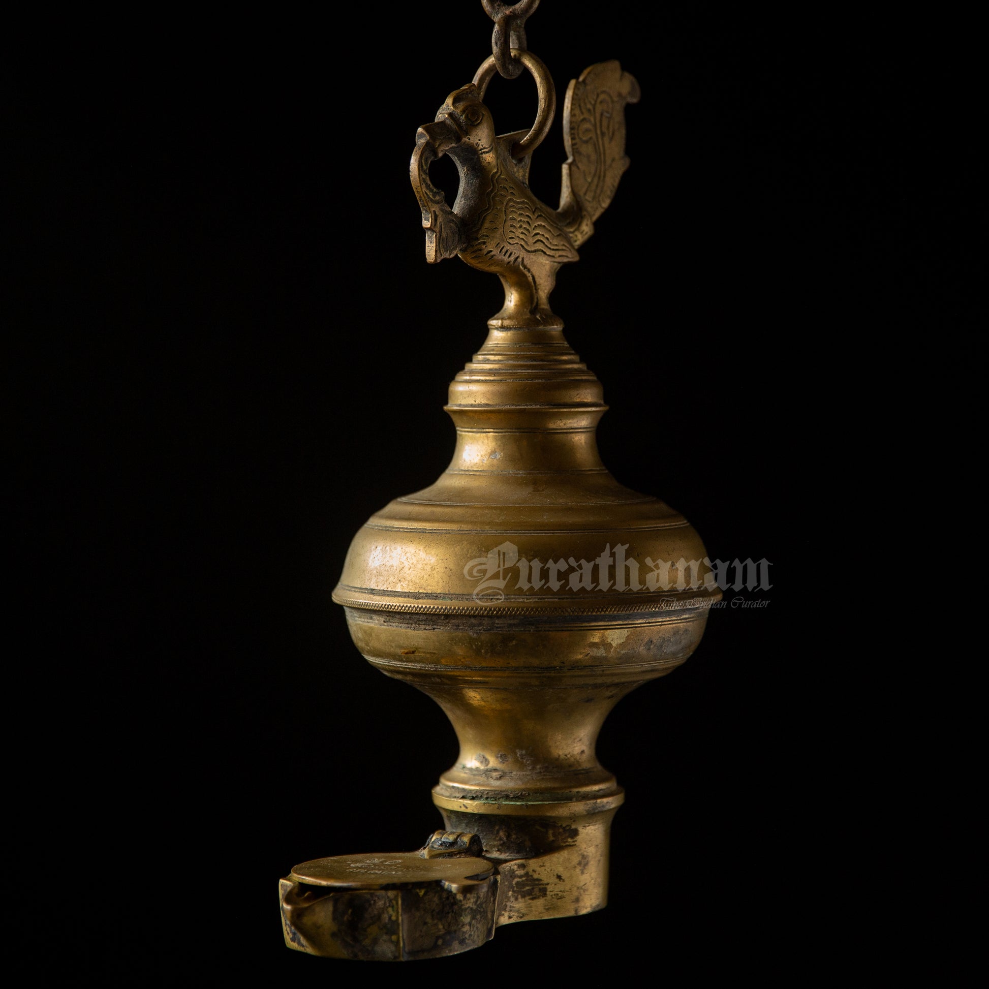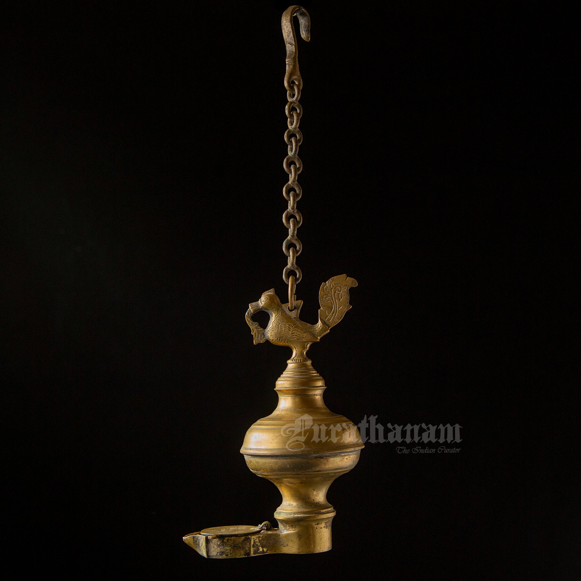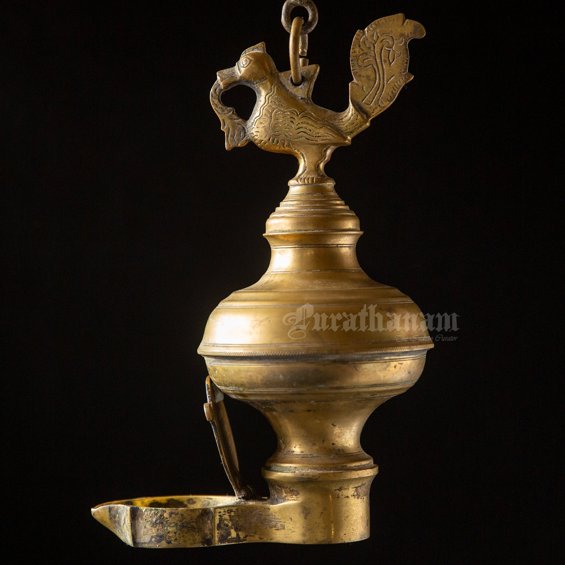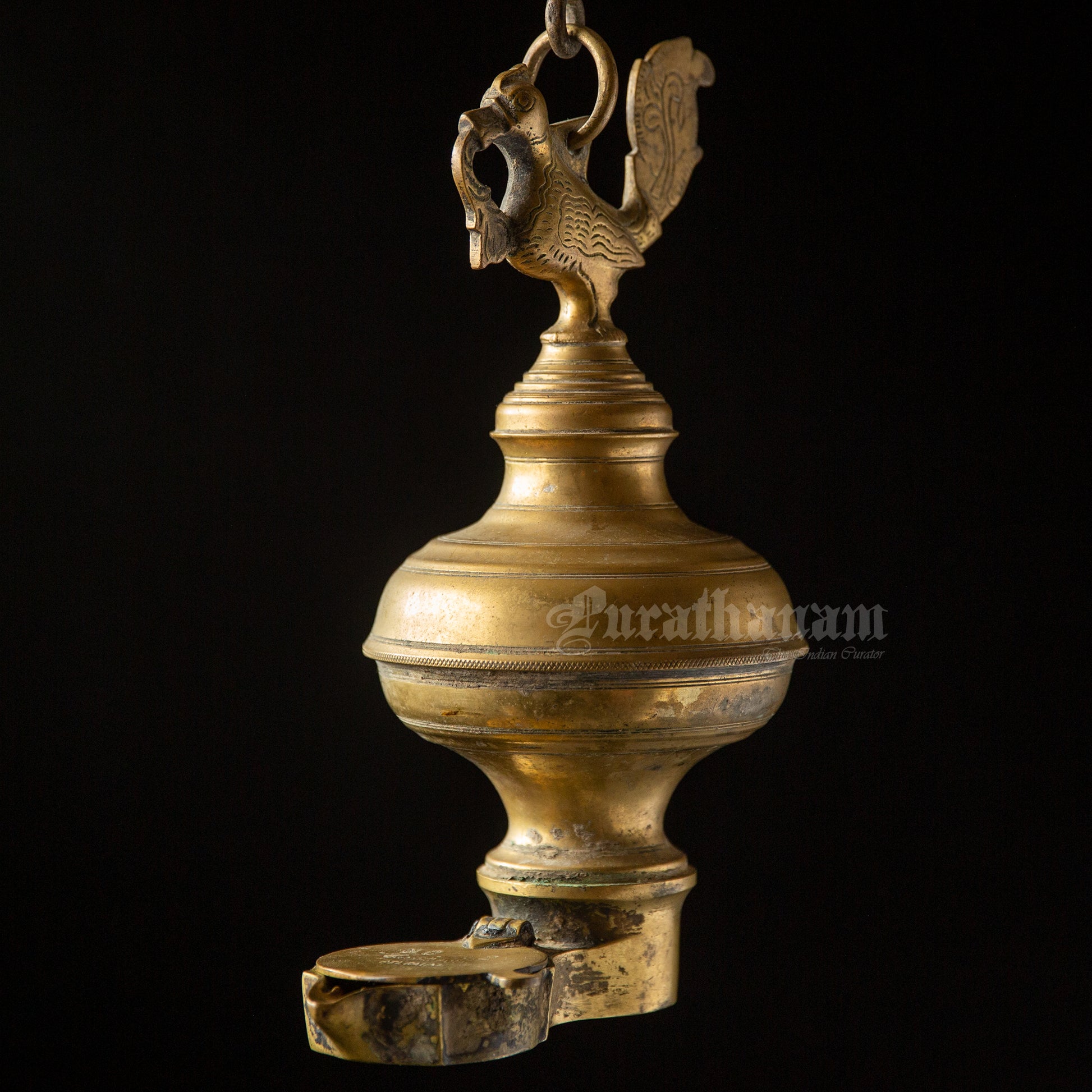 Here we have a real antique perpetual lamp called ‘Thoondamani vilakku’ from Tamizhnadu, south of India. It is a hanging votive lamp in a chain with a swan (Annaparavai) at the top and the wick at the bottom. The large ball shape seen in-between the swan and the wick was originally an oil well used to function as an reservoir in which the ghee was poured. This ‘Thoondamani vilakku’ is a non functioning lamp and it is a show piece to decorate your beautiful home as it has great significance in the history of South Indians from the Sangam period (300 BCE to 300CE).
