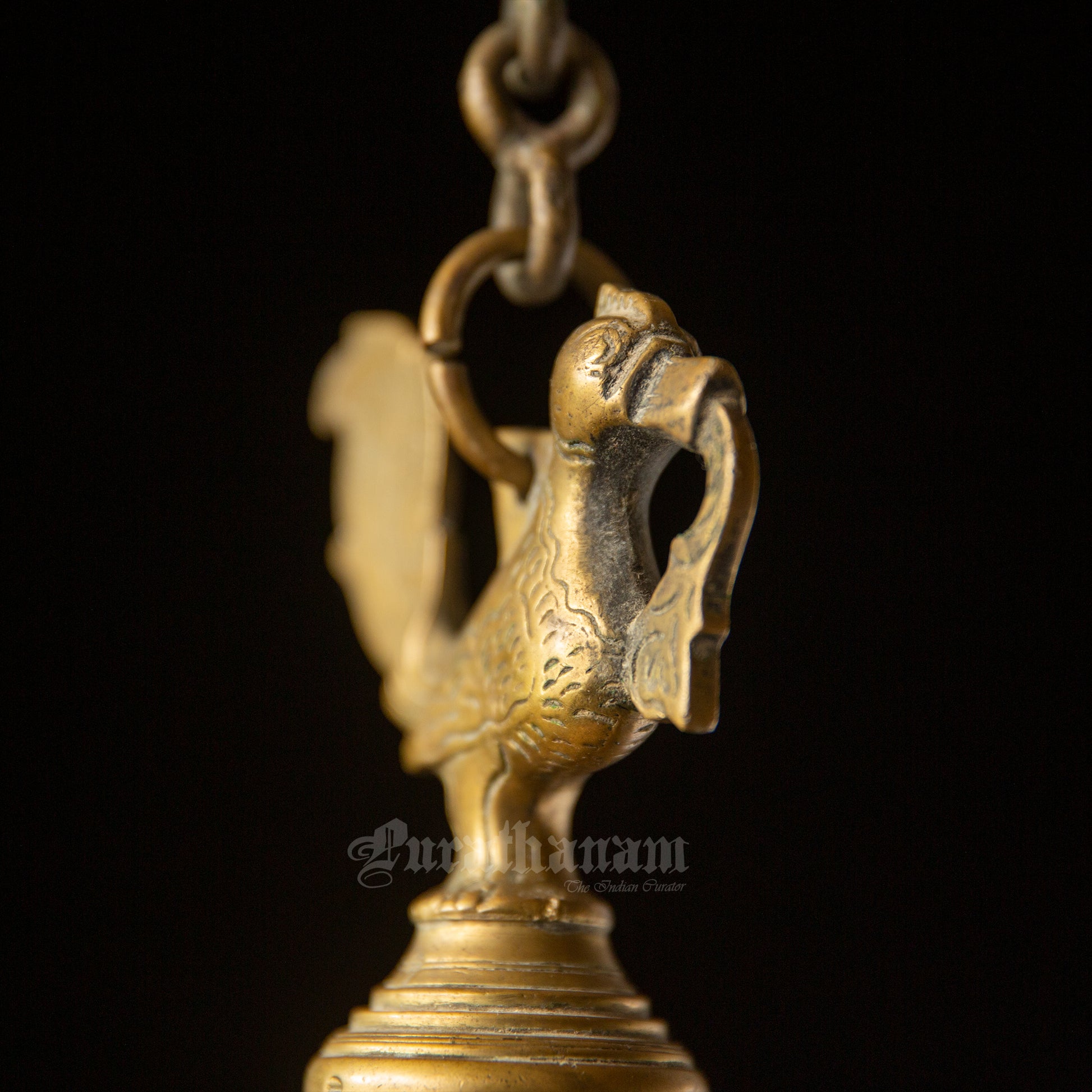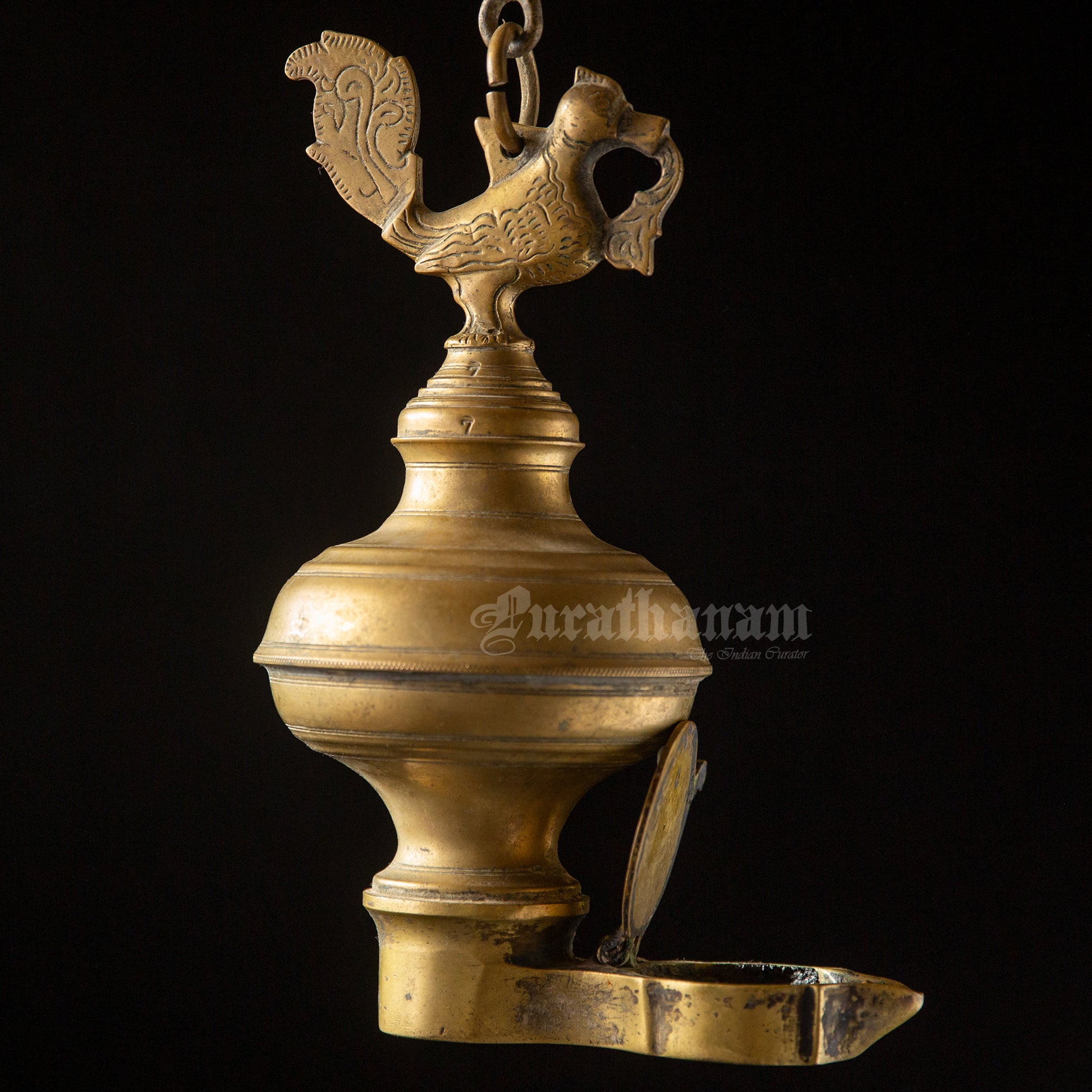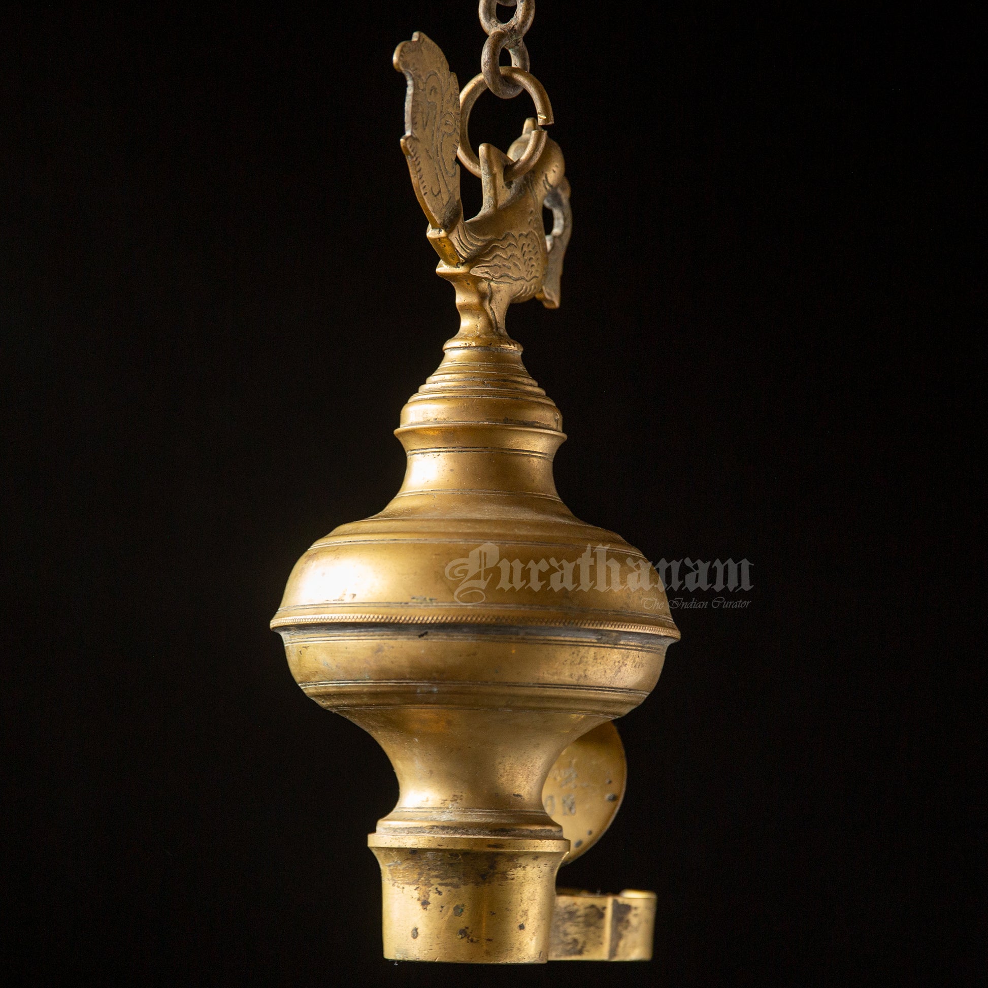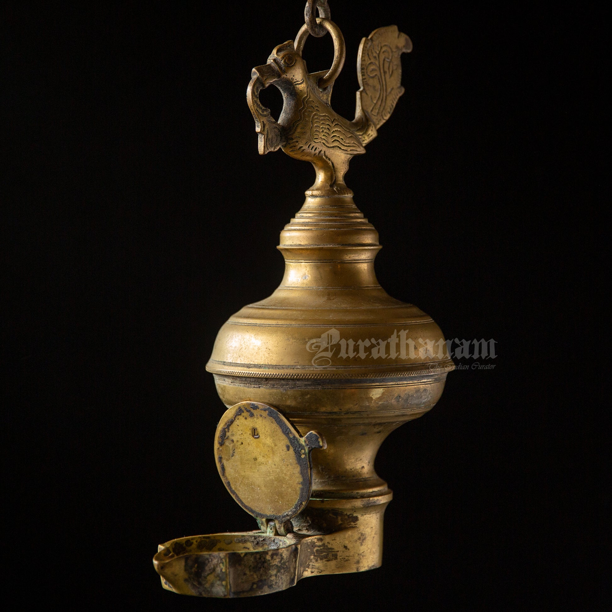 Here we have a real antique perpetual lamp called ‘Thoondamani vilakku’ from Tamizhnadu, south of India. It is a hanging votive lamp in a chain with a swan (Annaparavai) at the top and the wick at the bottom. The large ball shape seen in-between the swan and the wick was originally an oil well used to function as an reservoir in which the ghee was poured. This ‘Thoondamani vilakku’ is a non functioning lamp and it is a show piece to decorate your beautiful home as it has great significance in the history of South Indians from the Sangam period (300 BCE to 300CE).