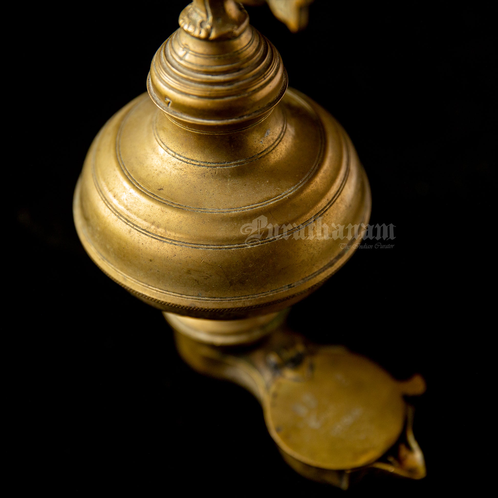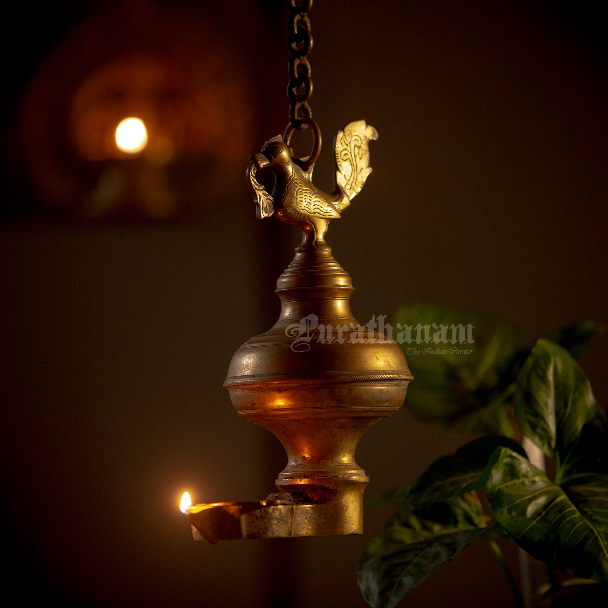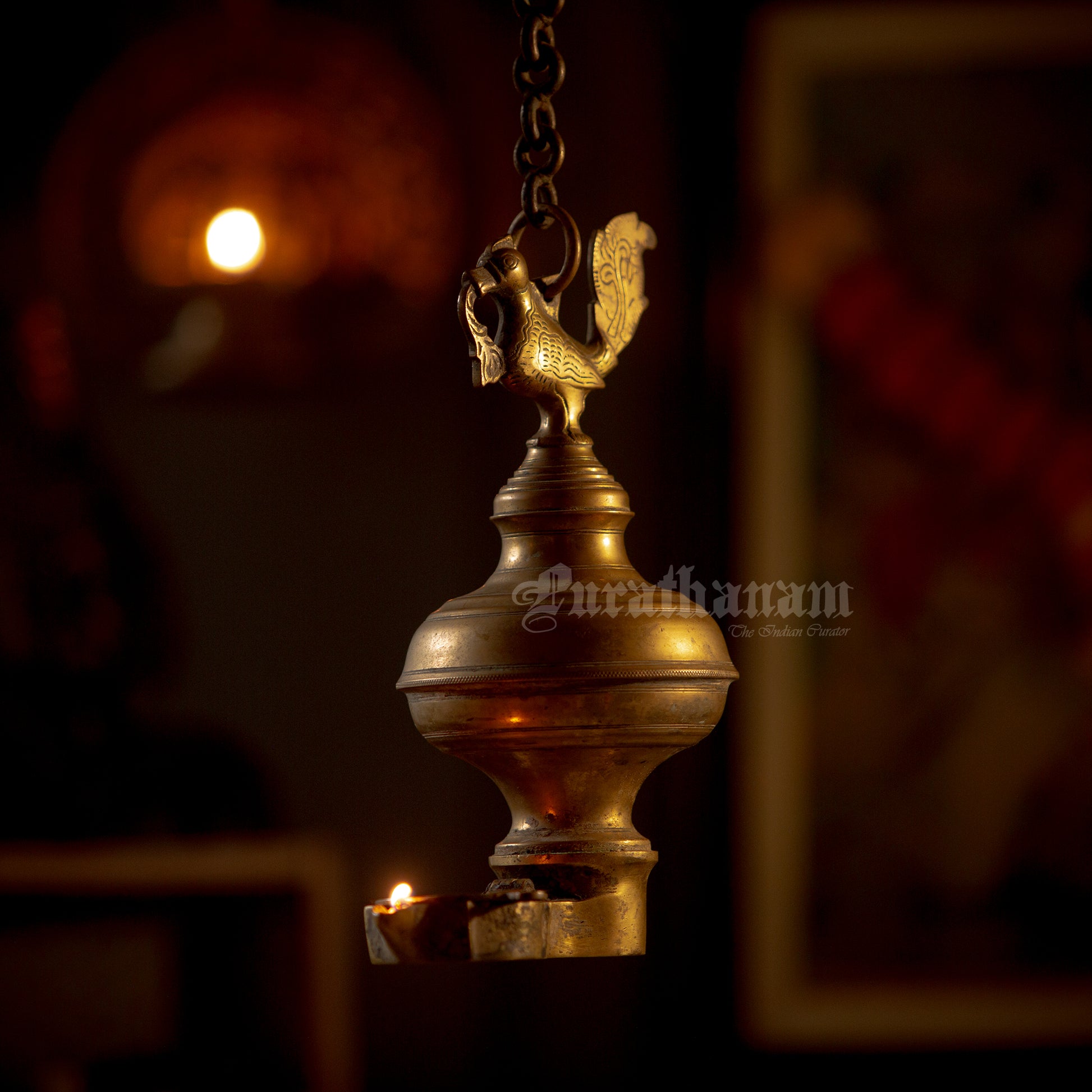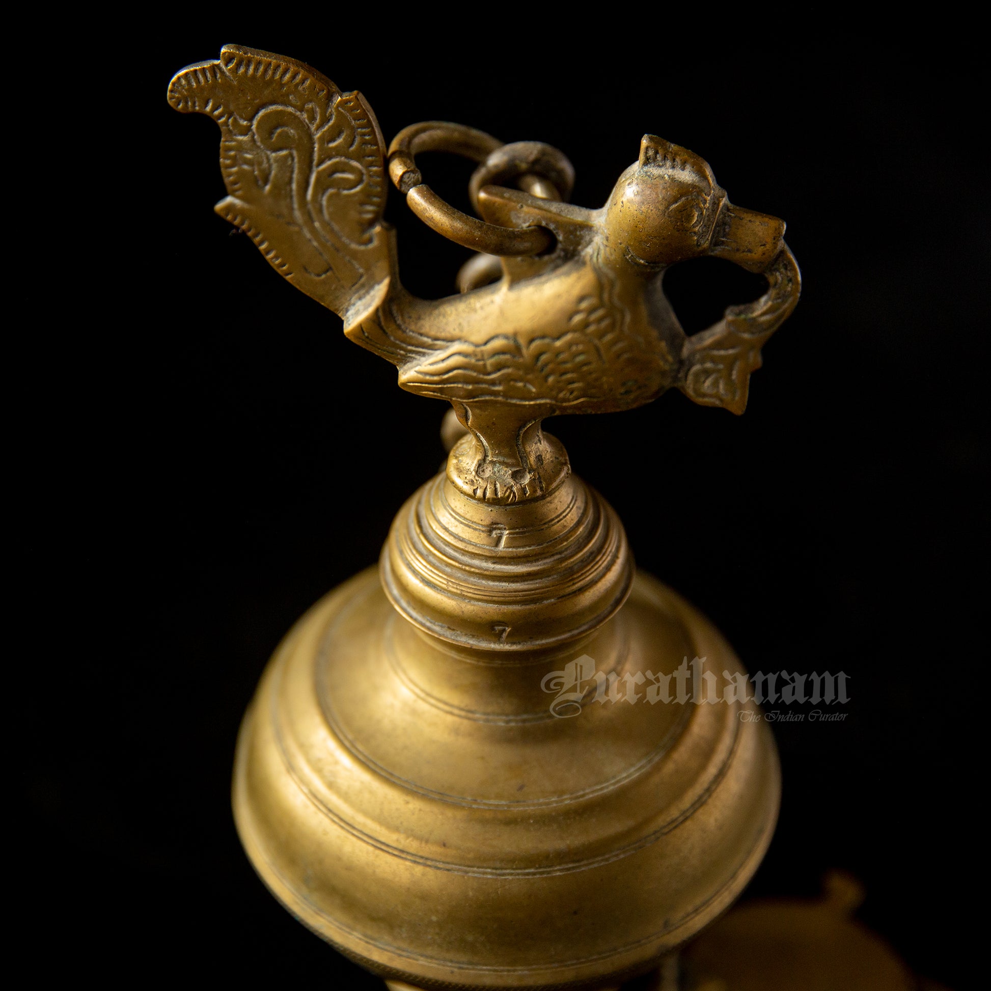 Here we have a real antique perpetual lamp called ‘Thoondamani vilakku’ from Tamizhnadu, south of India. It is a hanging votive lamp in a chain with a swan (Annaparavai) at the top and the wick at the bottom. The large ball shape seen in-between the swan and the wick was originally an oil well used to function as an reservoir in which the ghee was poured. This ‘Thoondamani vilakku’ is a non functioning lamp and it is a show piece to decorate your beautiful home as it has great significance in the history of South Indians from the Sangam period (300 BCE to 300CE).