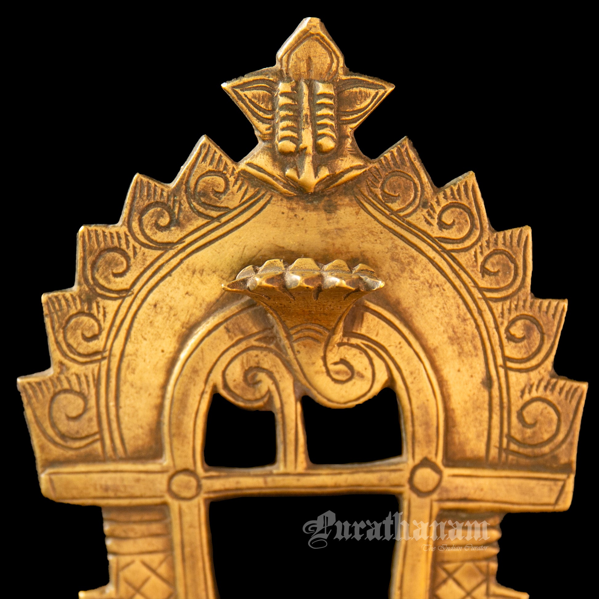 Prabhāvalis are crafted from wood or metal, in a circular or oval decorative ring adorned with several jvālās, which are protruding tongues of flame. Positioned at the center of the arch is the formidable Keertimukha, a protective entity commonly seen guarding temple entrances.