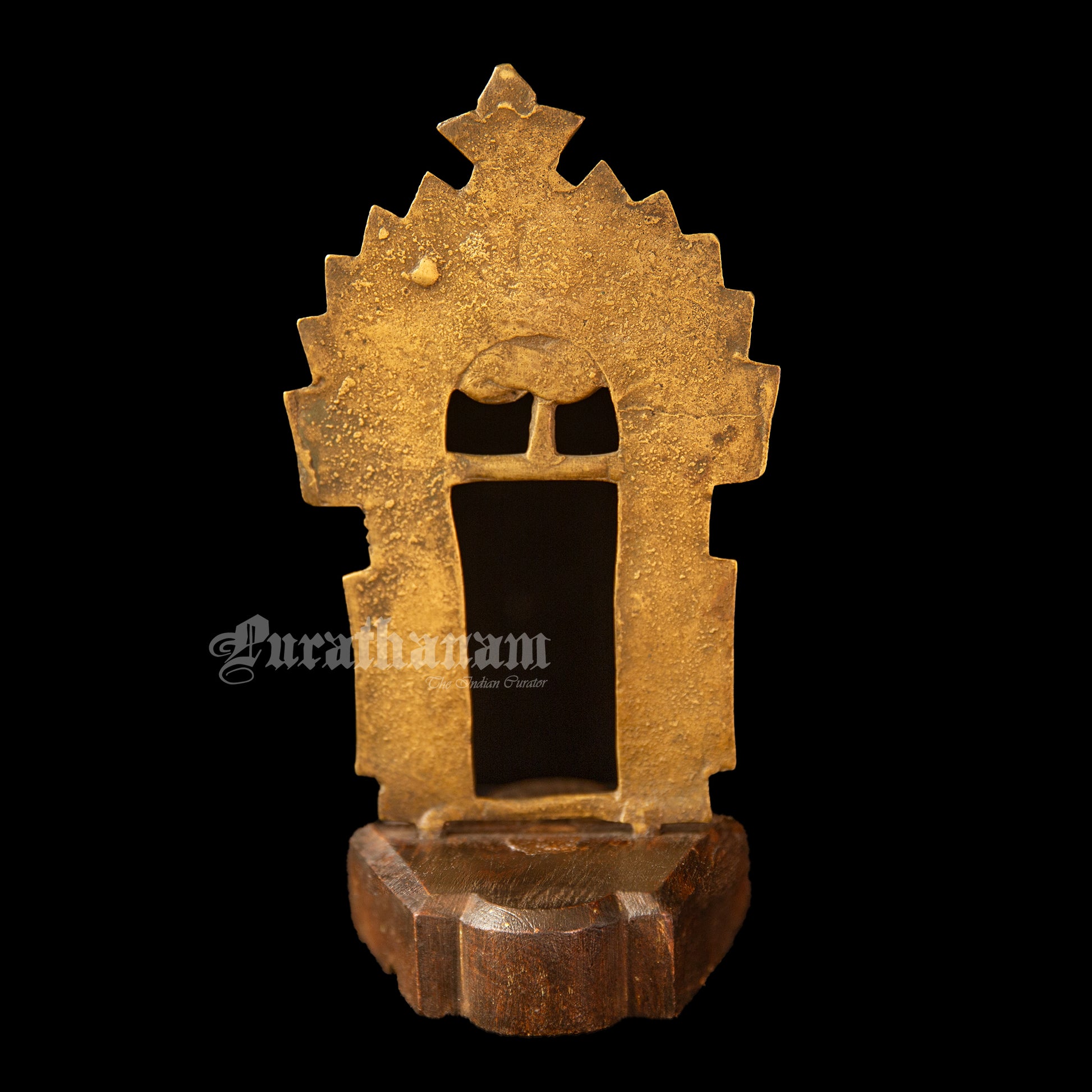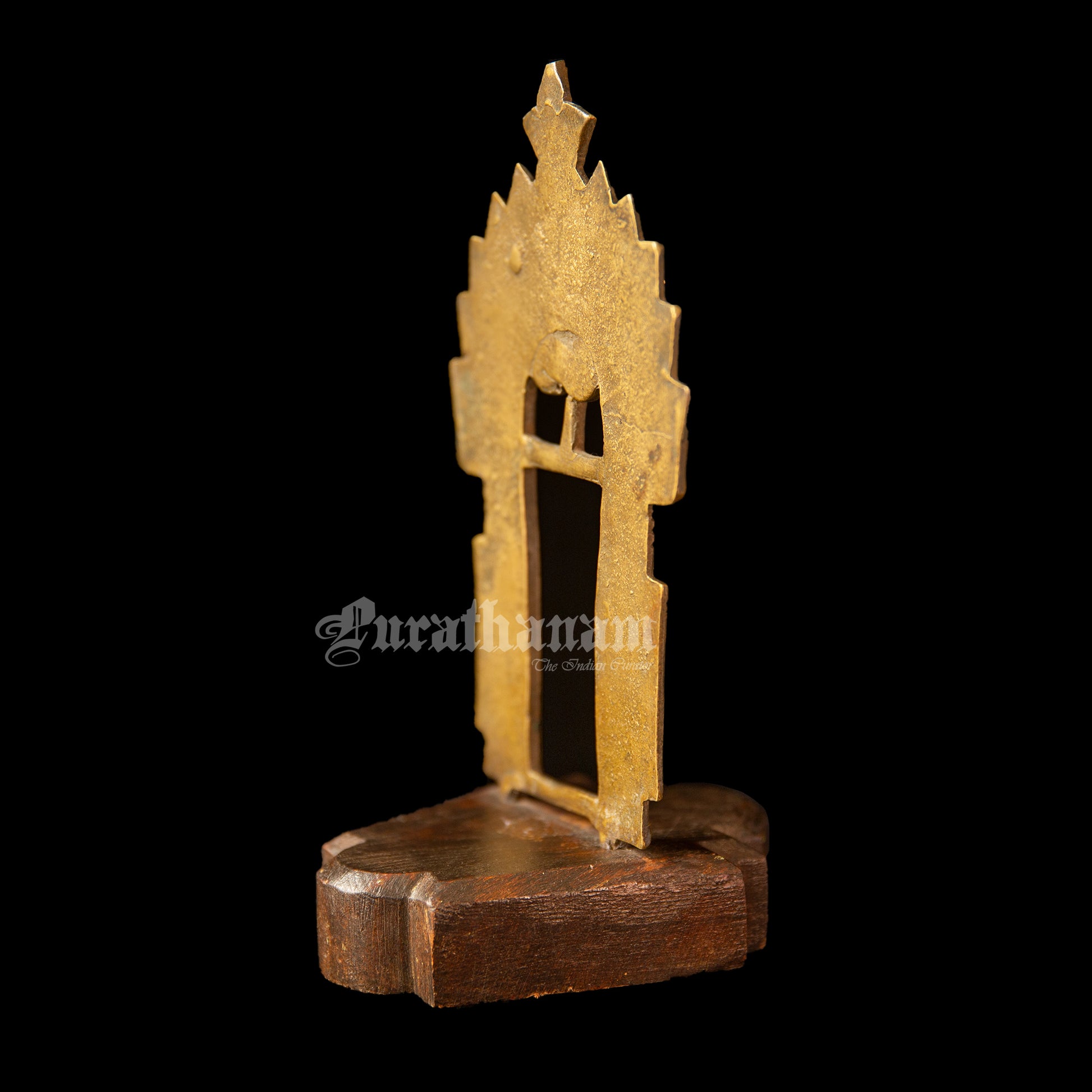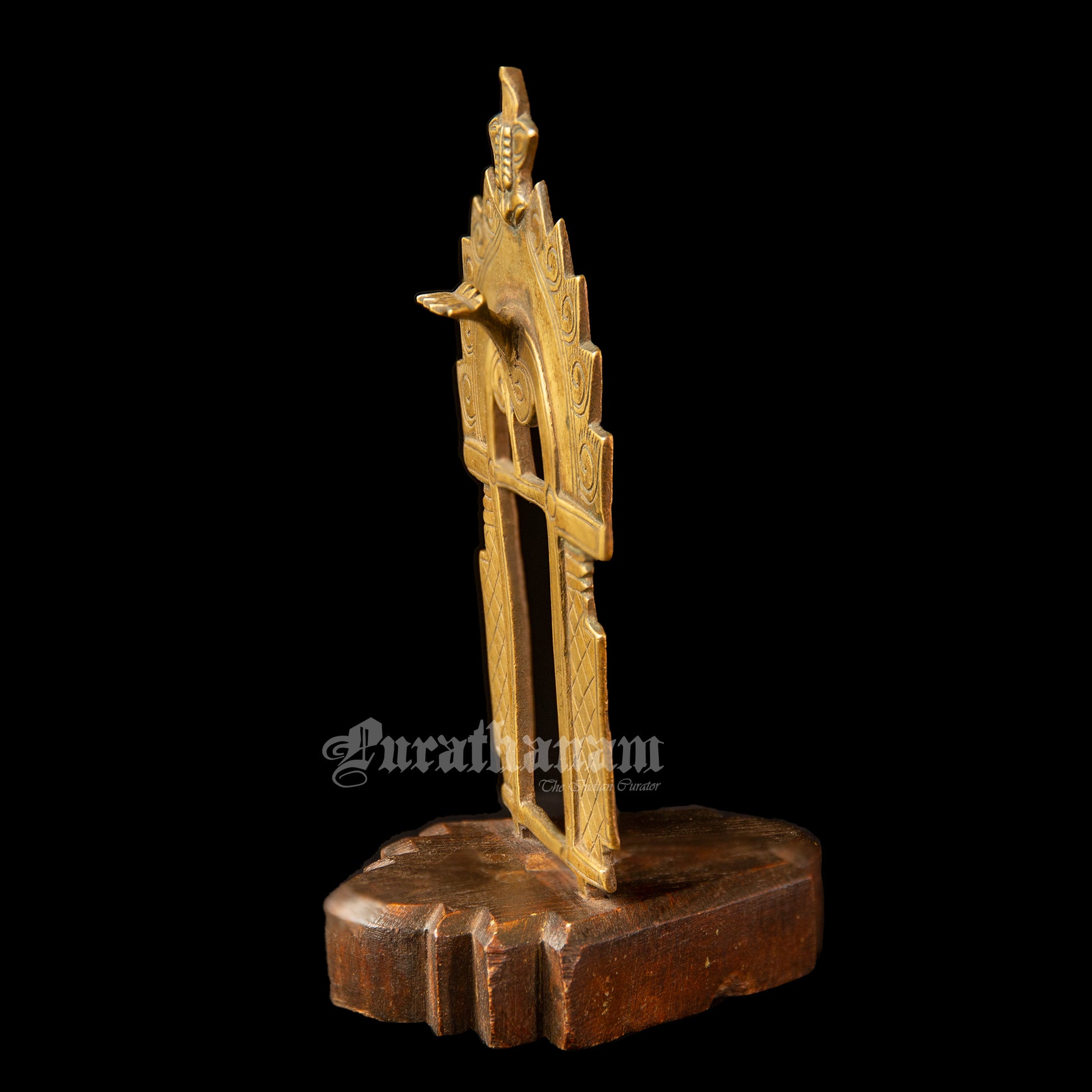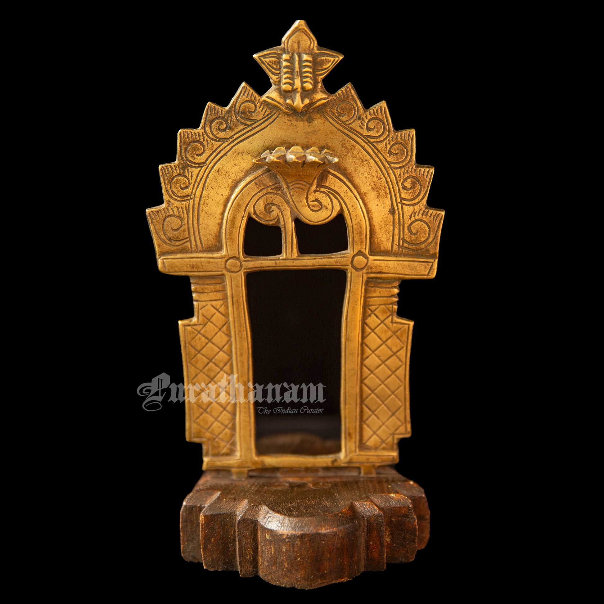 Here we have a small vintage brass Prabhavali which has a five headed Snake right bellow the Keerthimukha. Its protruding five heads stands out from any angle. It is accompanied by a wooden base, further enhancing its presentation.