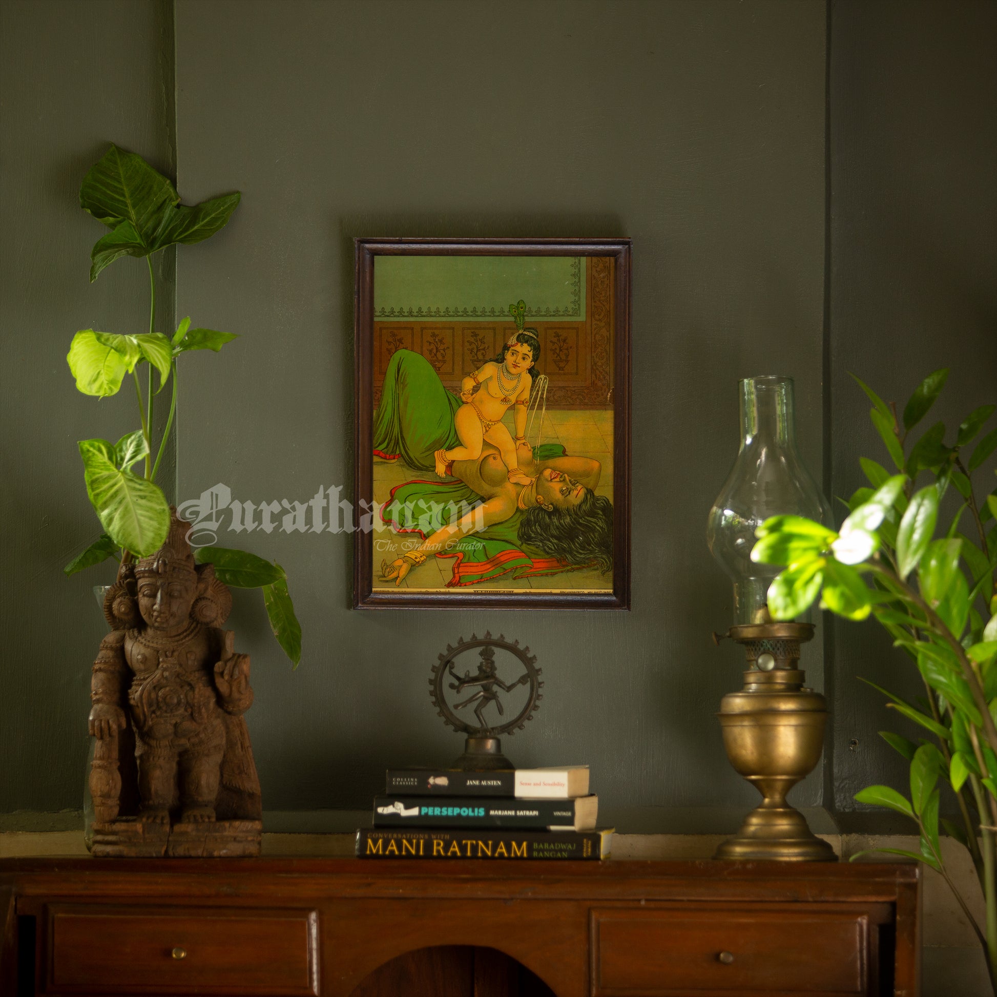 This is an oleograph print from 1920s of Putana paap haran by Ravi Varma an Indian who achieved recognition for his depiction of scenes from the epics of the Mahabharata and Ramayana.