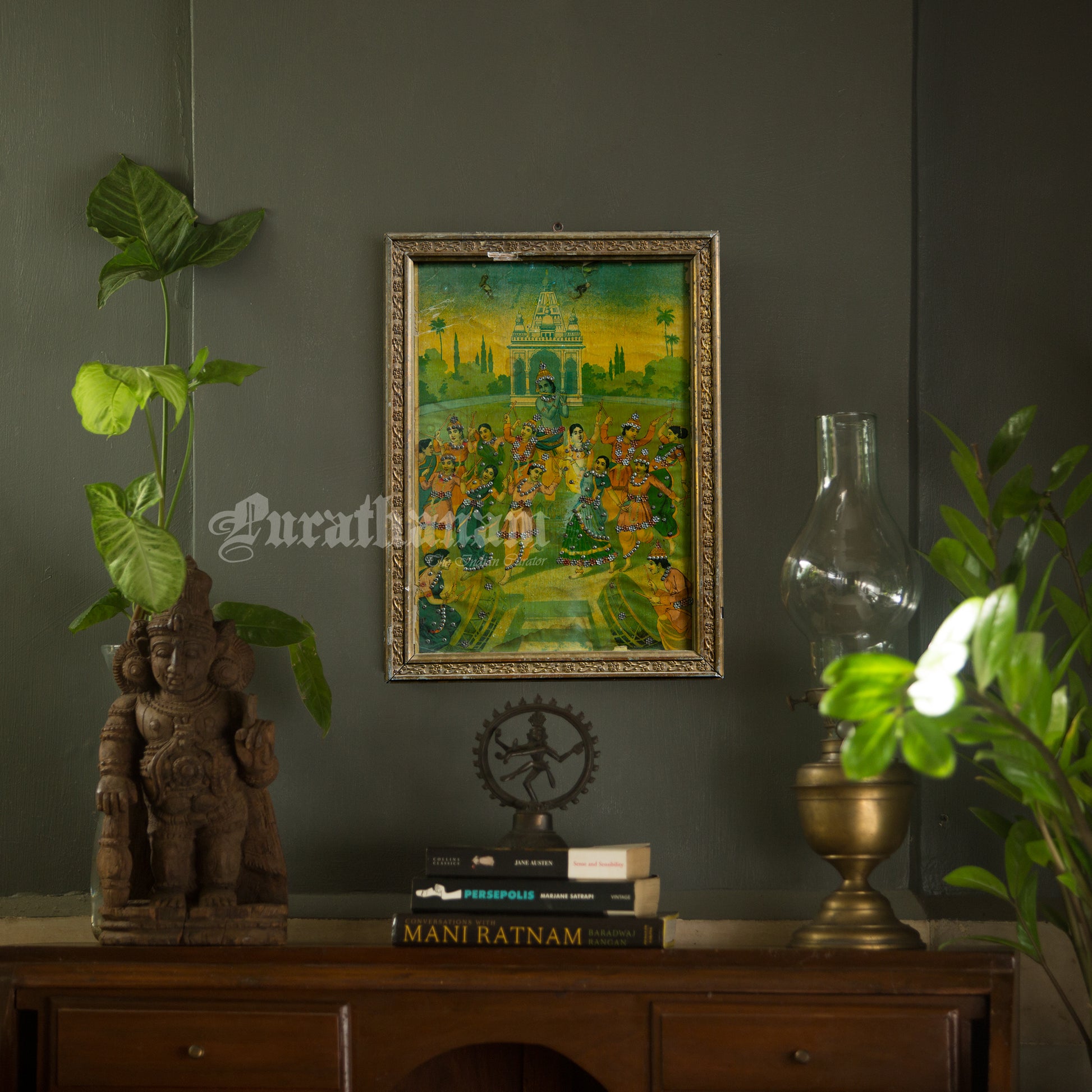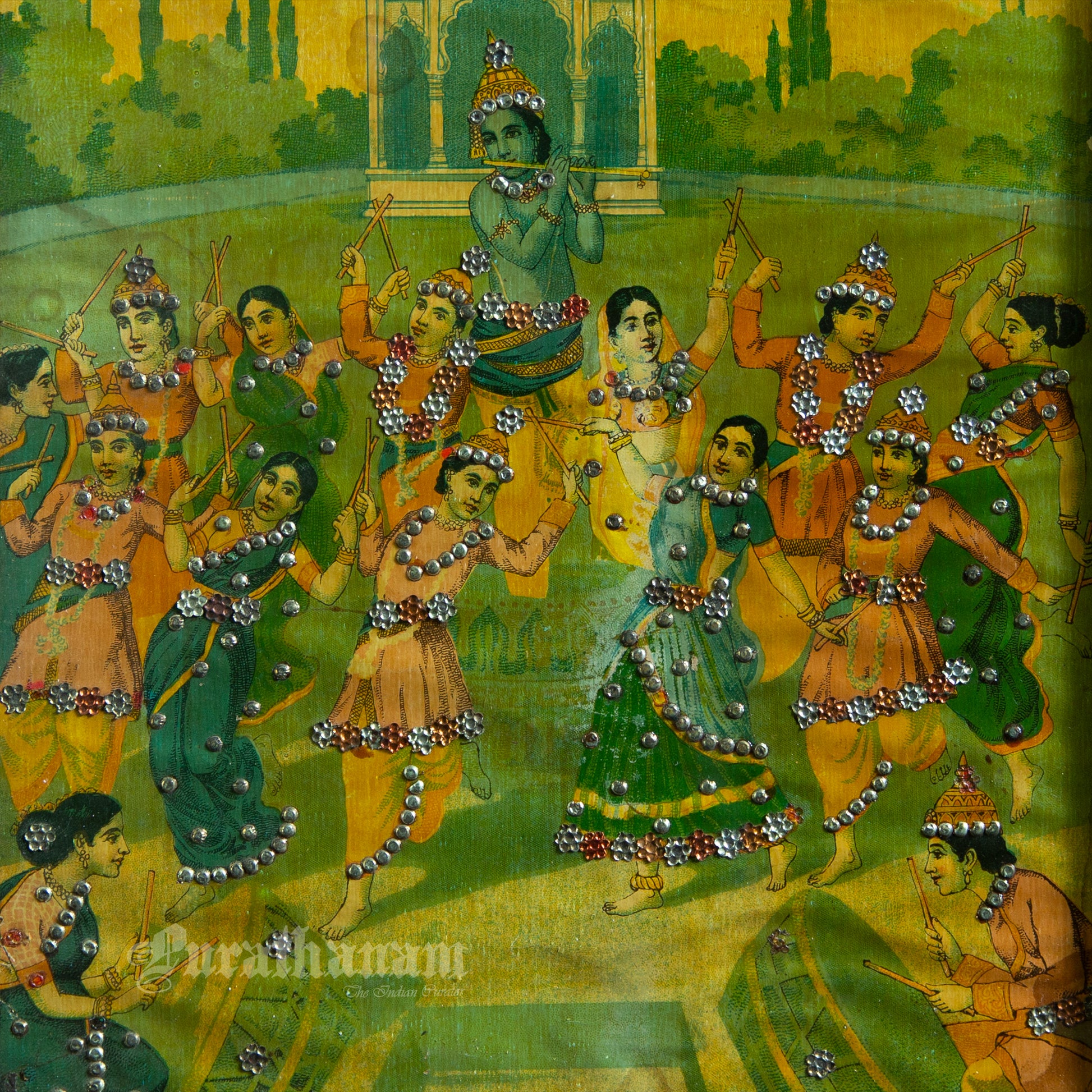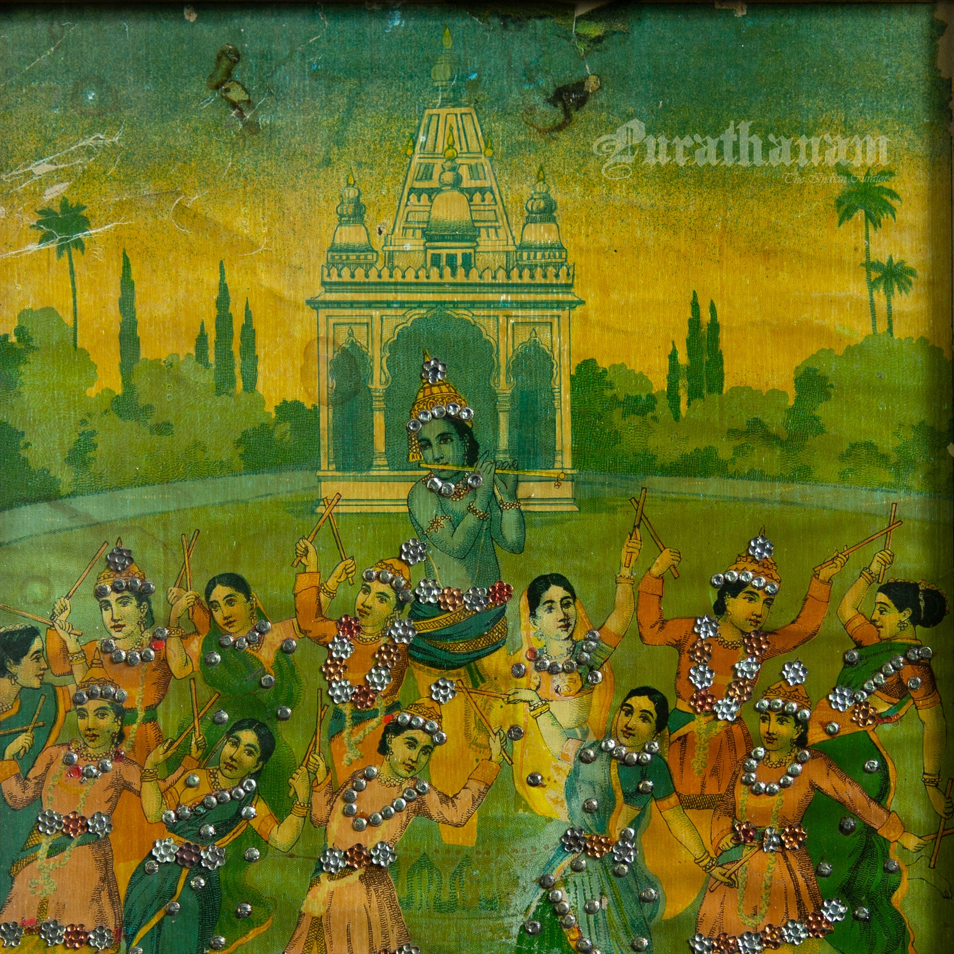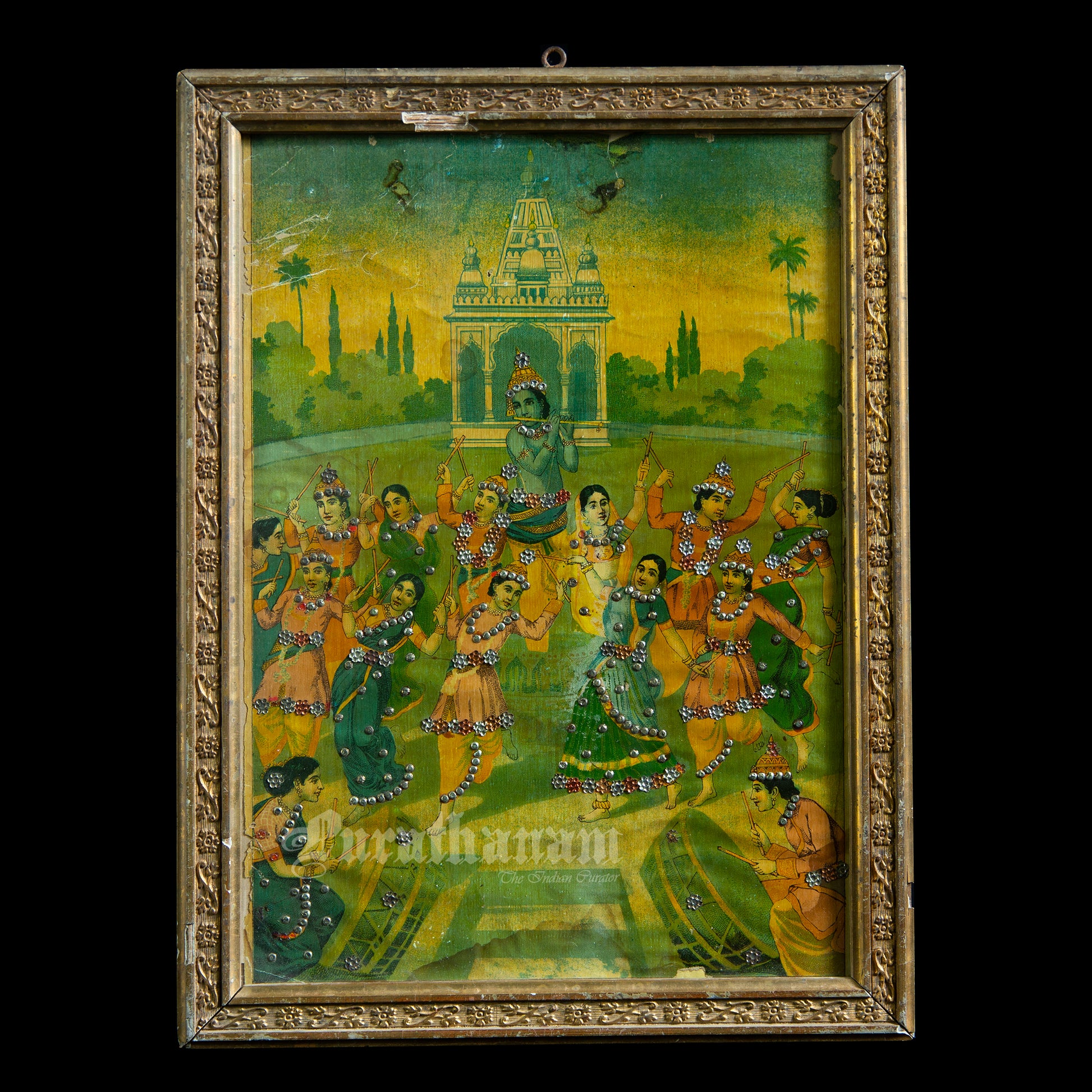 This is an oleograph print from 1920s of Raaskreeda by Ravi Varma an Indian who achieved recognition for his depiction of scenes from the epics of the Mahabharata and Ramayana.