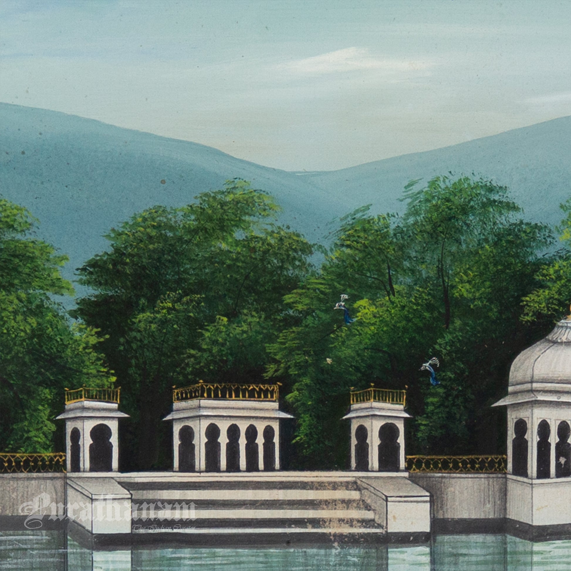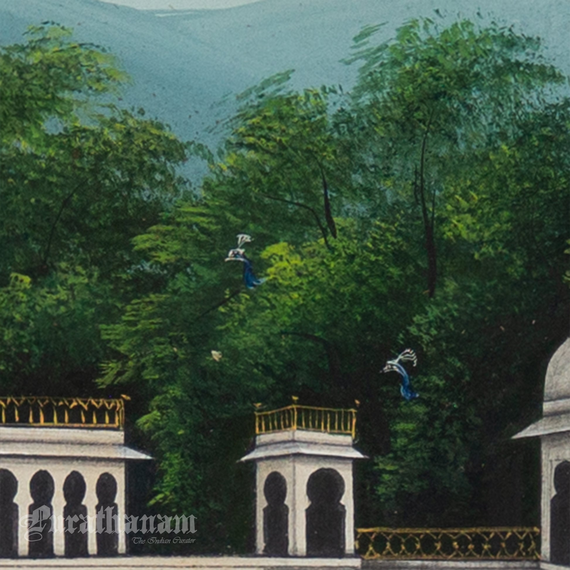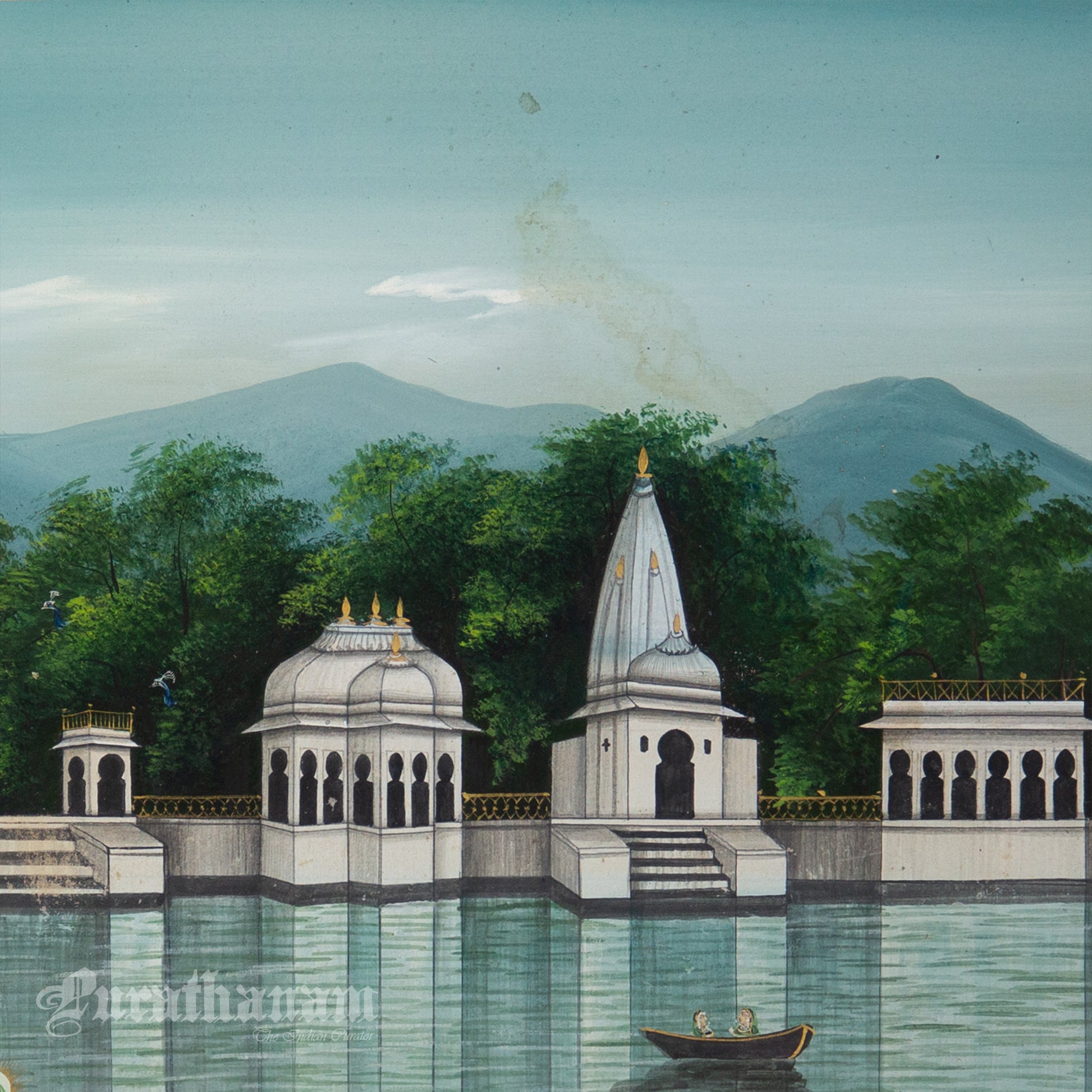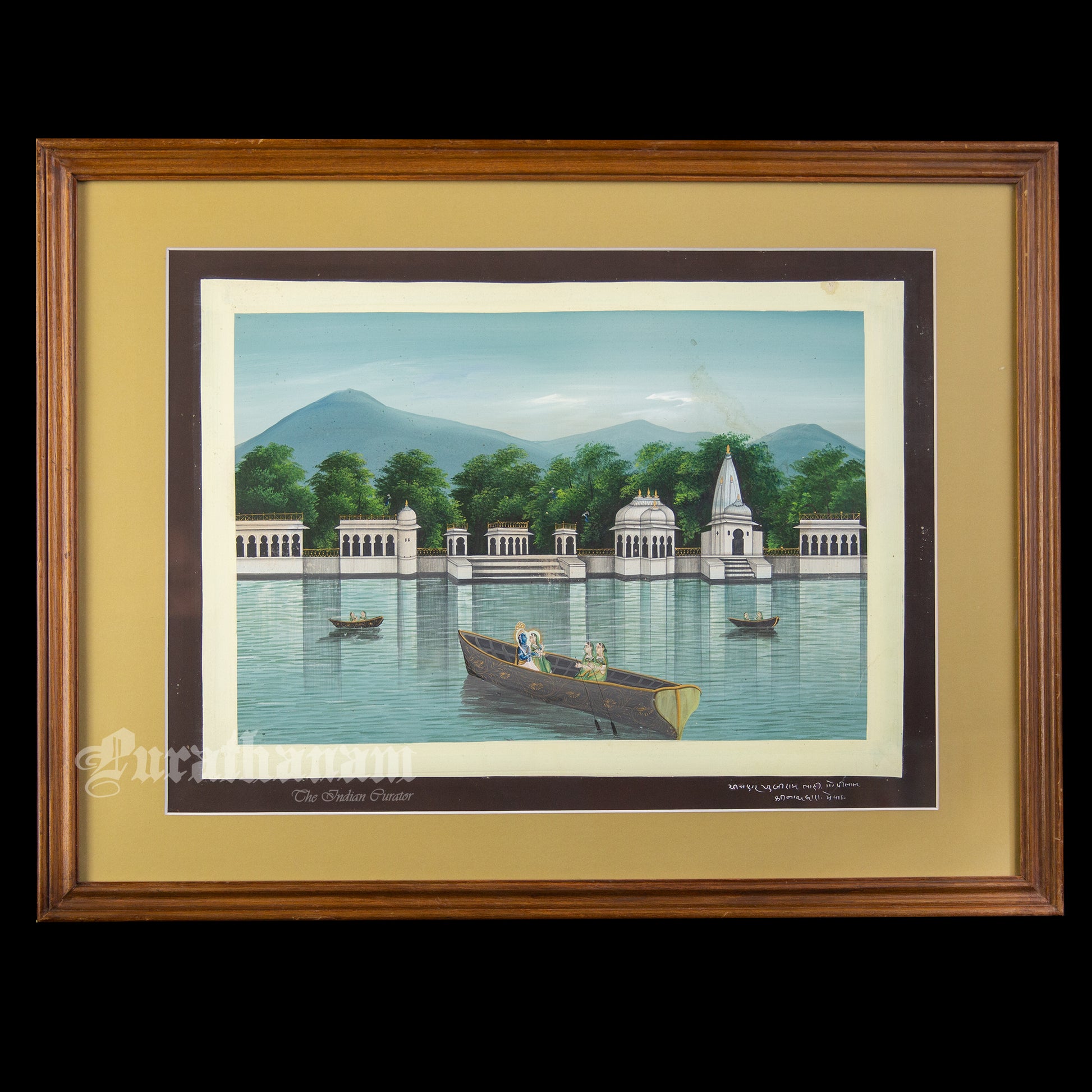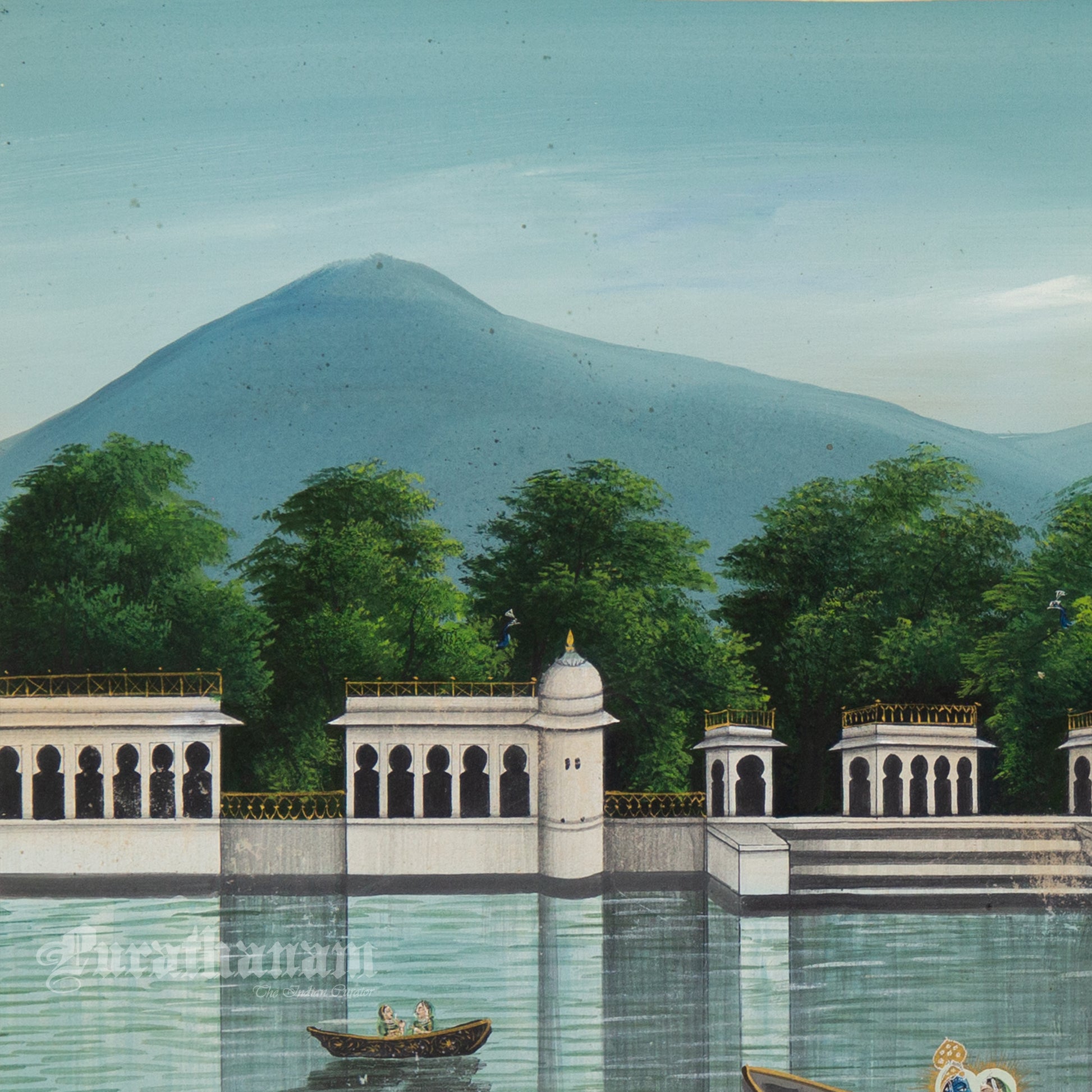 Their style blended realism with traditional Nathdwara aesthetics, creating masterpieces on handmade paper or canvas using watercolor or gouache. This stunning painting, “Radha Krishna - Nauka Vihar (Boat ride),” is one fine example of their watercolor technique on handmade paper.
