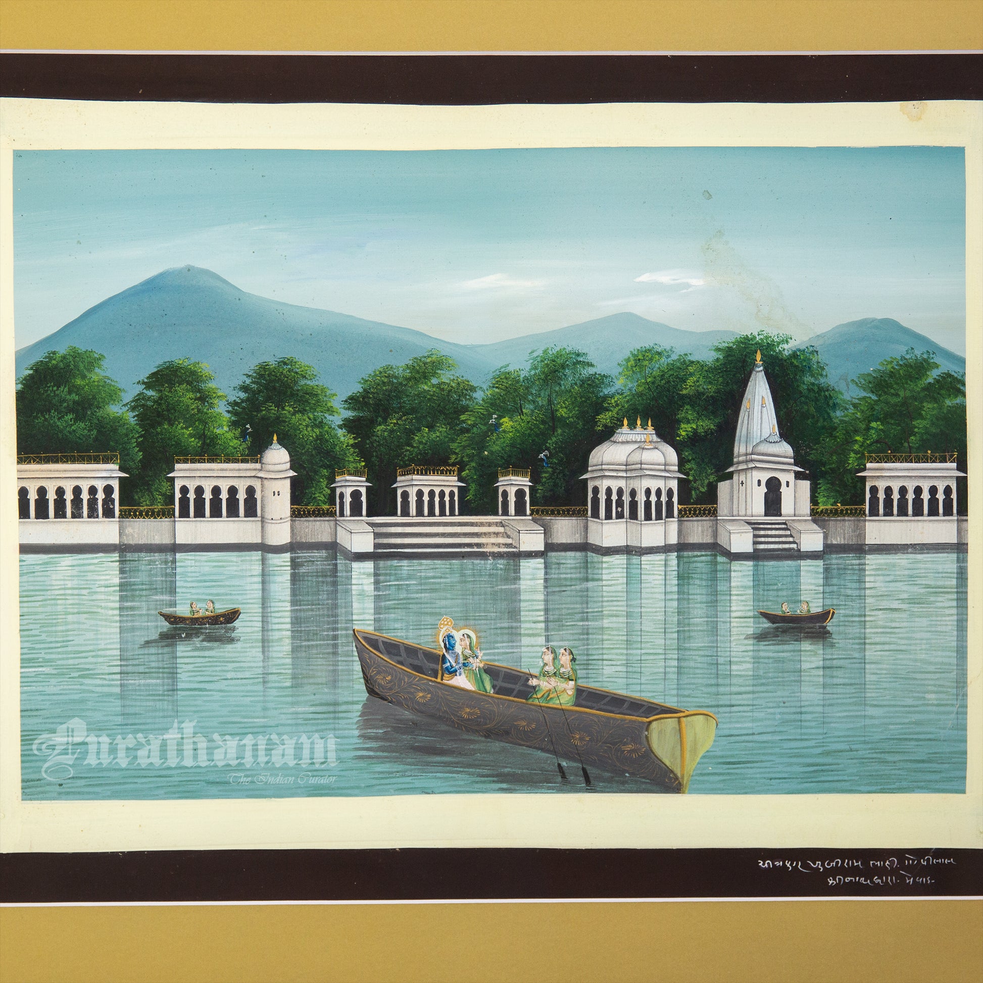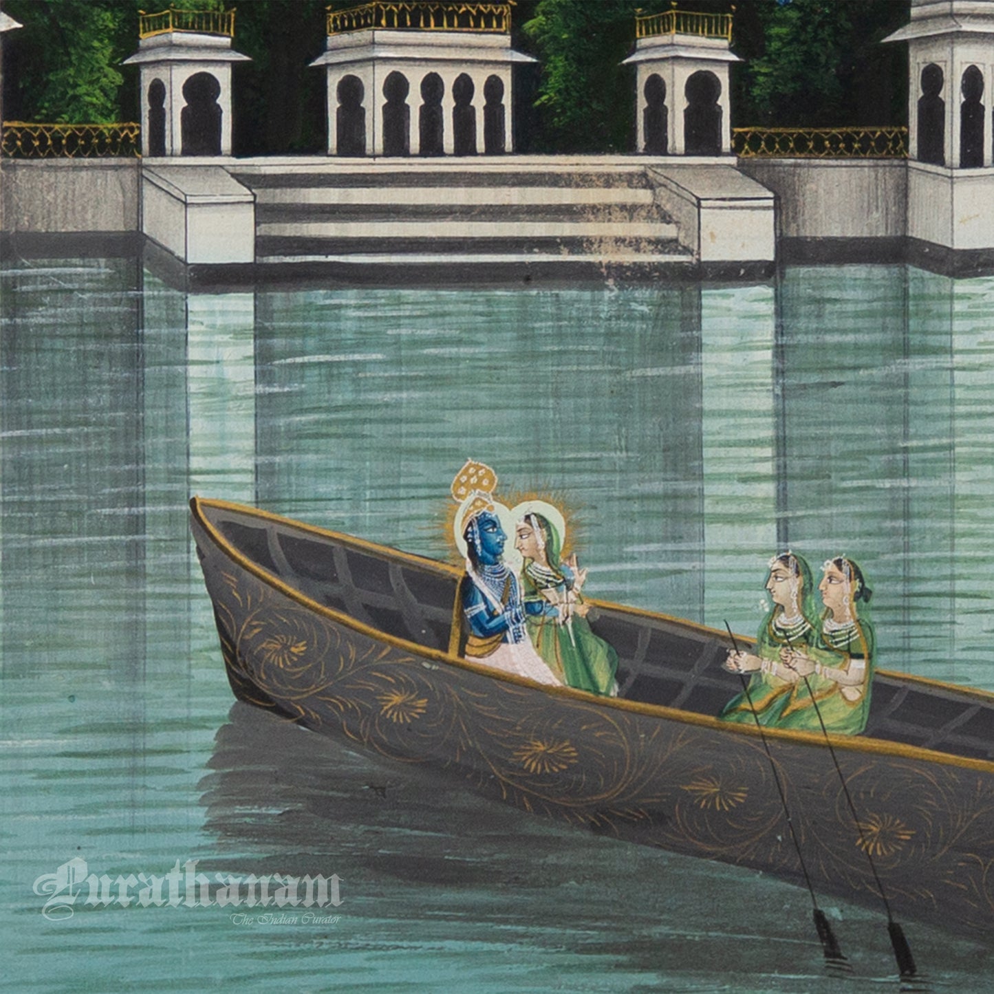 Here we present a real antique, original Water Color painting of “Radha Krishna - Nauka Vihar (Boat ride)” by Khubiram Gopilal from the early 1900s. Khubiram and Gopilal were prominent early 20th-century artists from Nathdwara, Rajasthan, home to the Shrinathji Temple, dedicated to Krishna in his child-god form