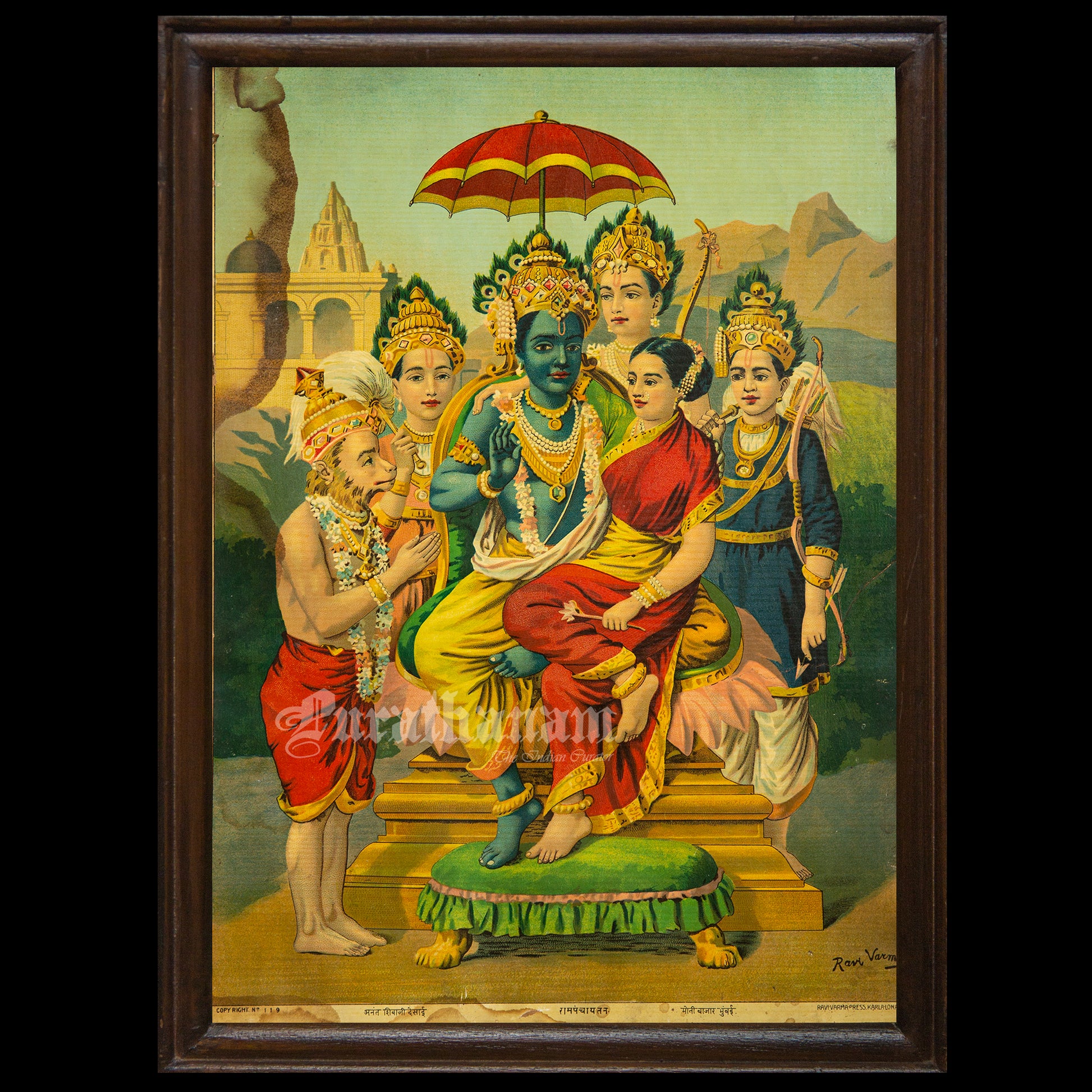 This is an oleograph print from 1920s of Ram Panchayat by Ravi Varma an Indian who achieved recognition for his depiction of scenes from the epics of the Mahabharata and Ramayana.