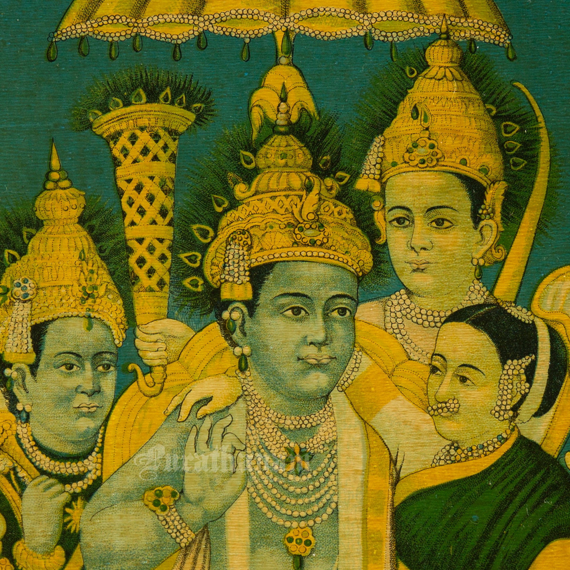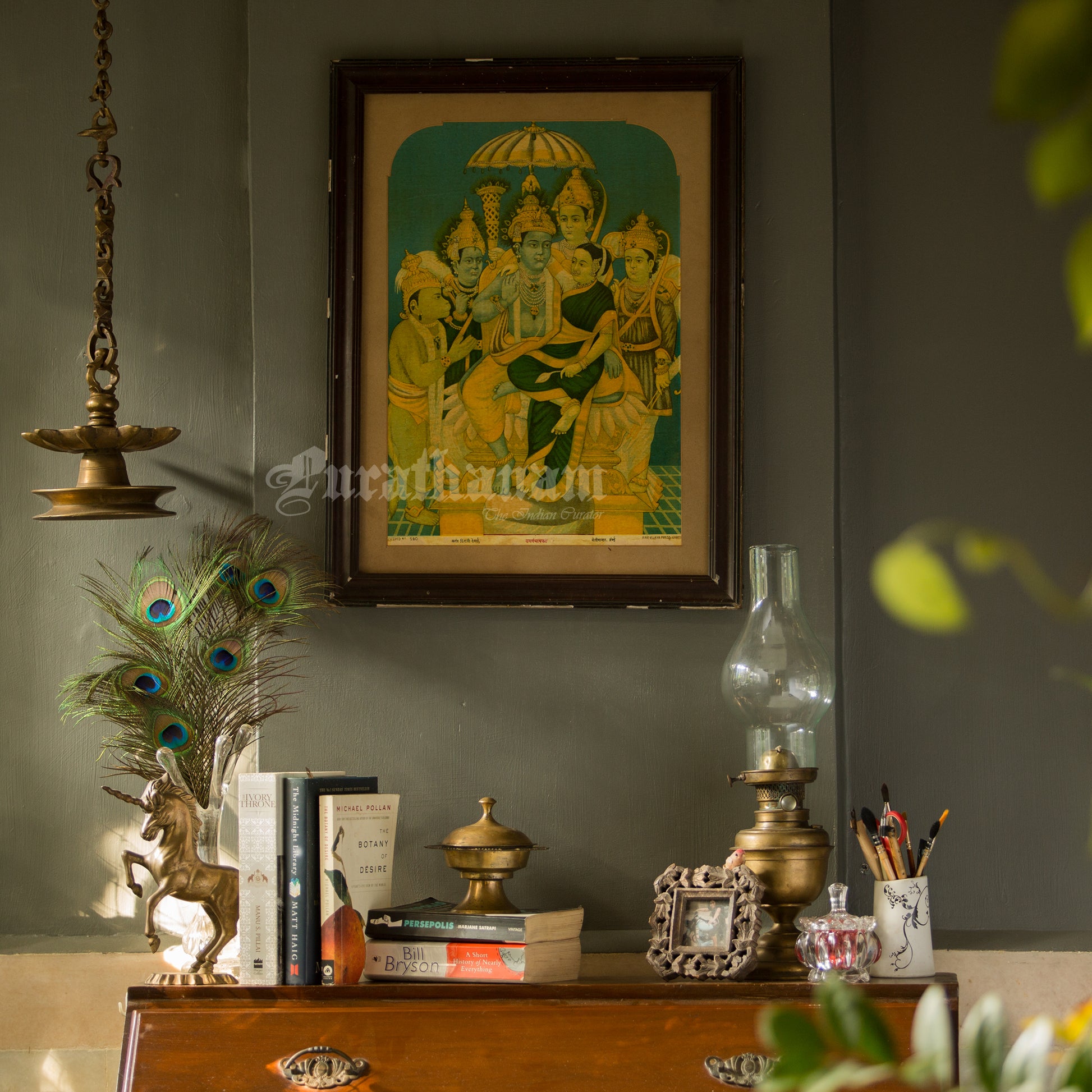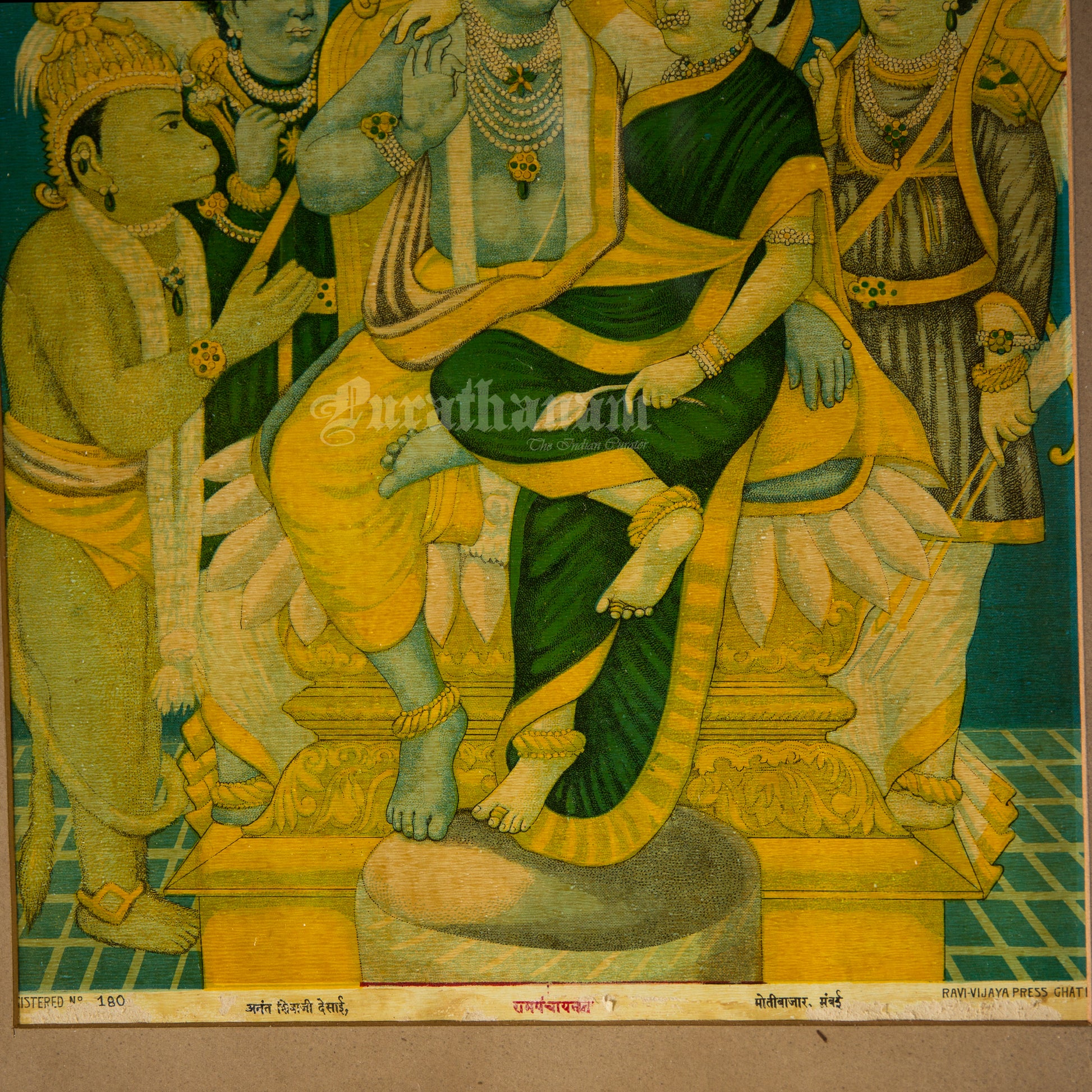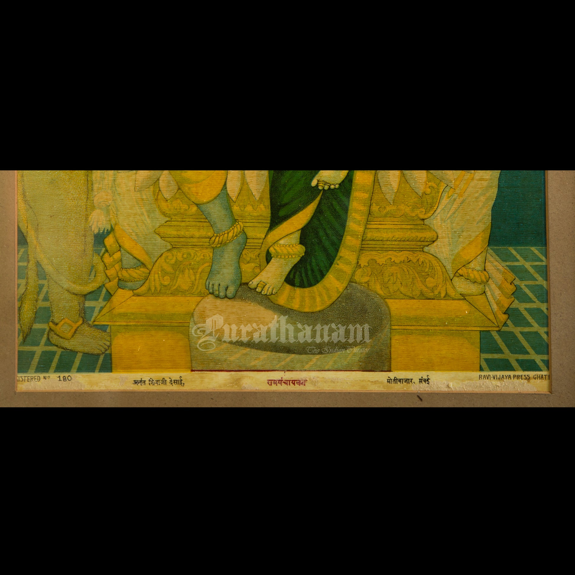 This is an oleograph print from 1920s- 1930s of Ram Panchayat by Ravi Varma an Indian painter who achieved recognition for his depiction of scenes from the epics of the Mahabharata and Ramayana.