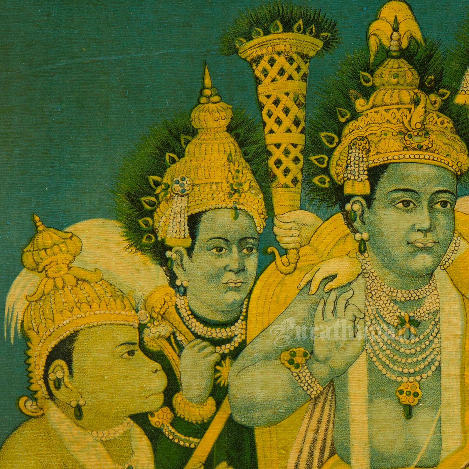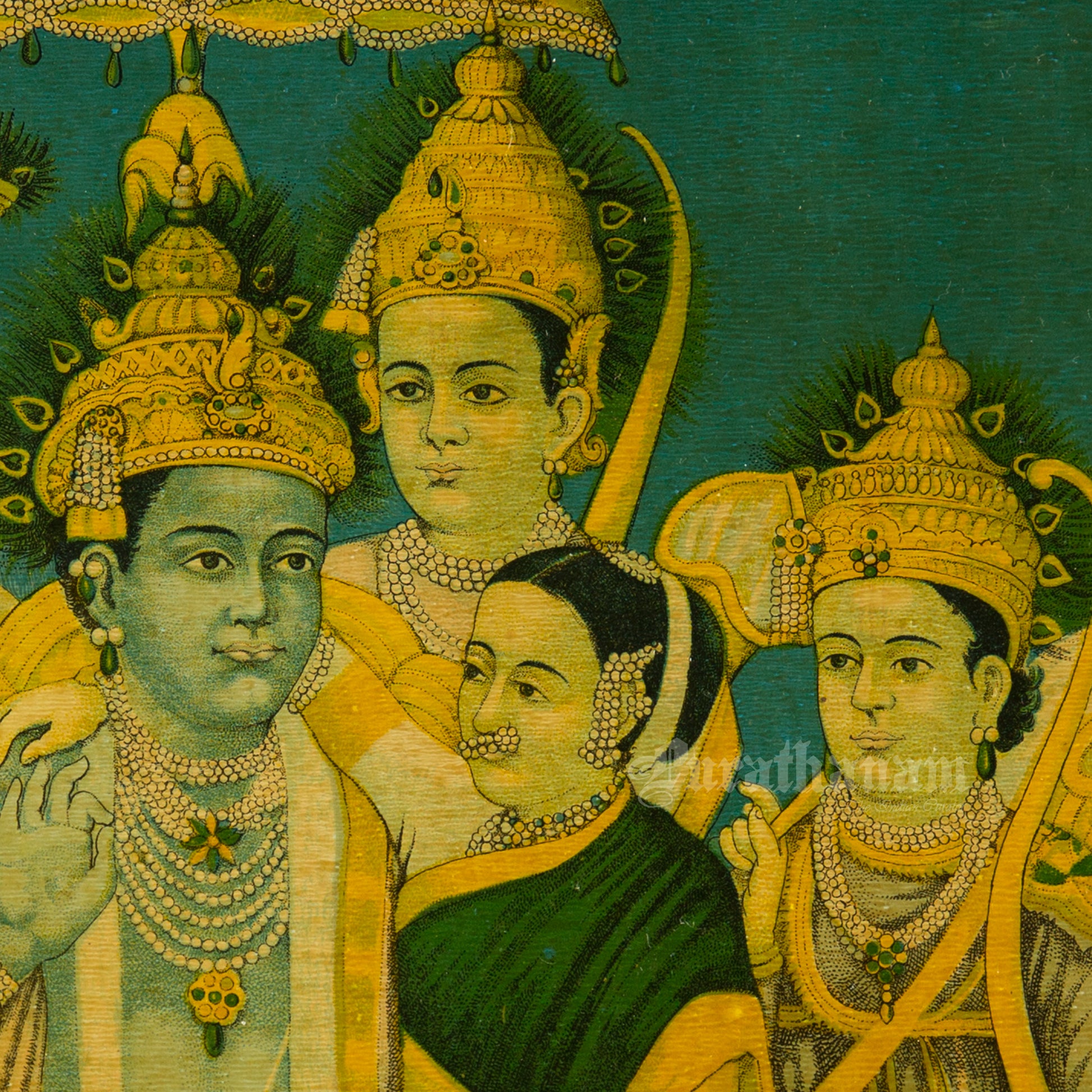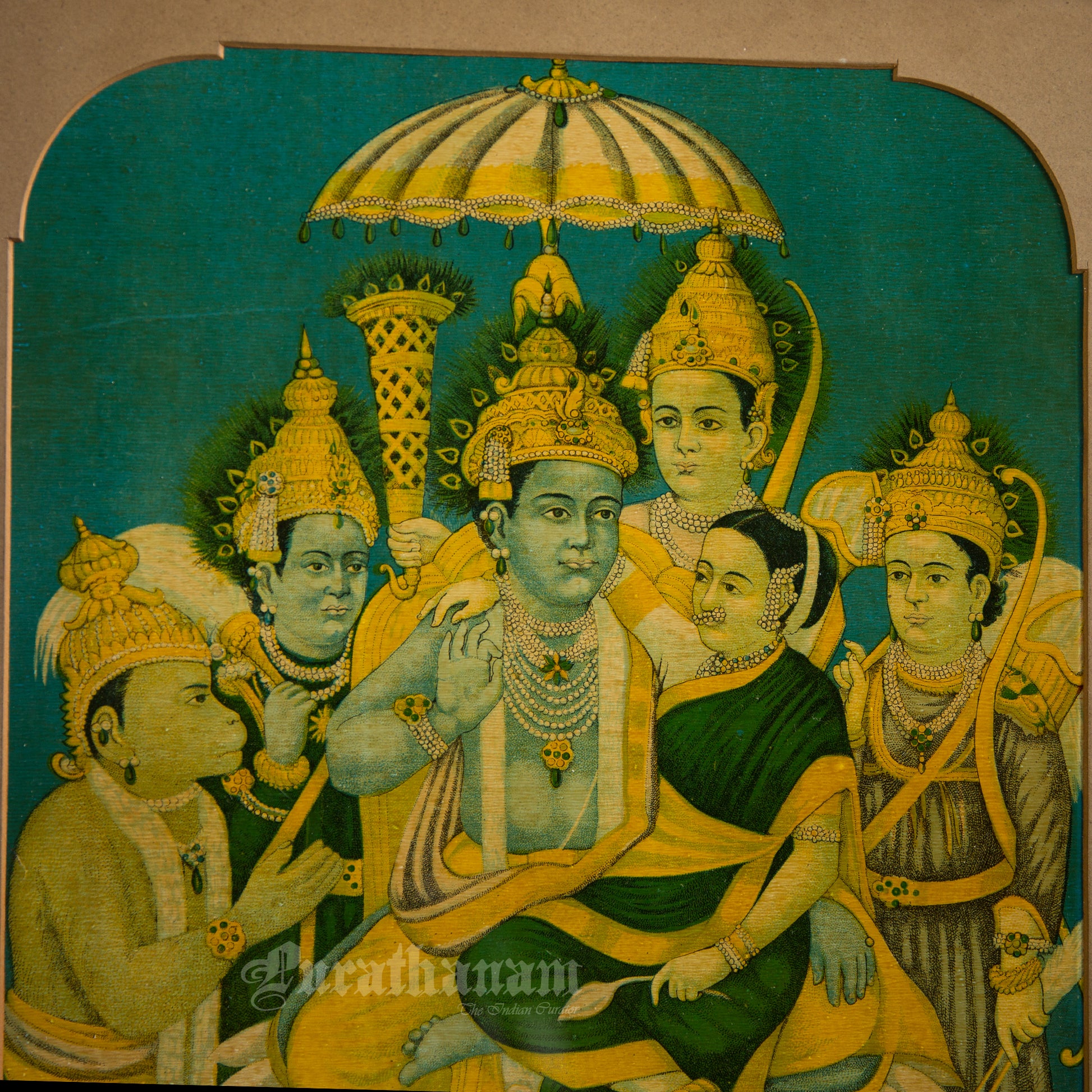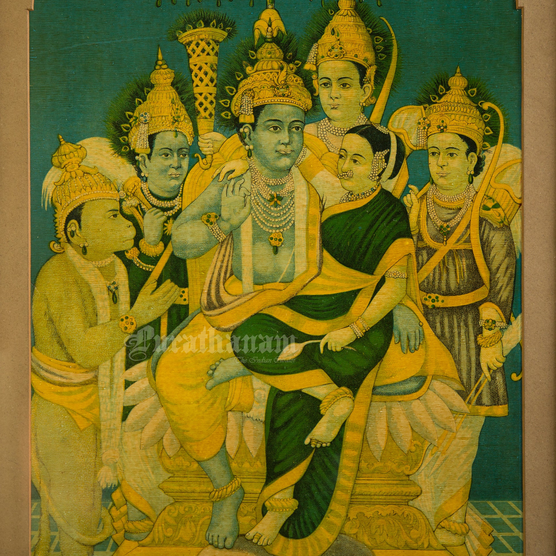 This is an oleograph print from 1920s- 1930s of Ram Panchayat by Ravi Varma an Indian painter who achieved recognition for his depiction of scenes from the epics of the Mahabharata and Ramayana.