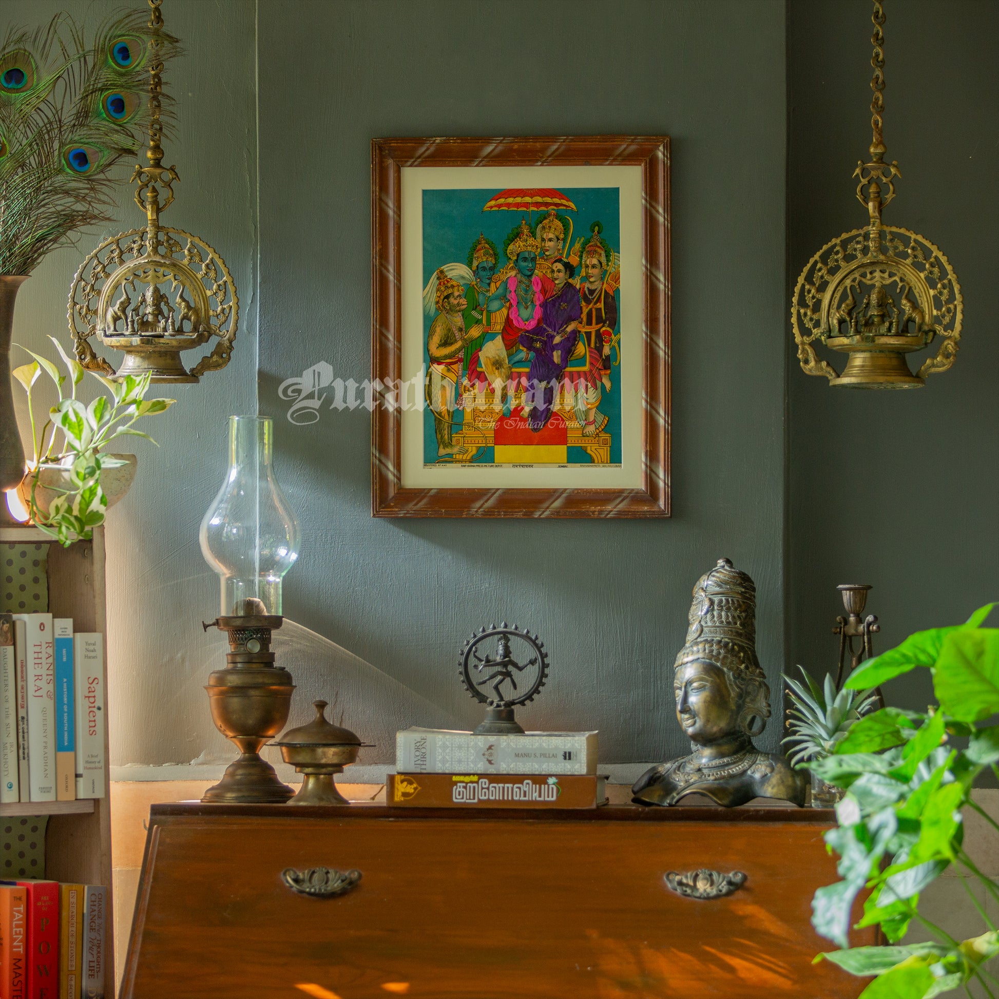 This is an oleograph print from 1920s of Ram Panchayat by Ravi Varma an Indian who achieved recognition for his depiction of scenes from the epics of the Mahabharata and Ramayana.