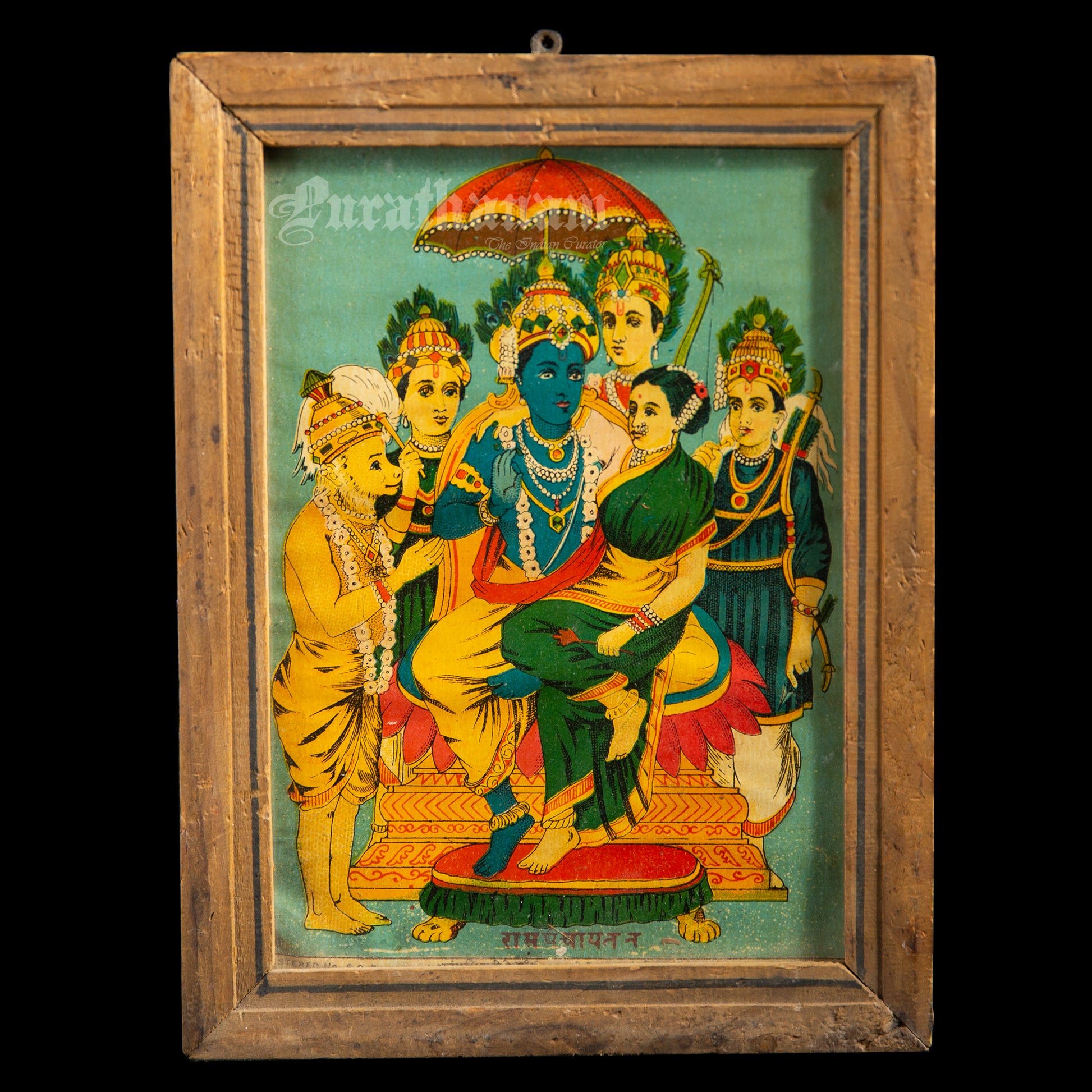 A mini lithograph print from 1920s of Ram Panchayat by Ravi Varma, an Indian who achieved recognition for his depiction of scenes from the epics of the Mahabharata and Ramayana.