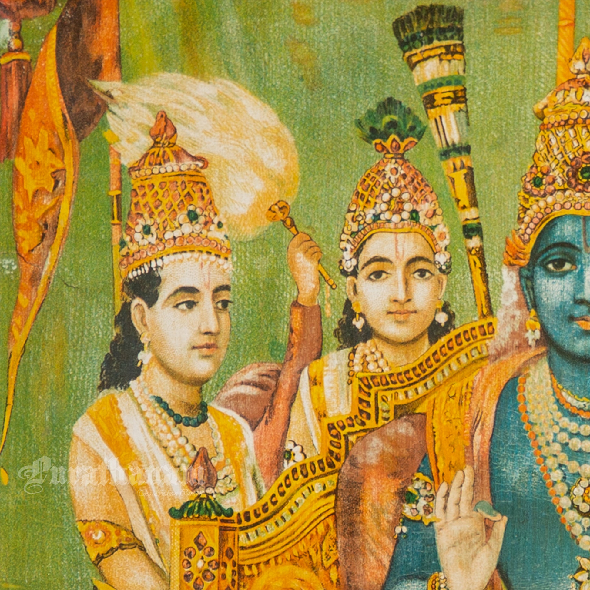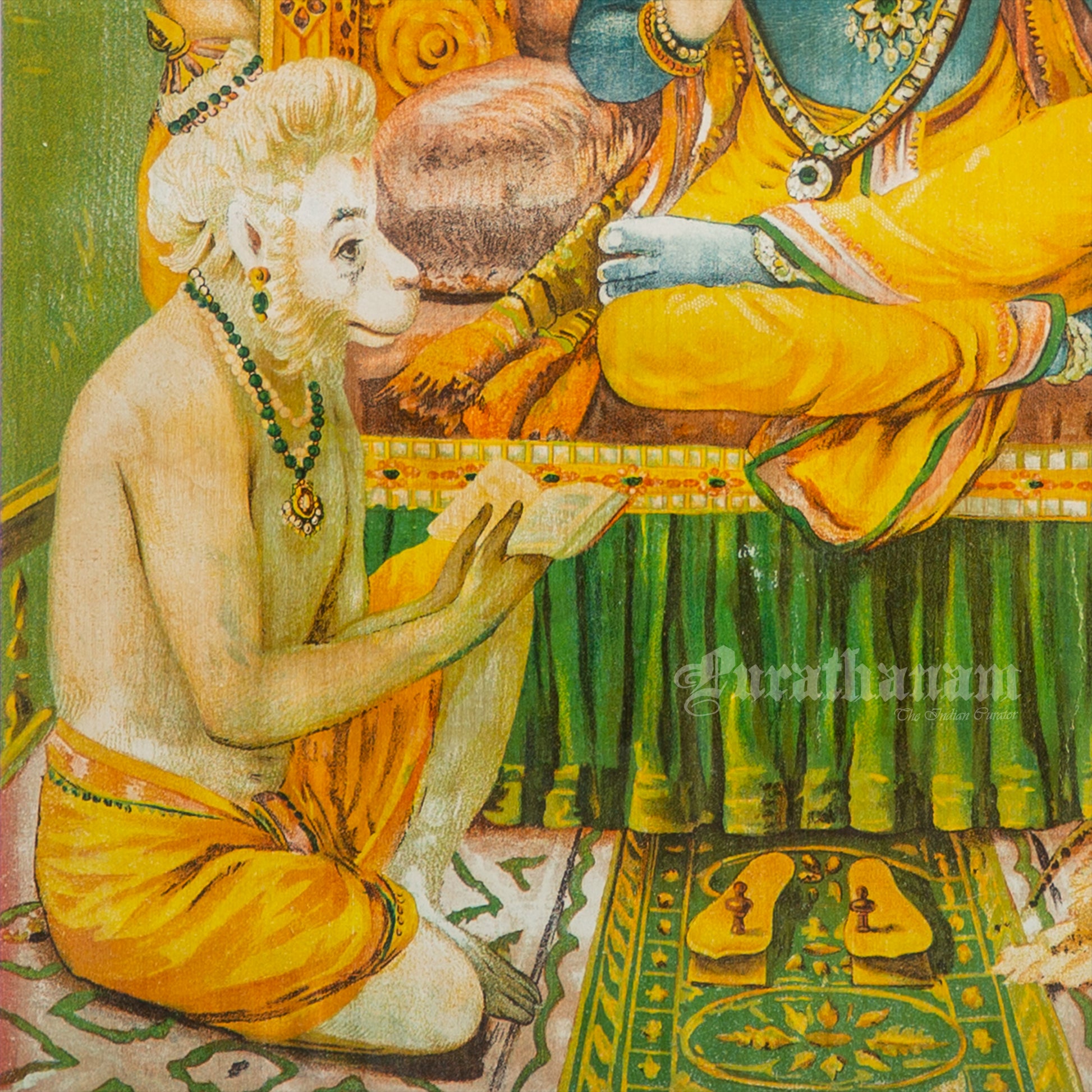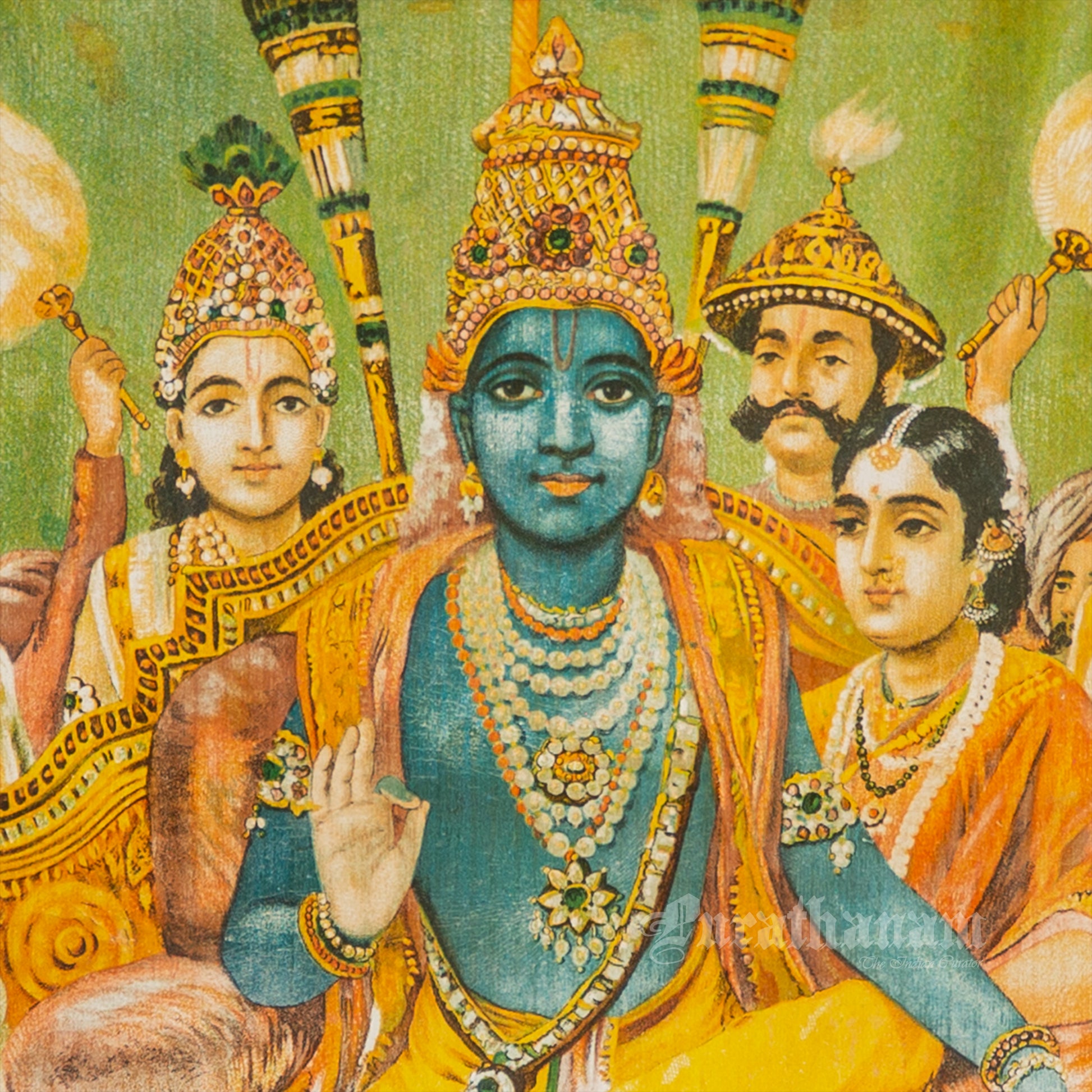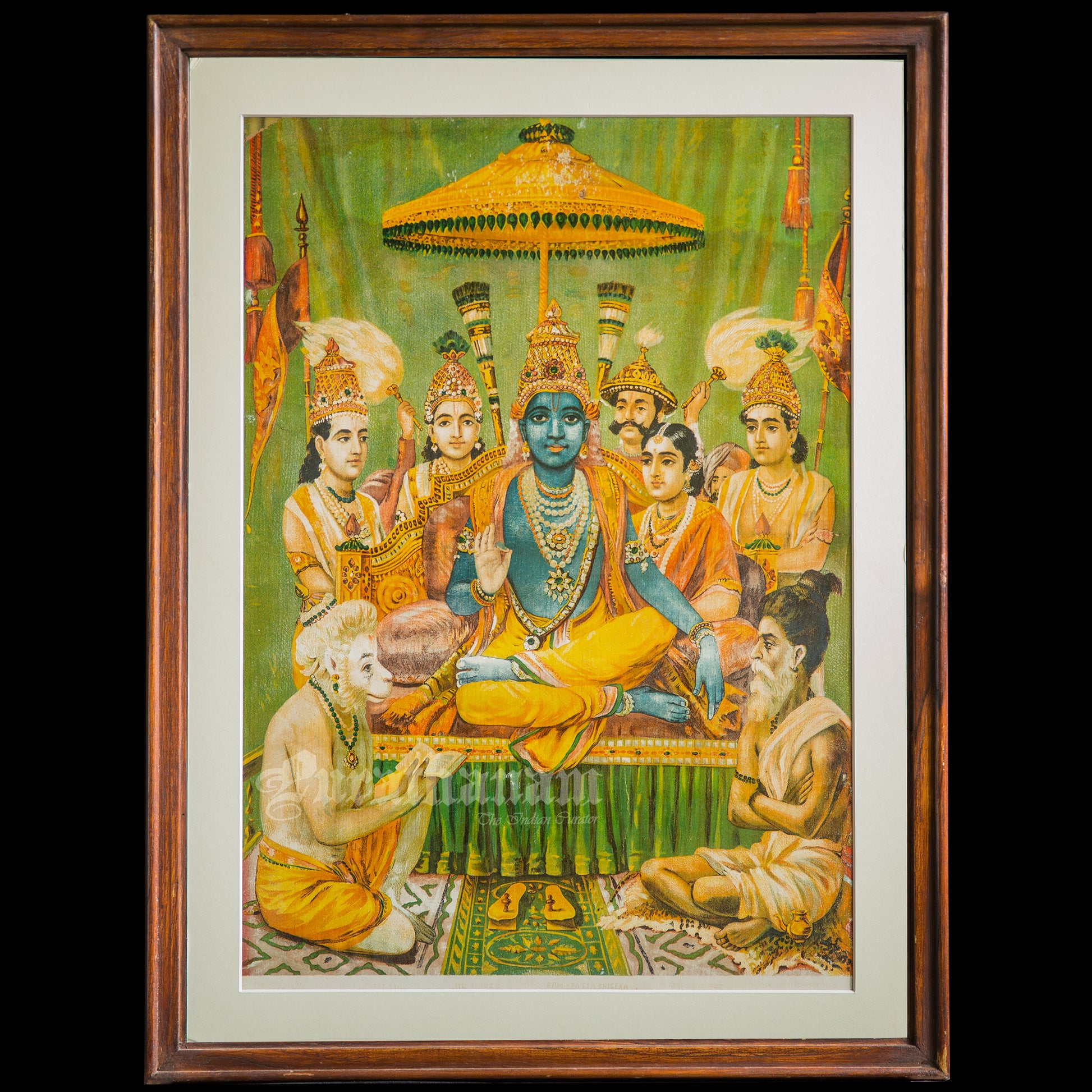 This is an oleograph print from 1920s of Ram Pattabhishekam by Ravi Varma an Indian who achieved recognition for his depiction of scenes from the epics of the Mahabharata and Ramayana.