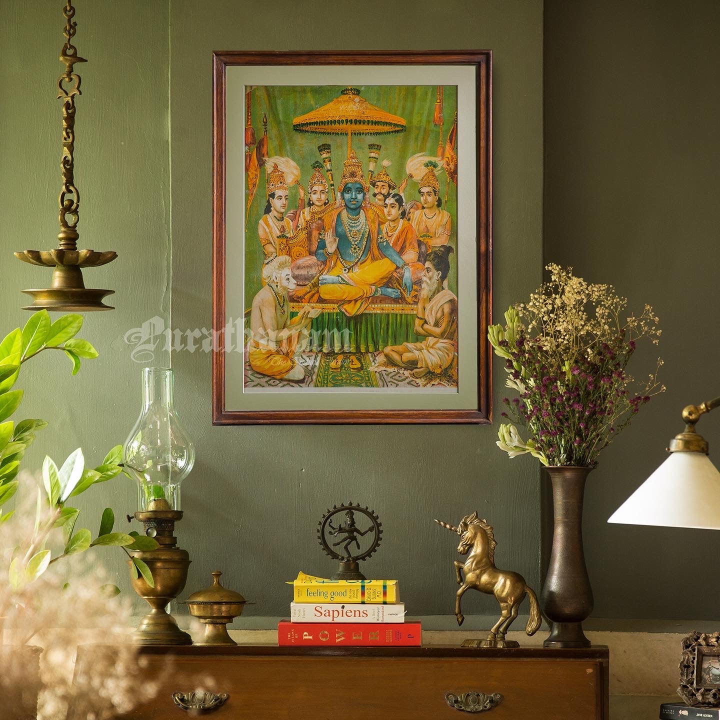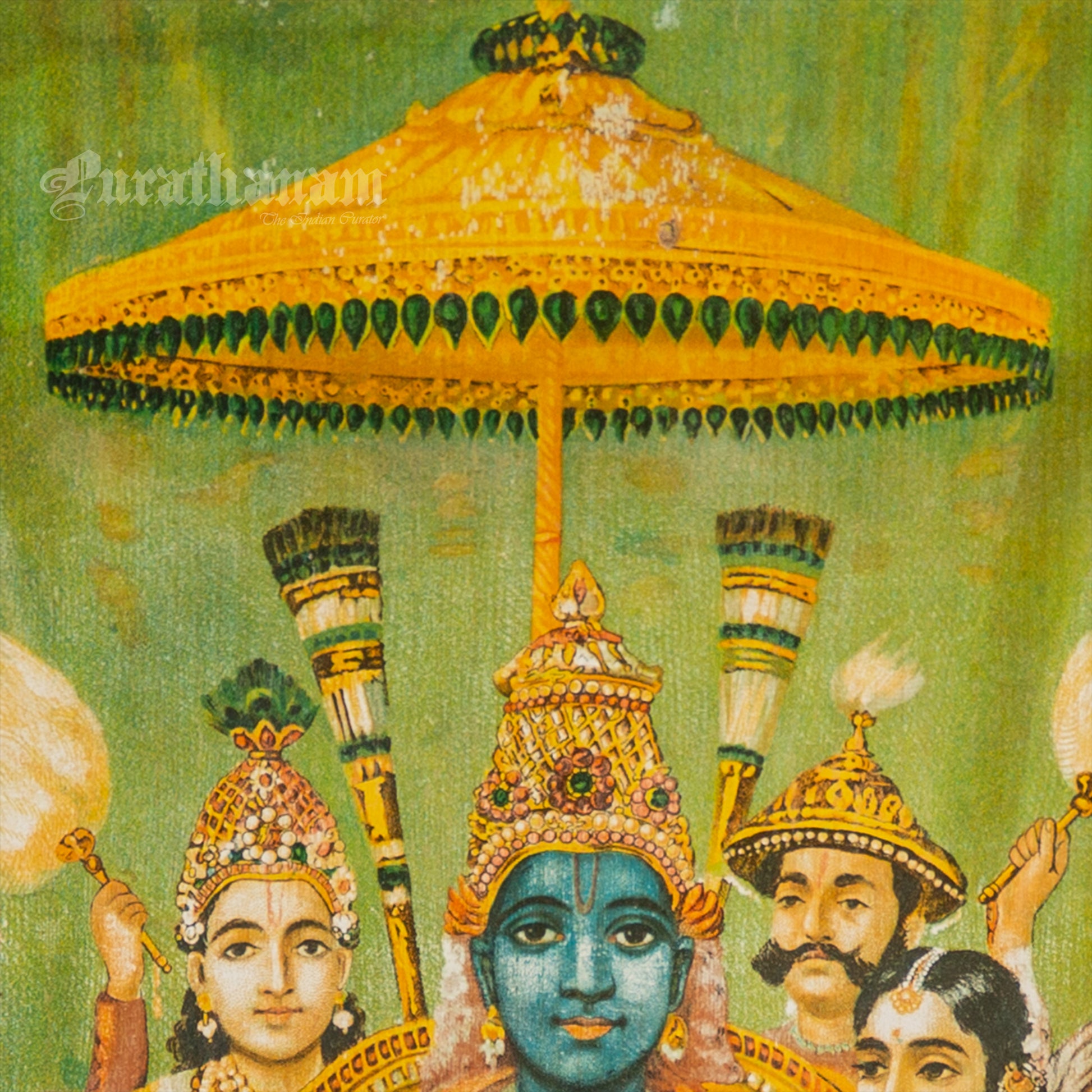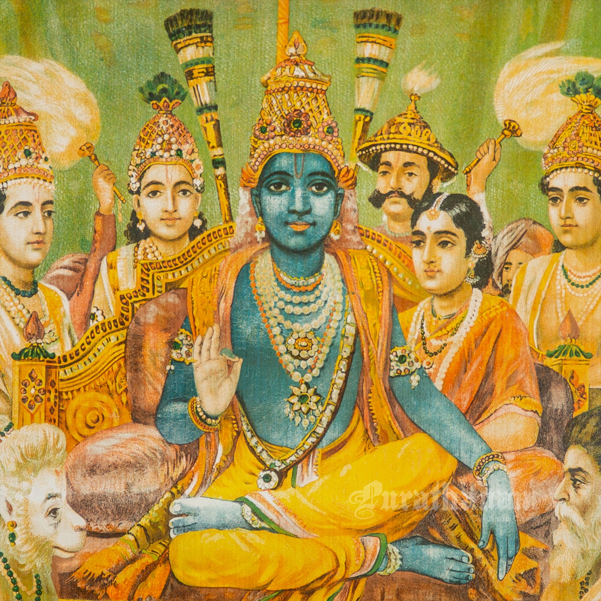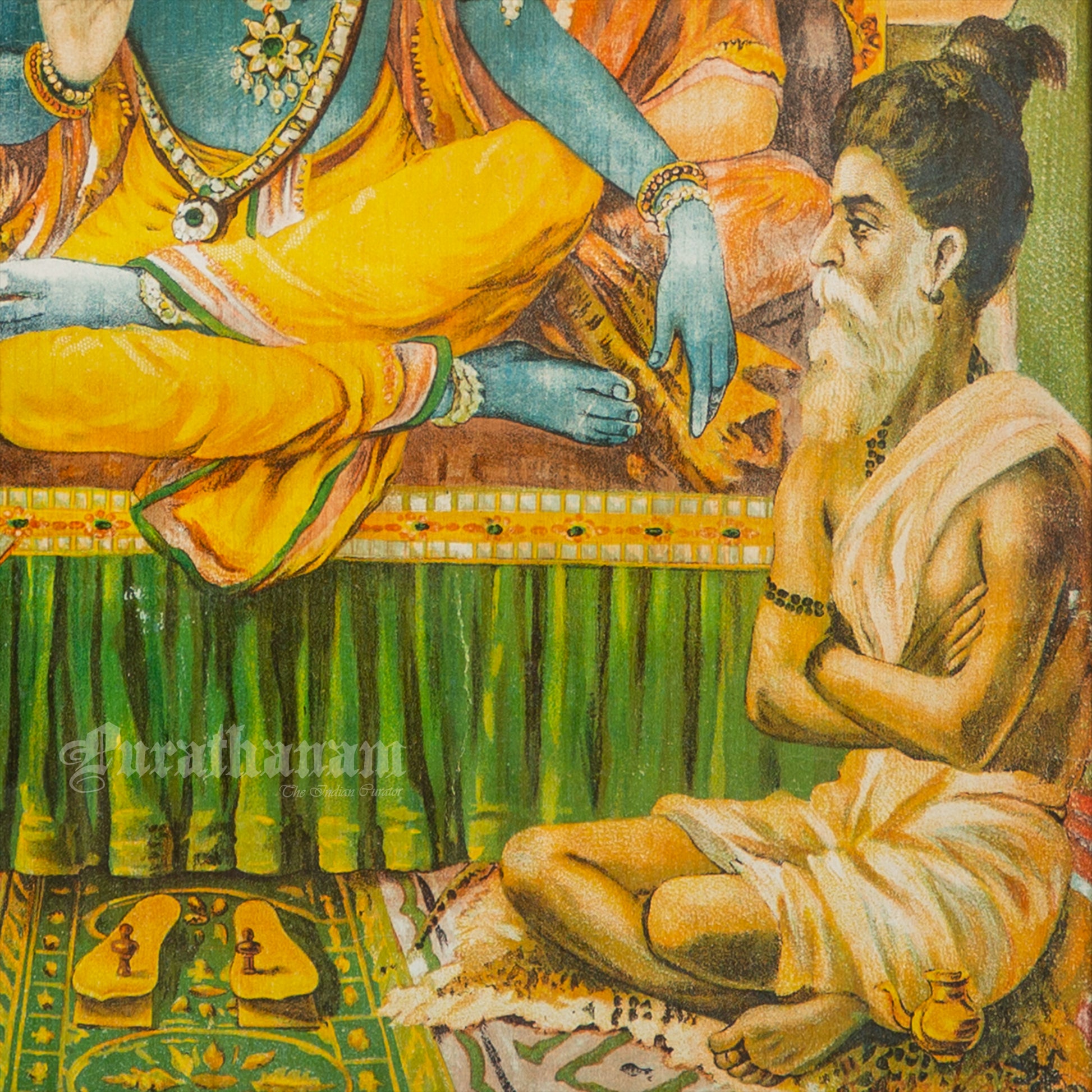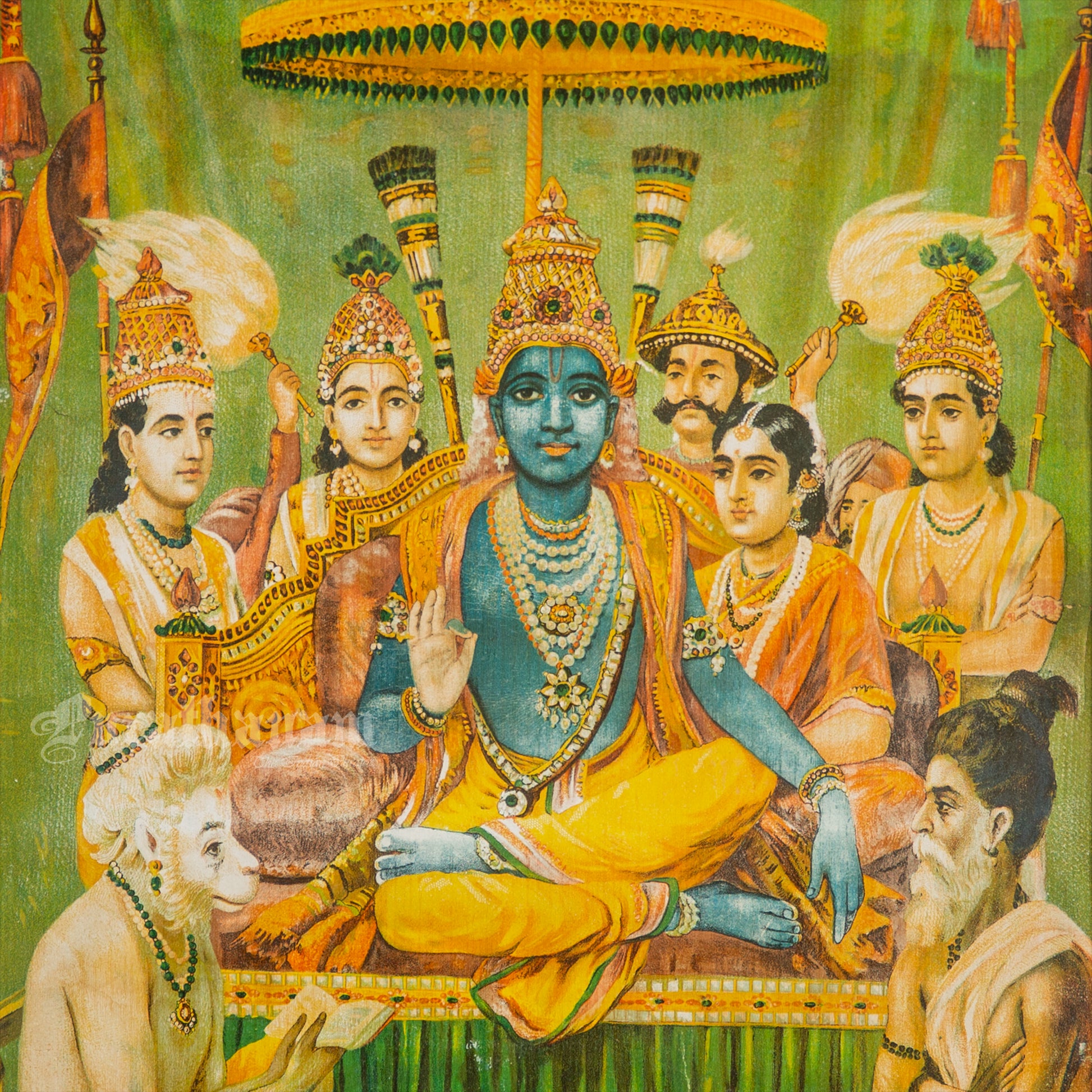 This is an oleograph print from 1920s of Ram Pattabhishekam by Ravi Varma an Indian who achieved recognition for his depiction of scenes from the epics of the Mahabharata and Ramayana.