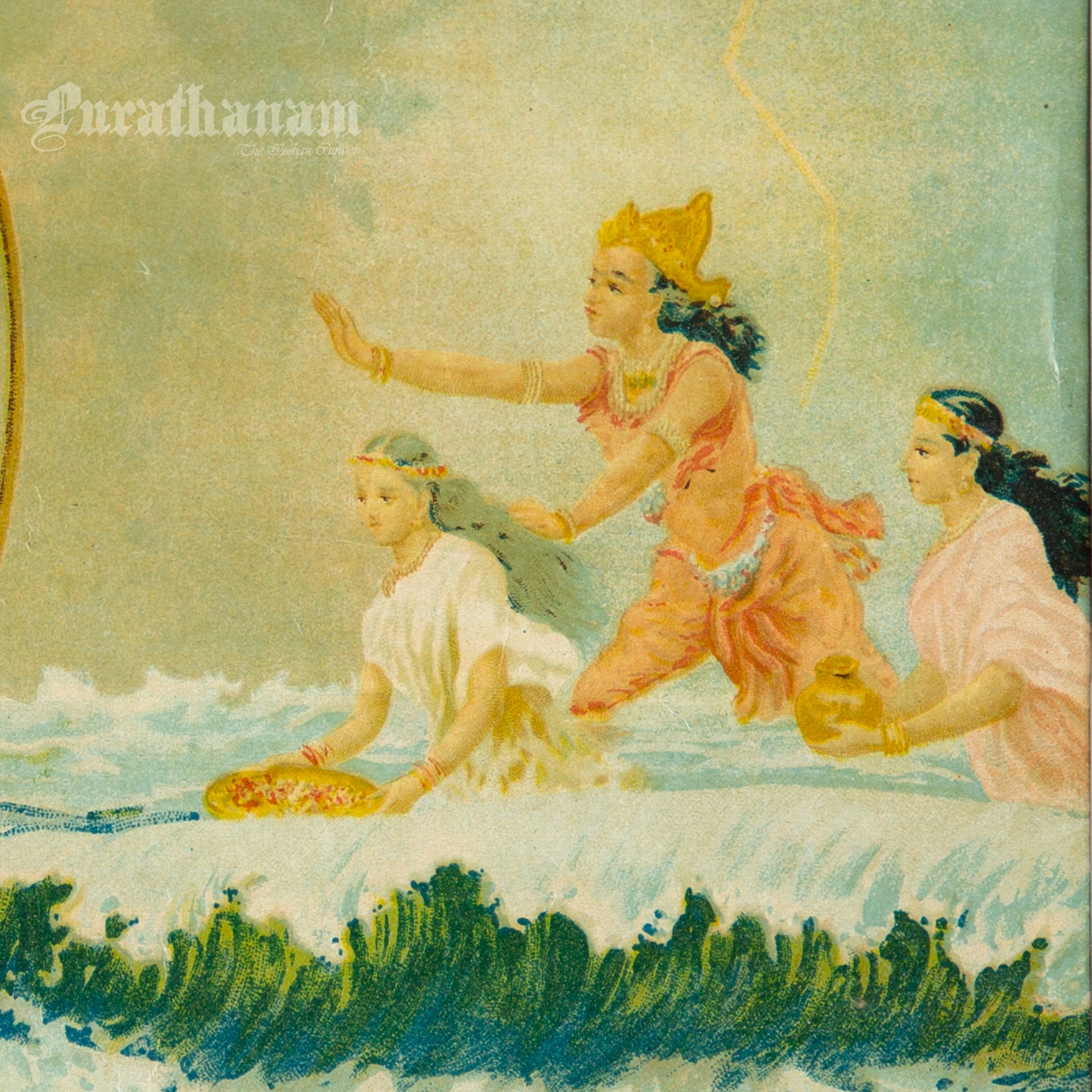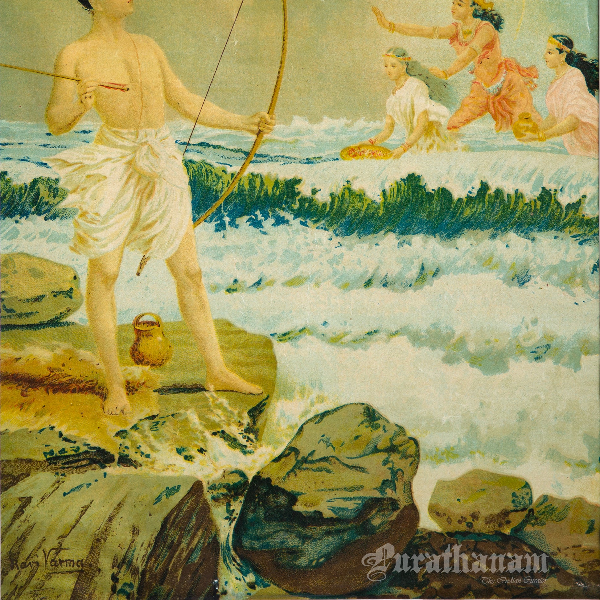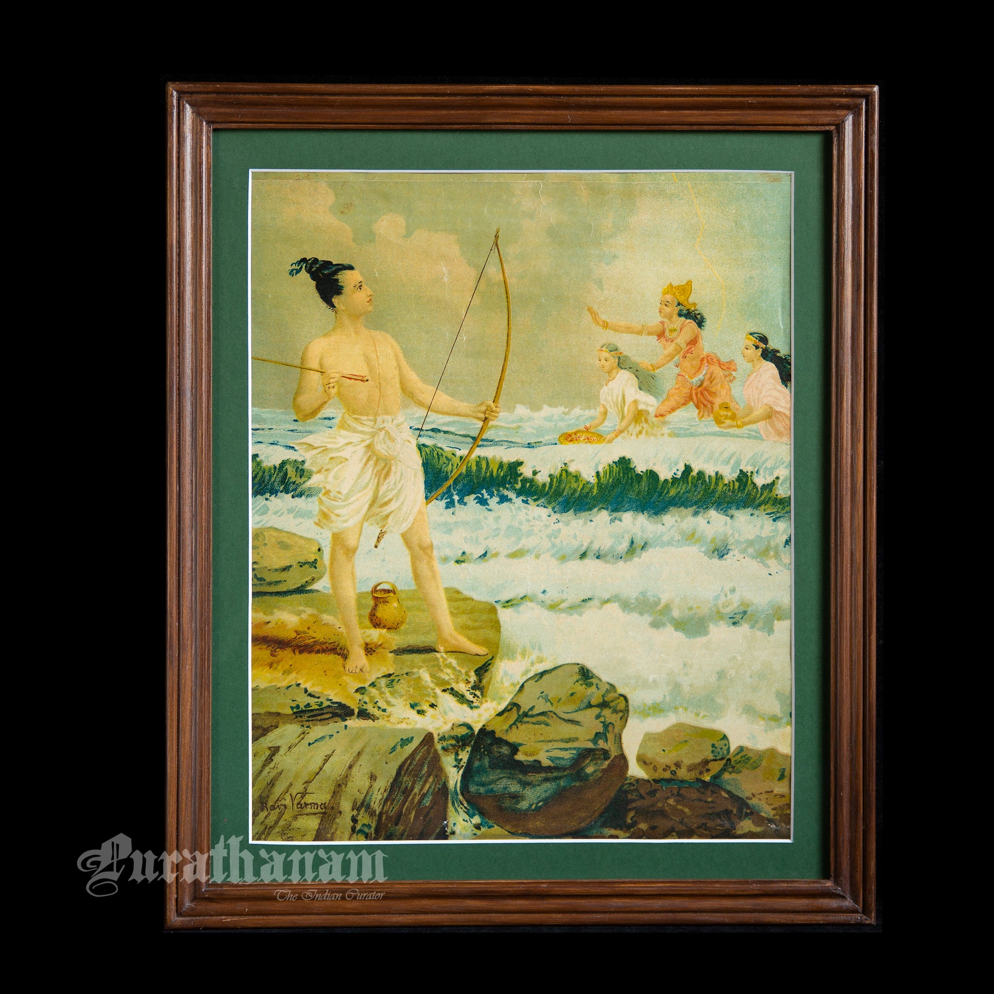 This is an oleograph print from 1920s of Ram Sagar Dharpaharan by Ravi Varma an Indian who achieved recognition for his depiction of scenes from the epics of the Mahabharata and Ramayana.