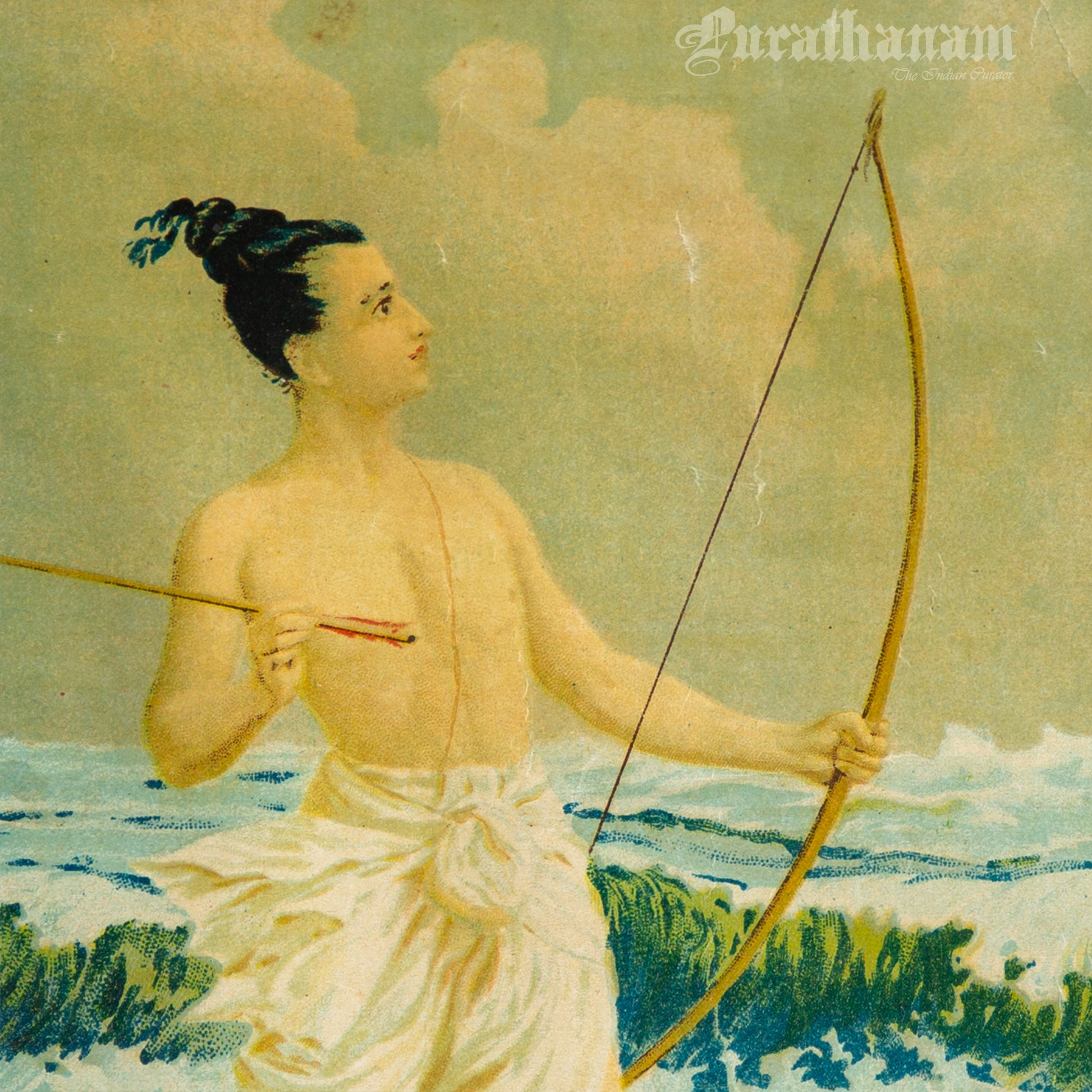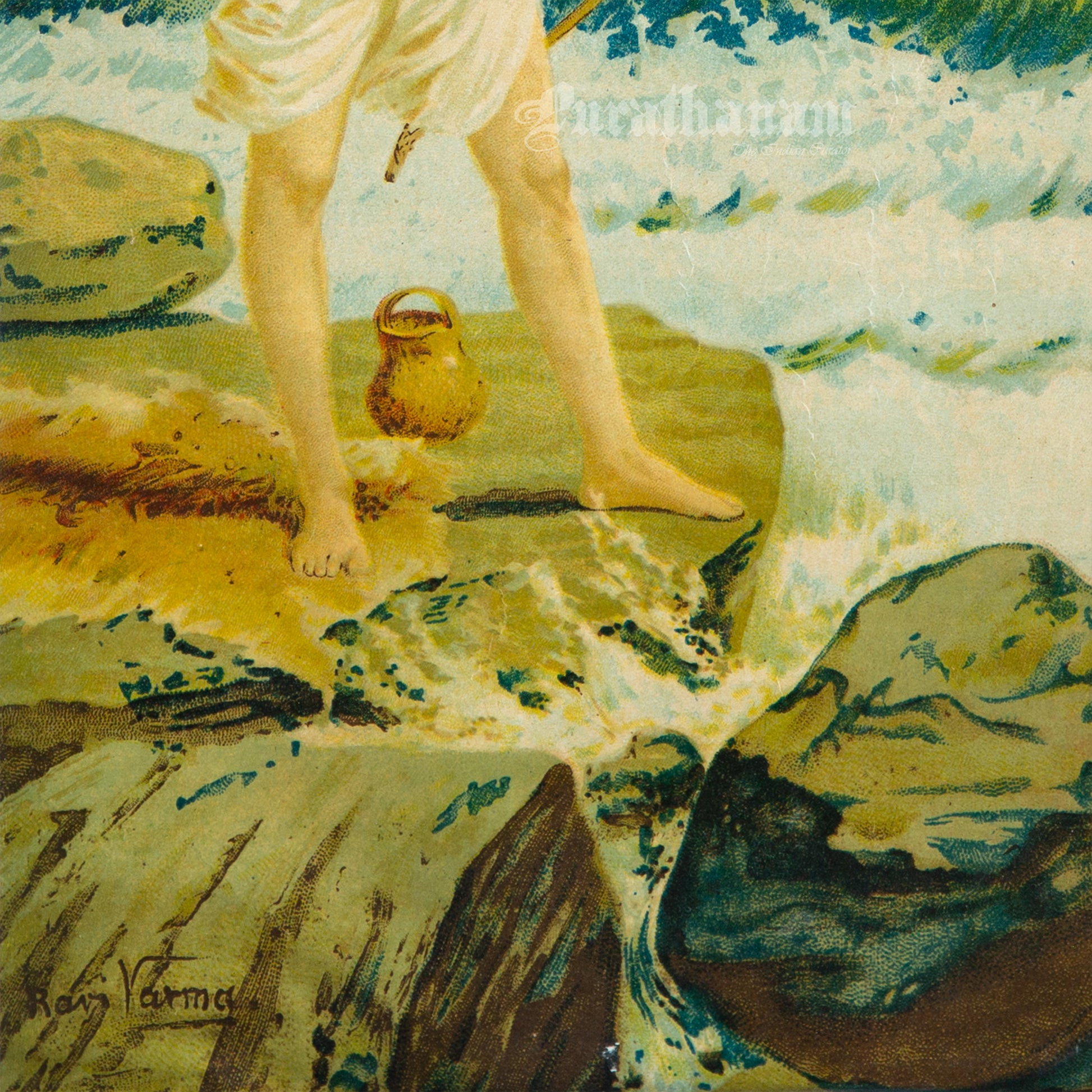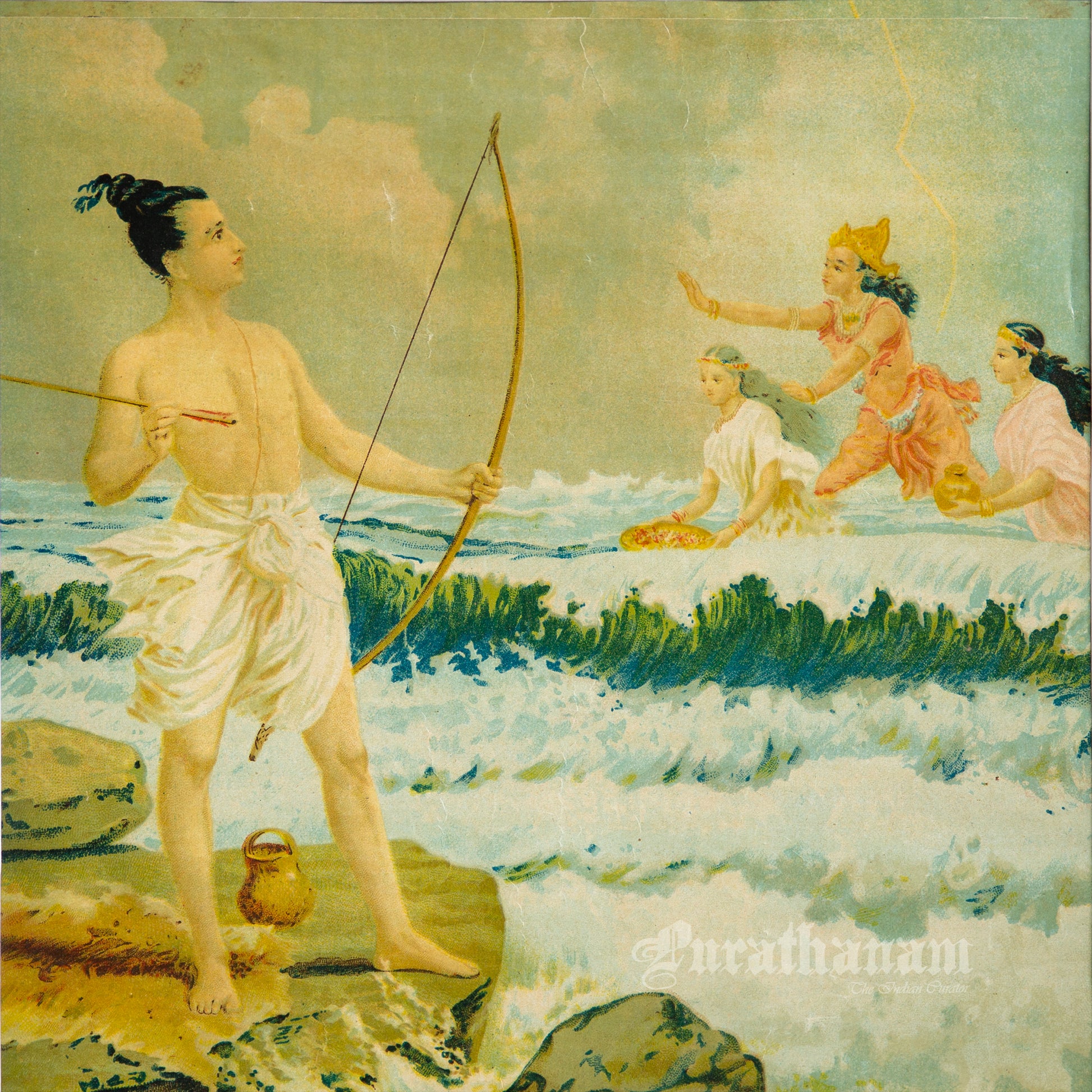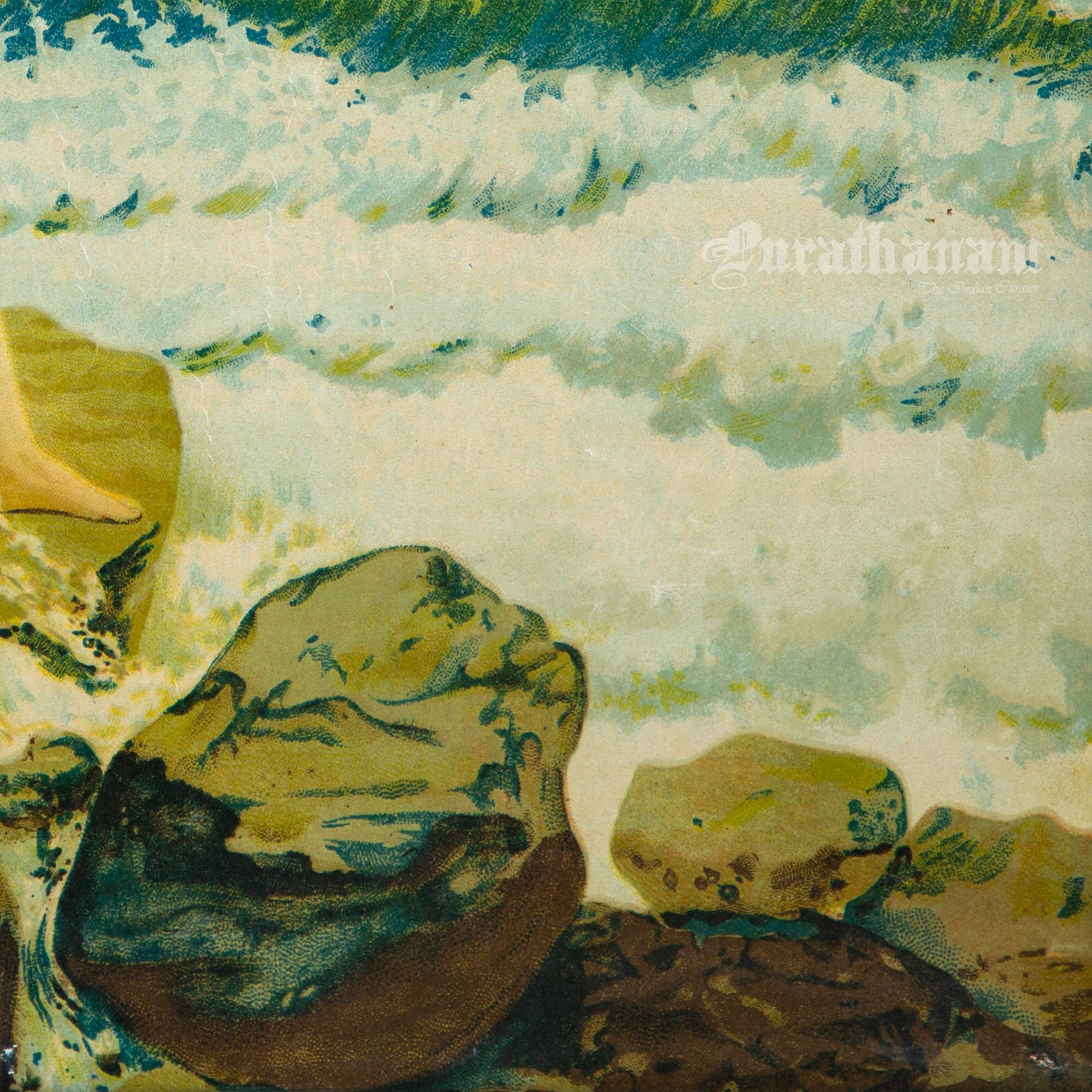 This is an oleograph print from 1920s of Ram Sagar Dharpaharan by Ravi Varma an Indian who achieved recognition for his depiction of scenes from the epics of the Mahabharata and Ramayana.