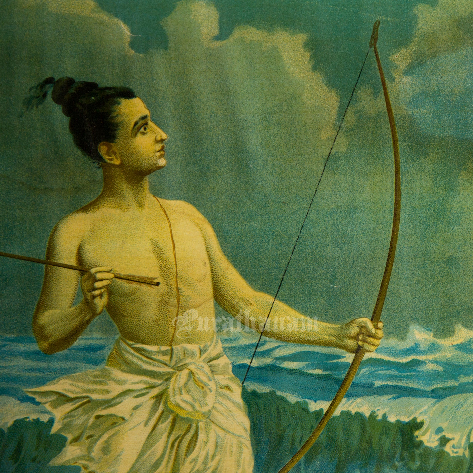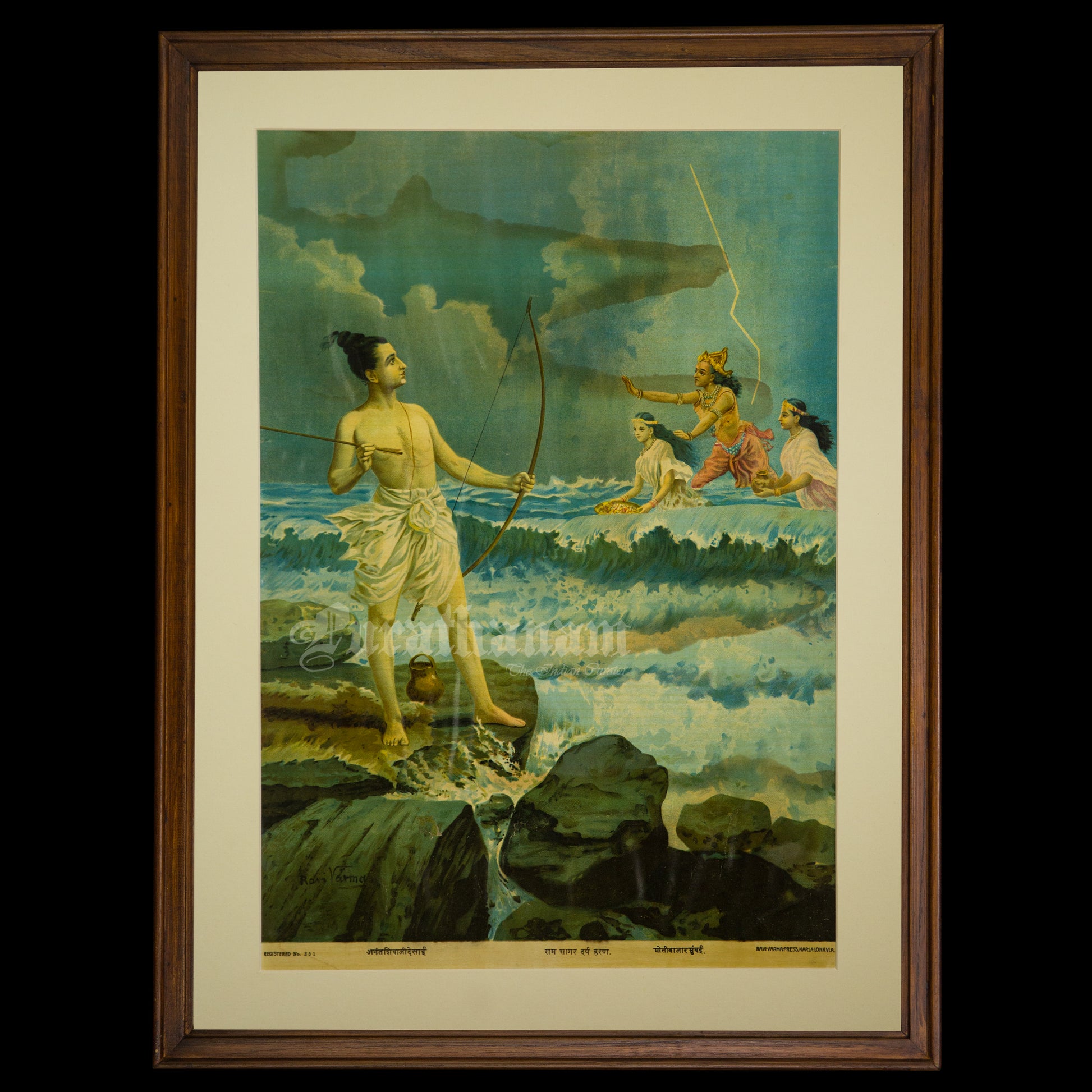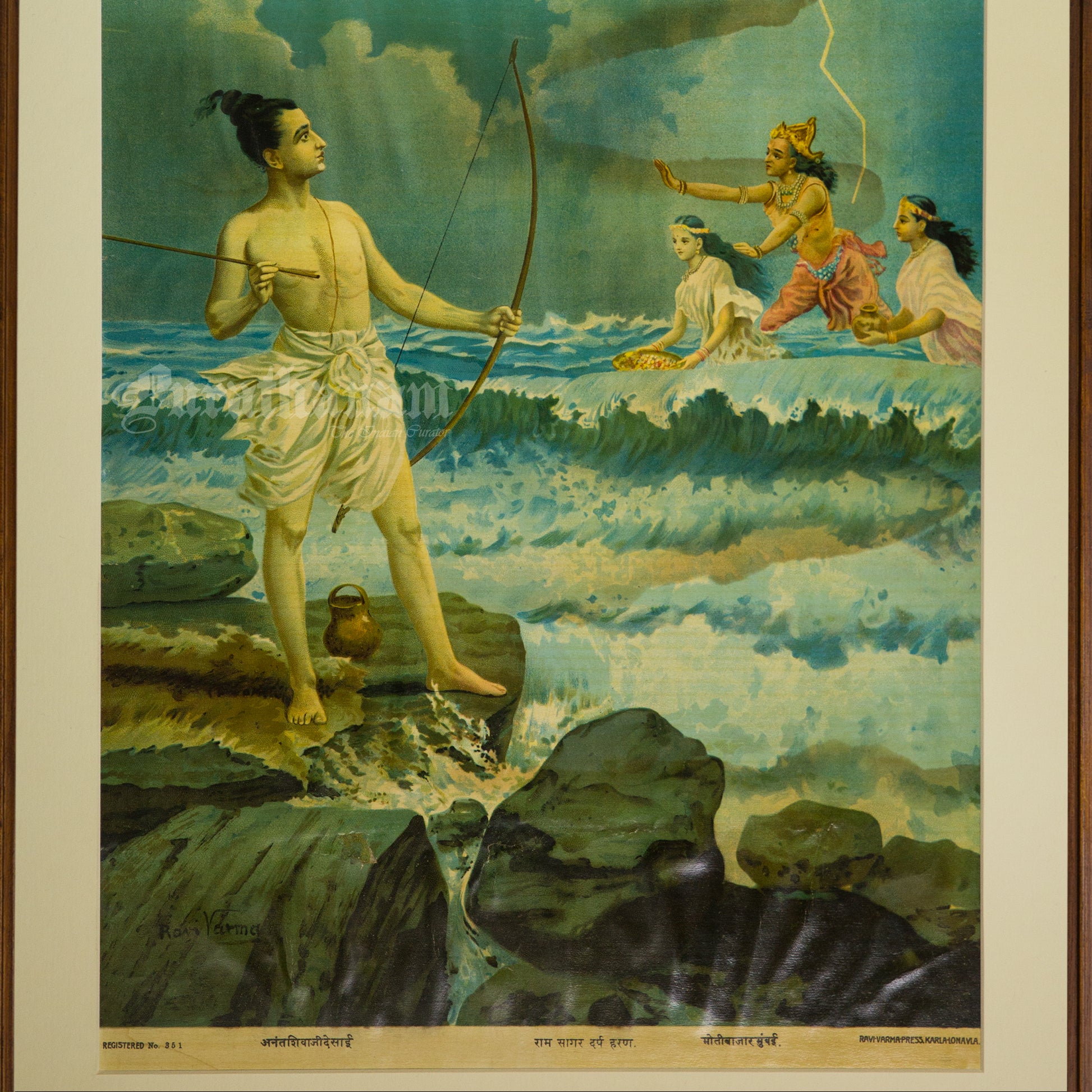 This is an oleograph print from 1920s of Ram Sagar Dharpaharan by Ravi Varma an Indian who achieved recognition for his depiction of scenes from the epics of the Mahabharata and Ramayana.What is Oleography?