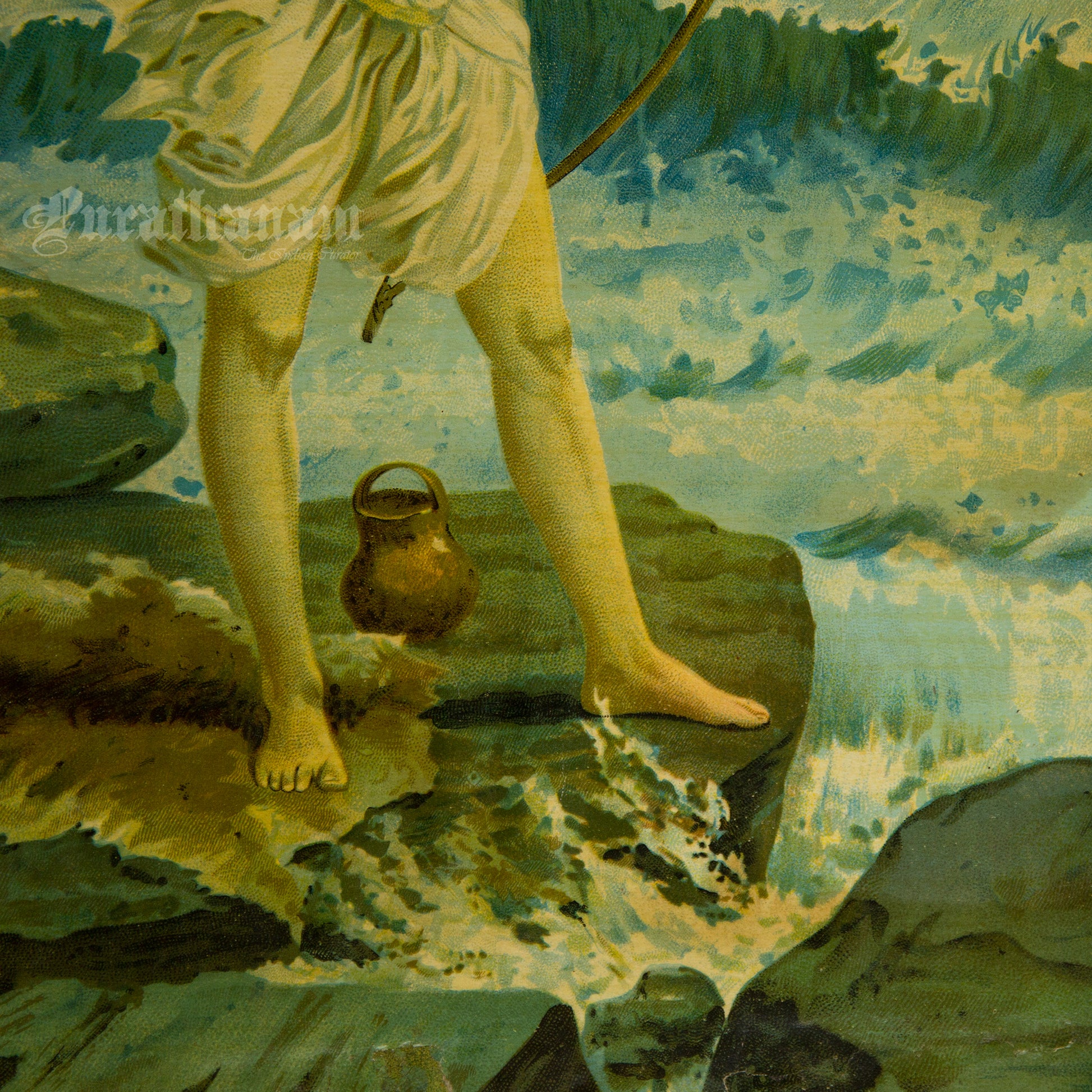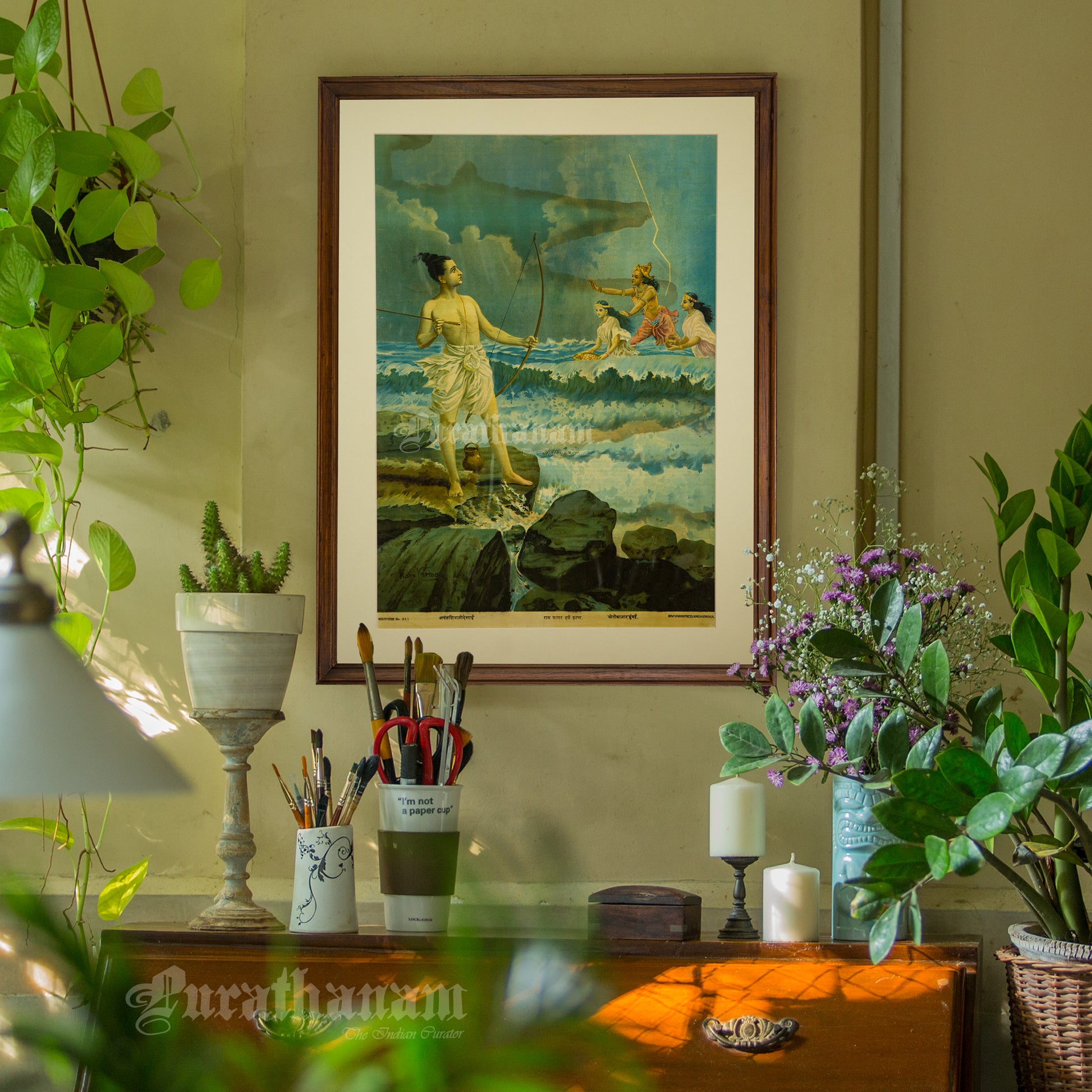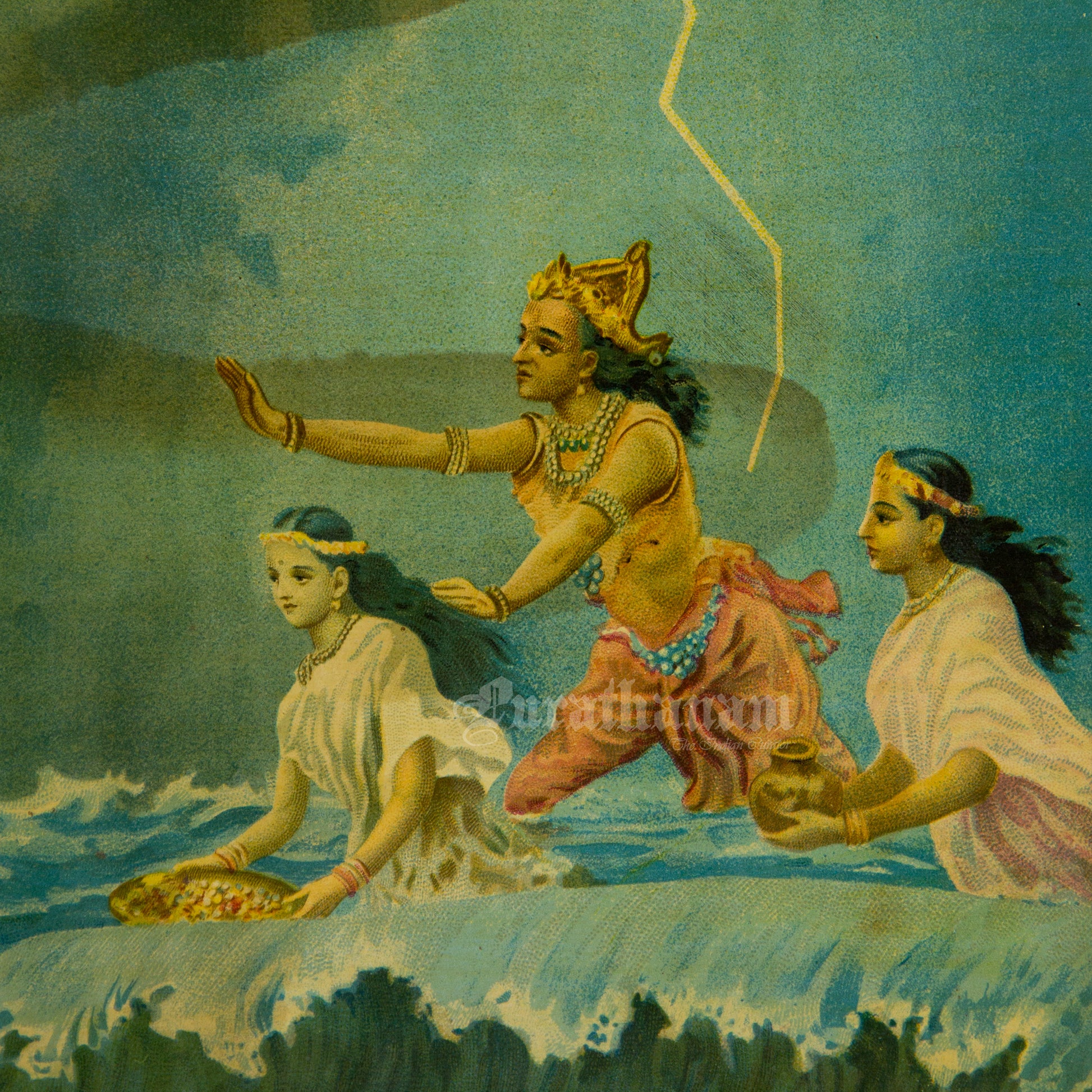 This is an oleograph print from 1920s of Ram Sagar Dharpaharan by Ravi Varma an Indian who achieved recognition for his depiction of scenes from the epics of the Mahabharata and Ramayana.What is Oleography?