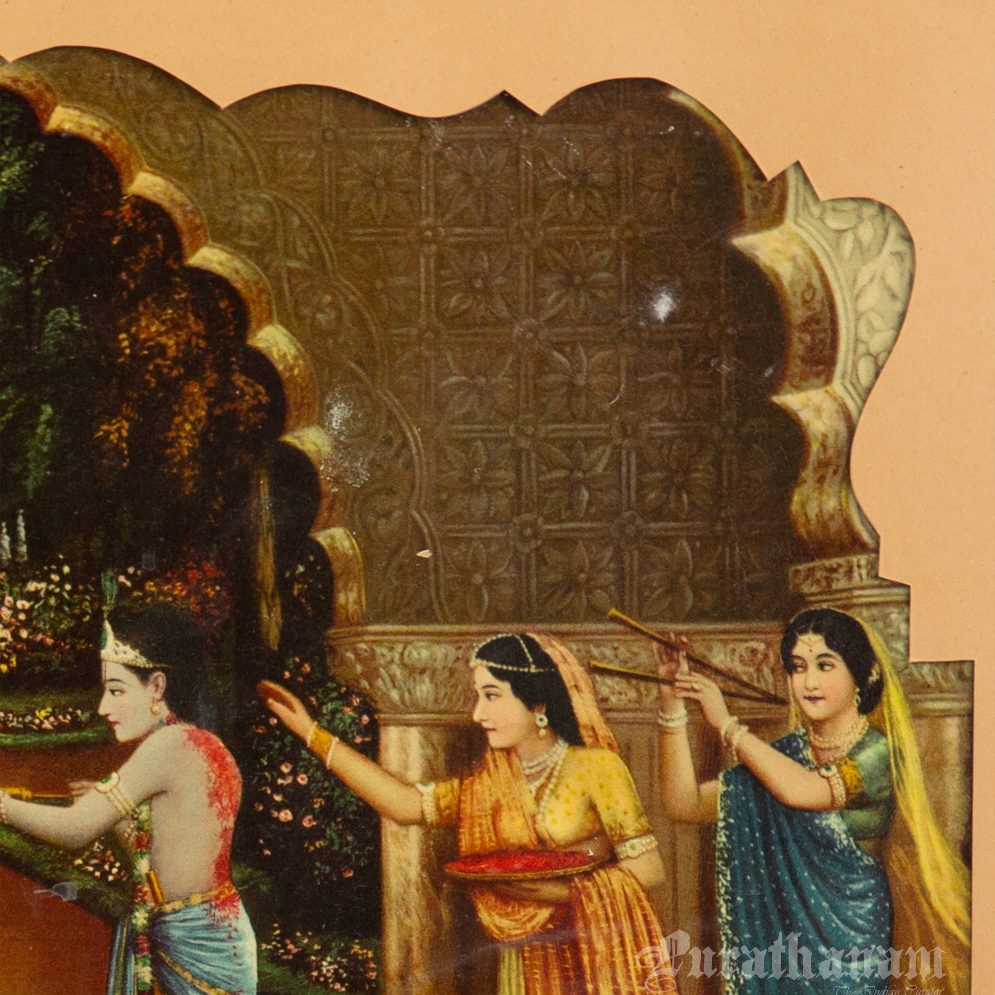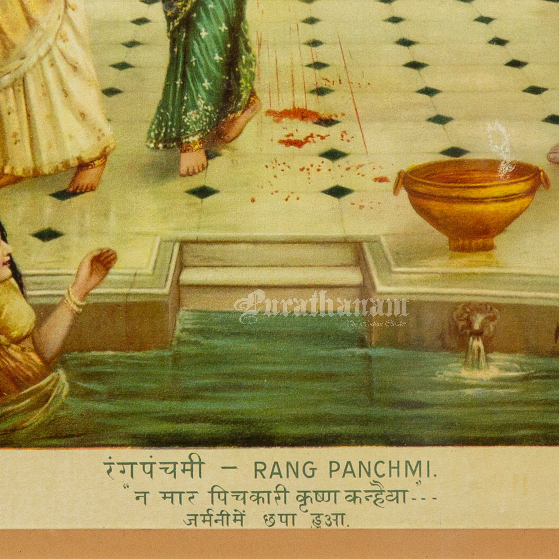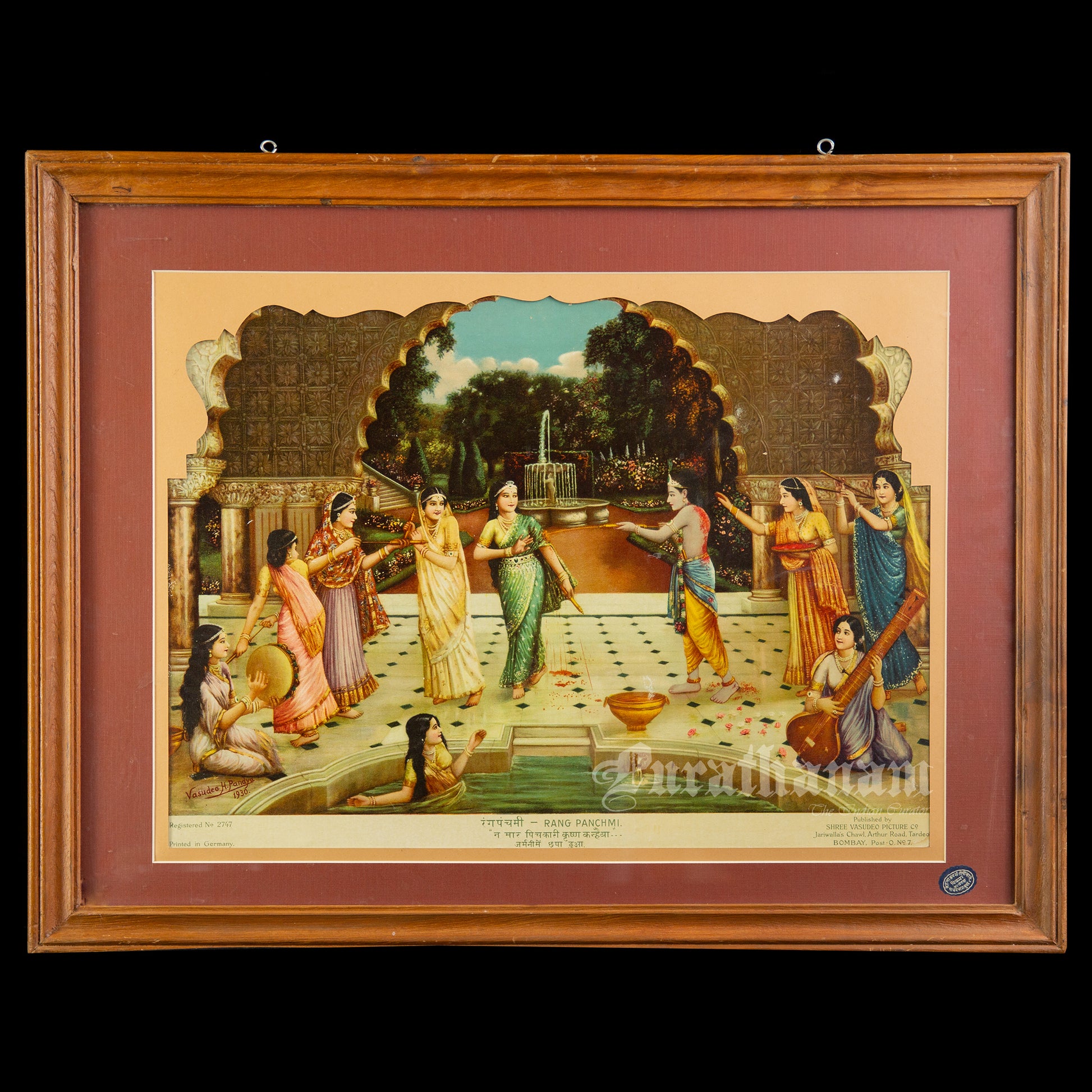This is an oleograph print from early 1900s of Rang Panchami by Vasudeo Hiralal Pandya an Indian painter.