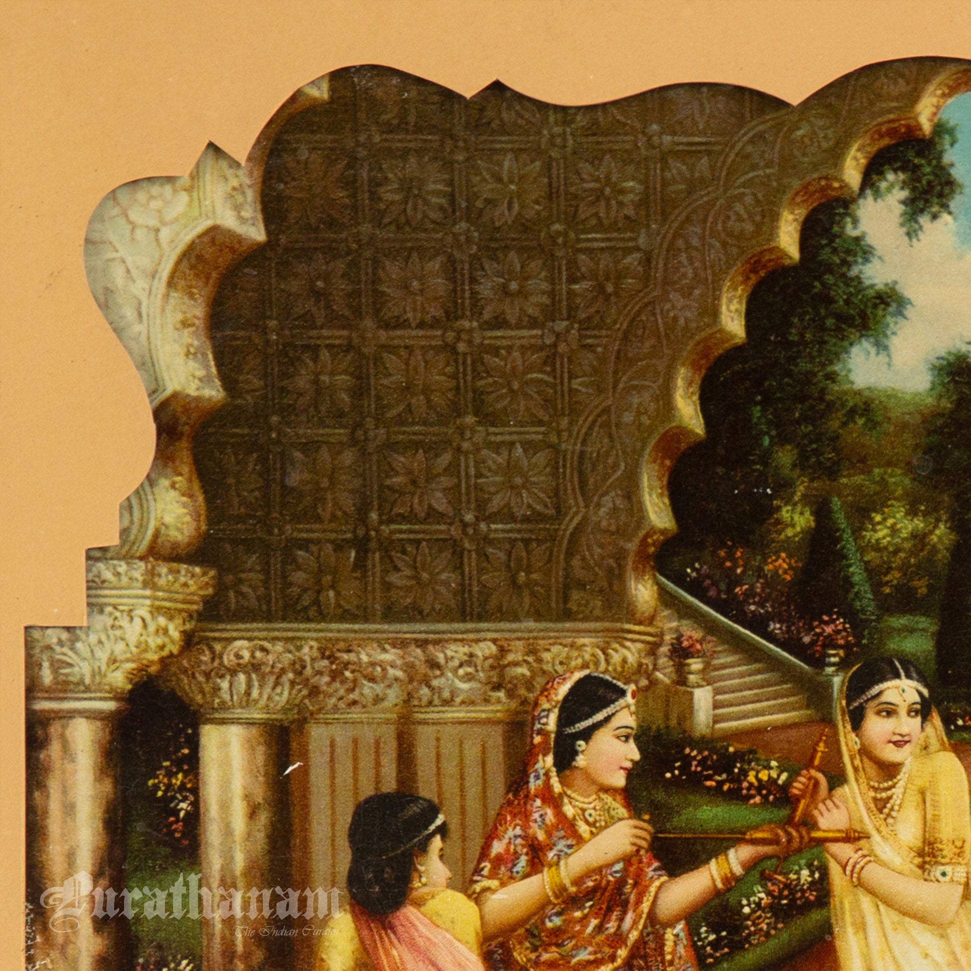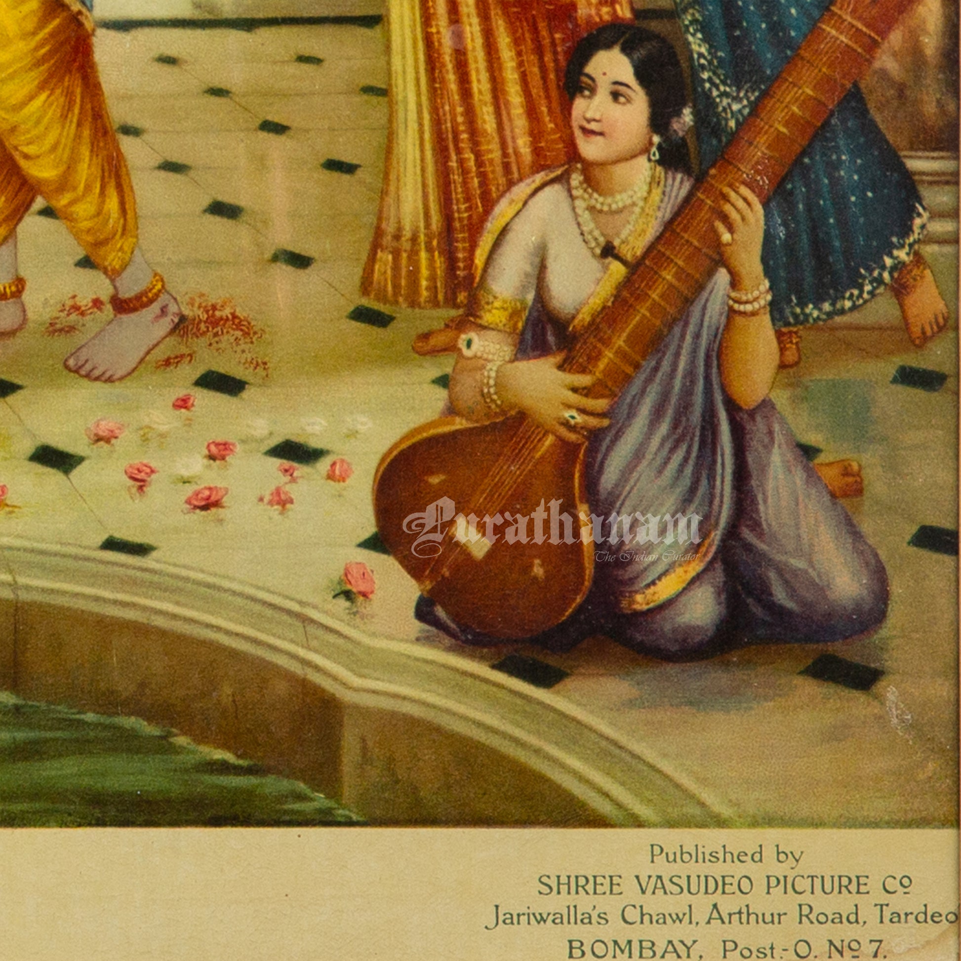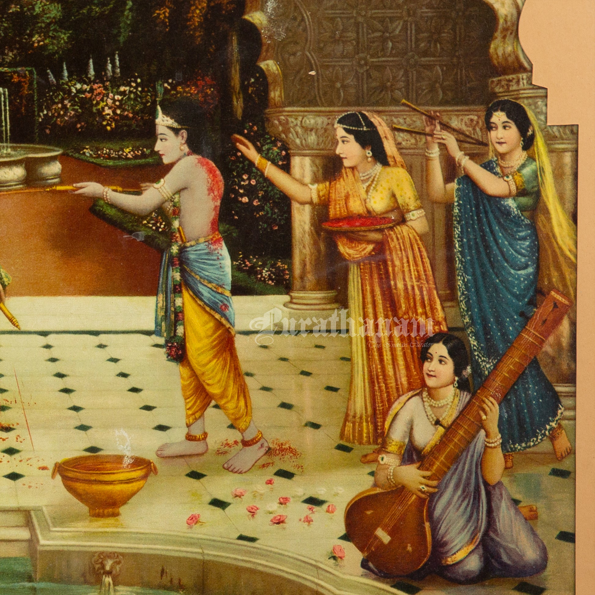 This is an oleograph print from early 1900s of Rang Panchami by Vasudeo Hiralal Pandya an Indian painter.