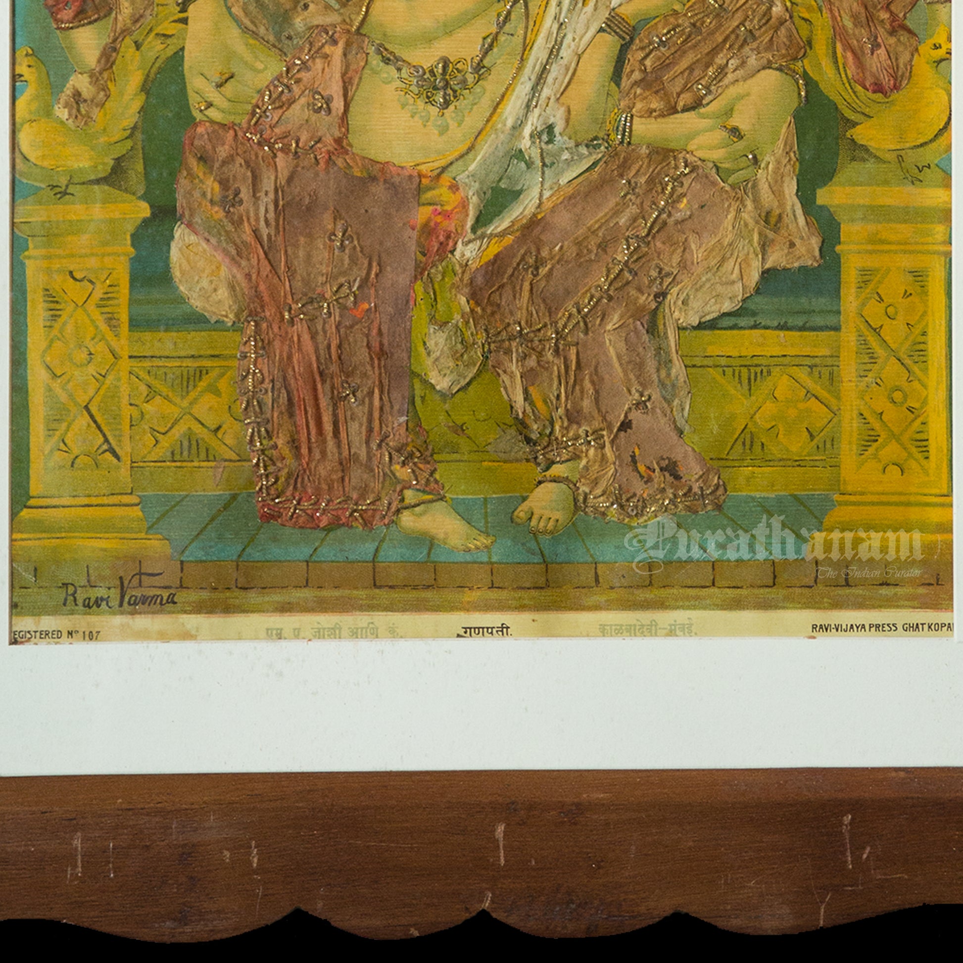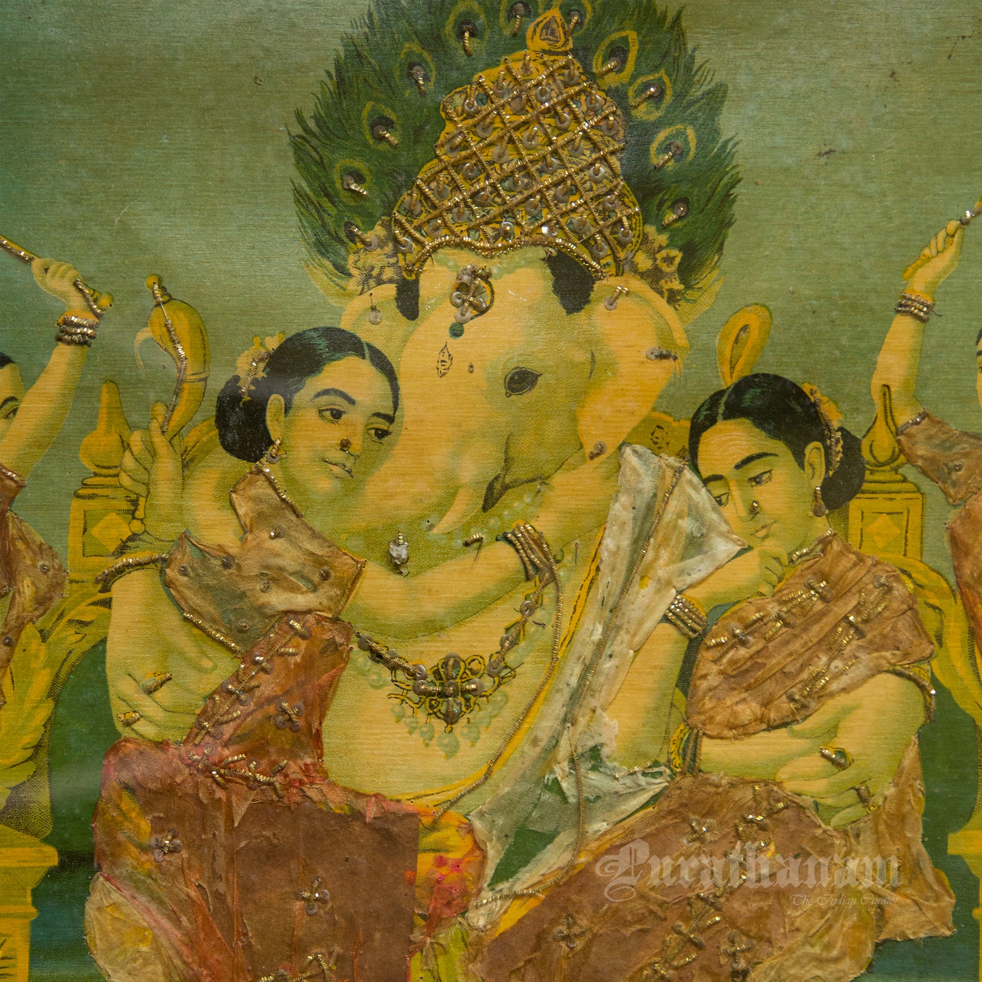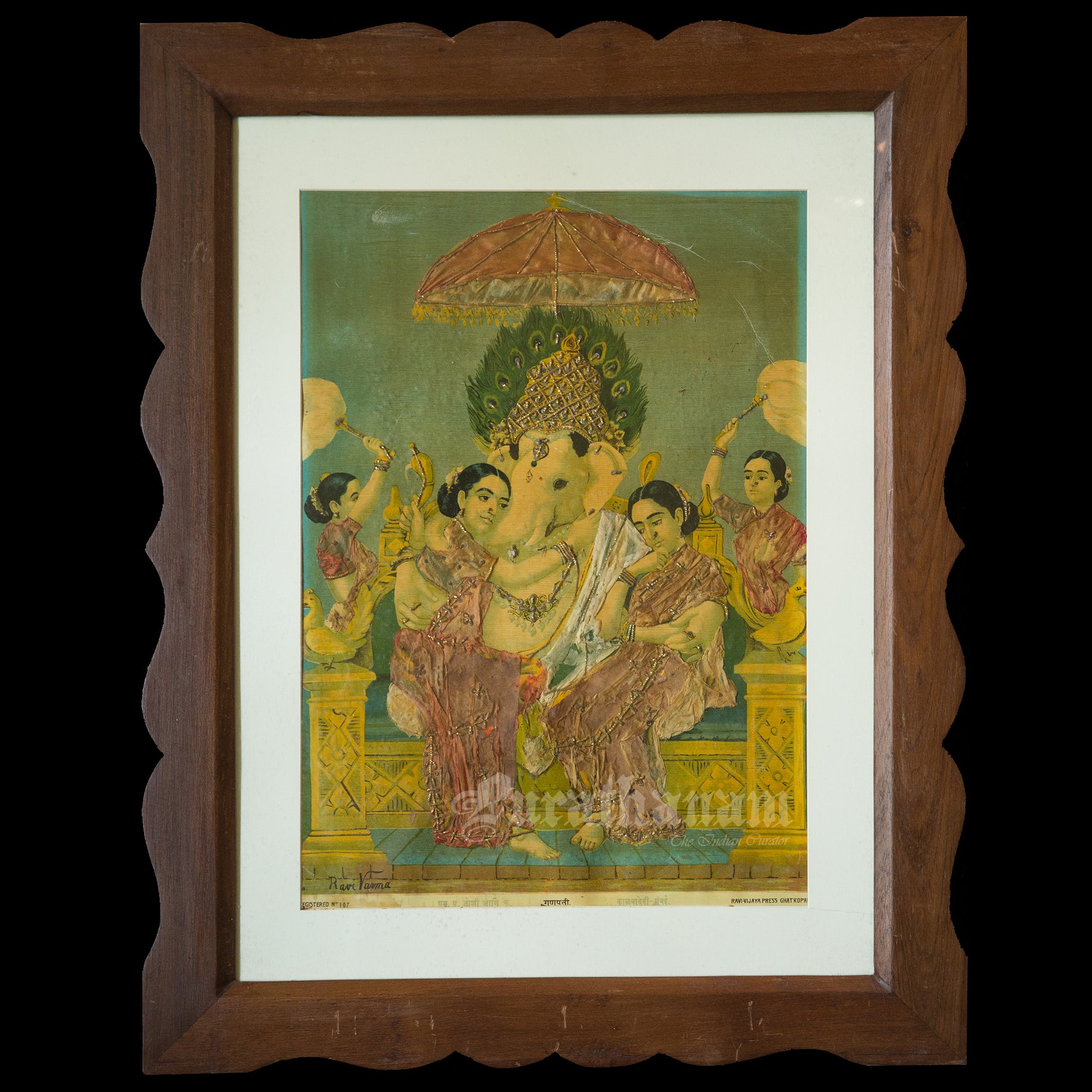 This is an oleograph print from 1920s - 1930s of Riddhi Siddhi Ganapathi by Ravi Varma an Indian who achieved recognition for his depiction of scenes from the epics of the Mahabharata and Ramayana.