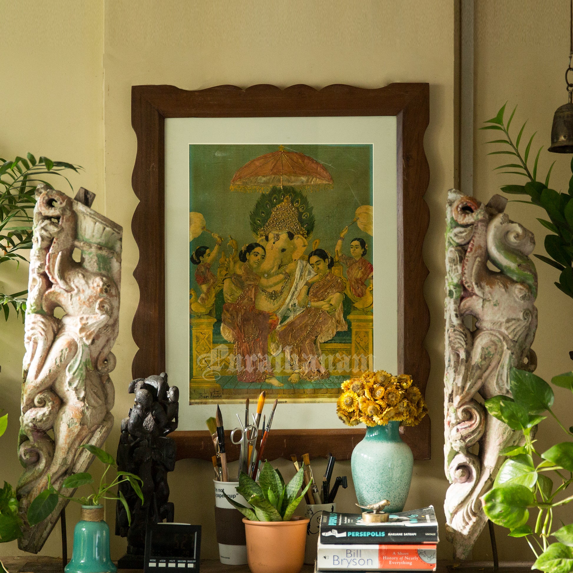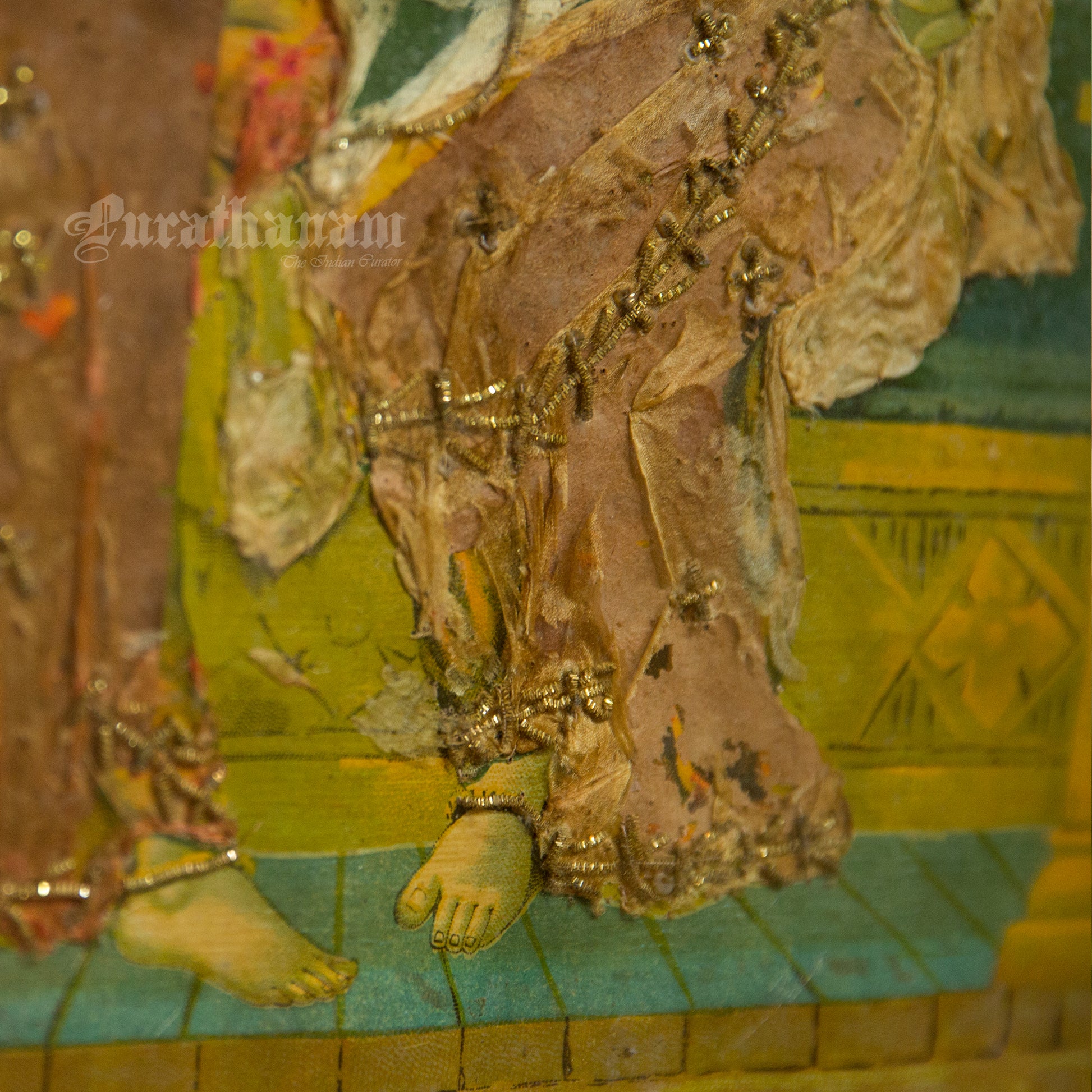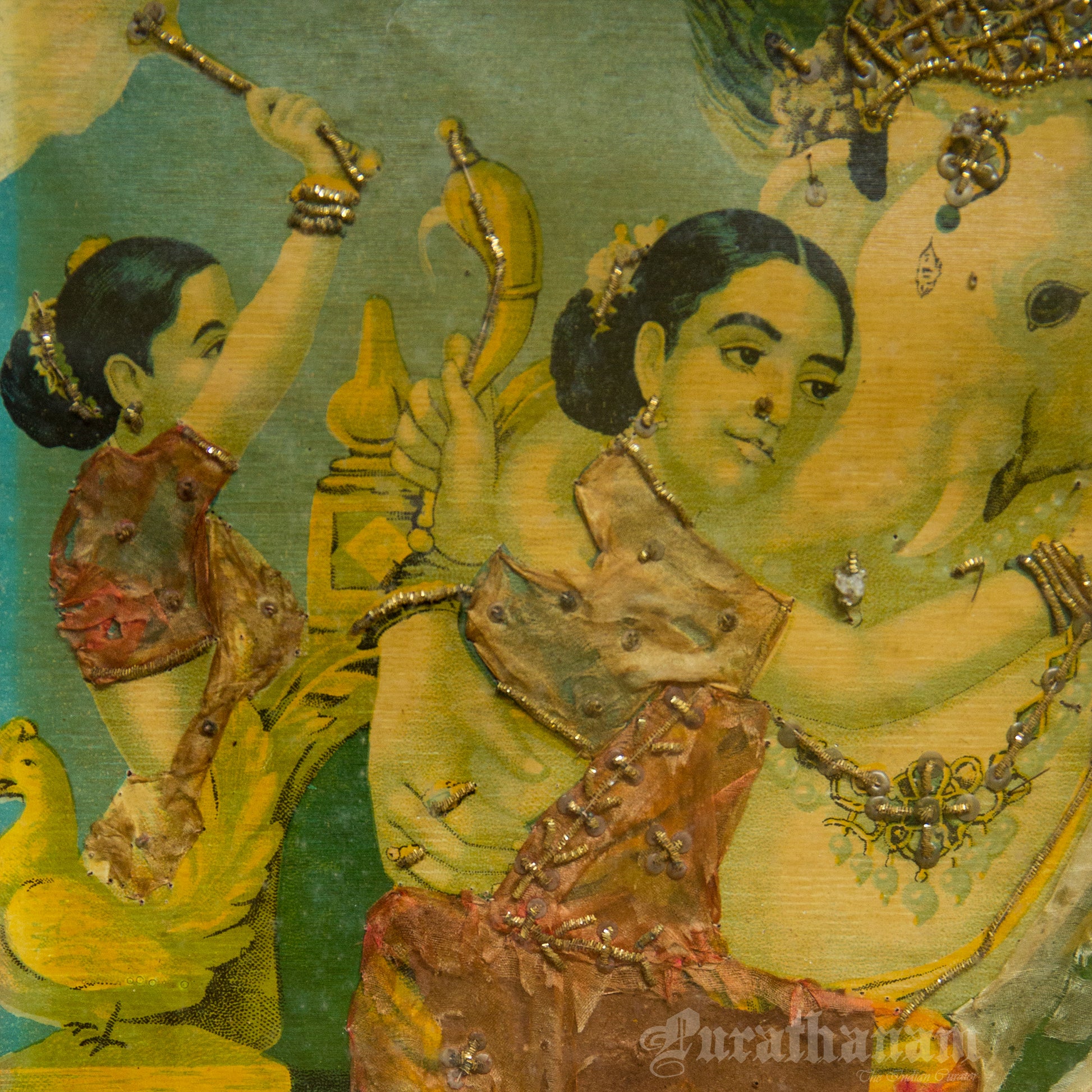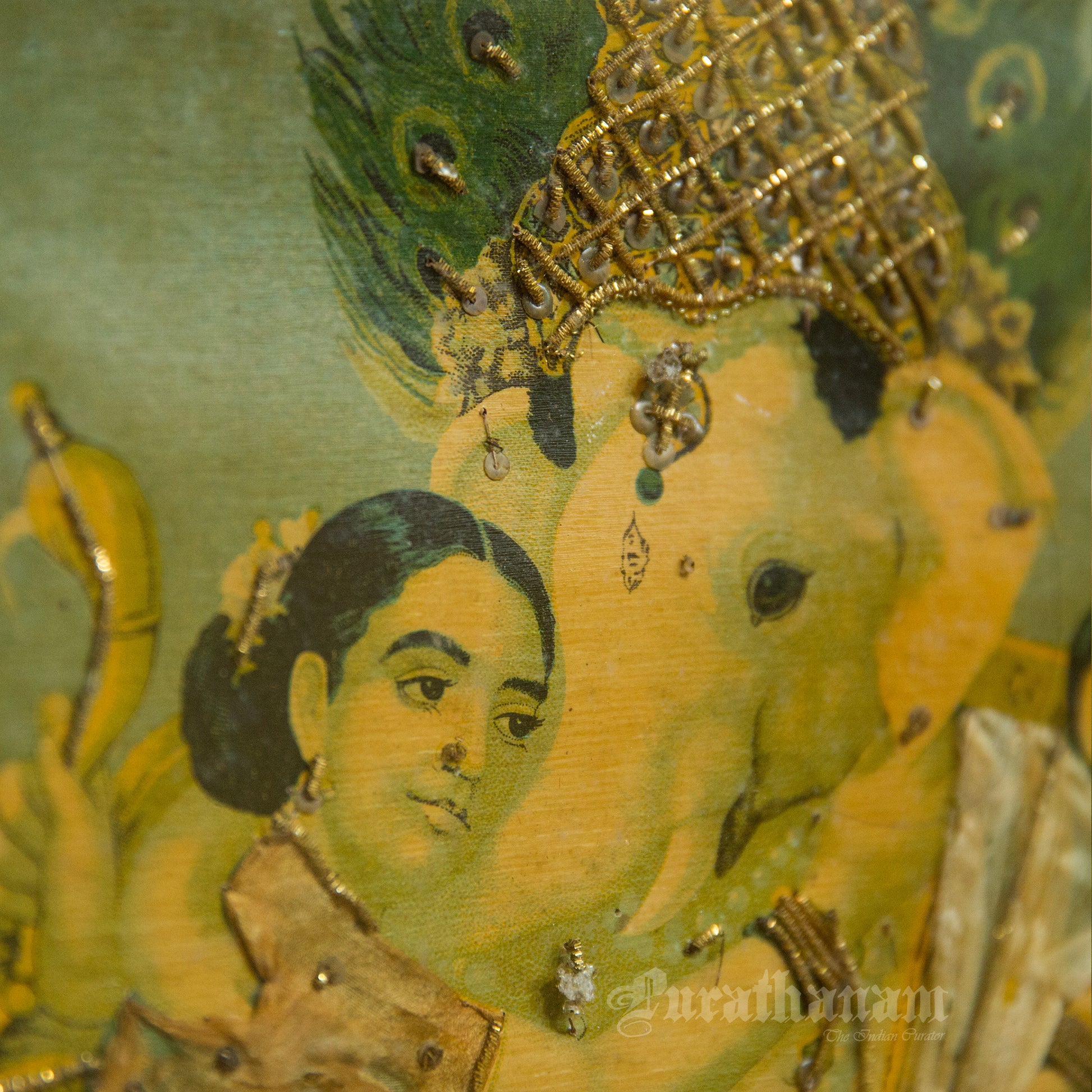 This is an oleograph print from 1920s - 1930s of Riddhi Siddhi Ganapathi by Ravi Varma an Indian who achieved recognition for his depiction of scenes from the epics of the Mahabharata and Ramayana.