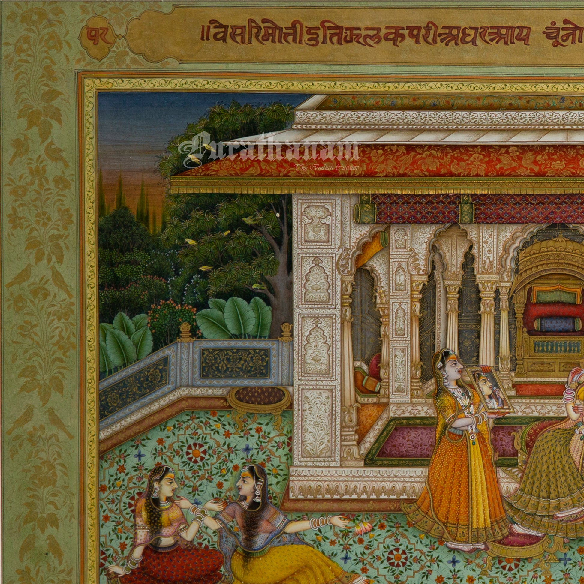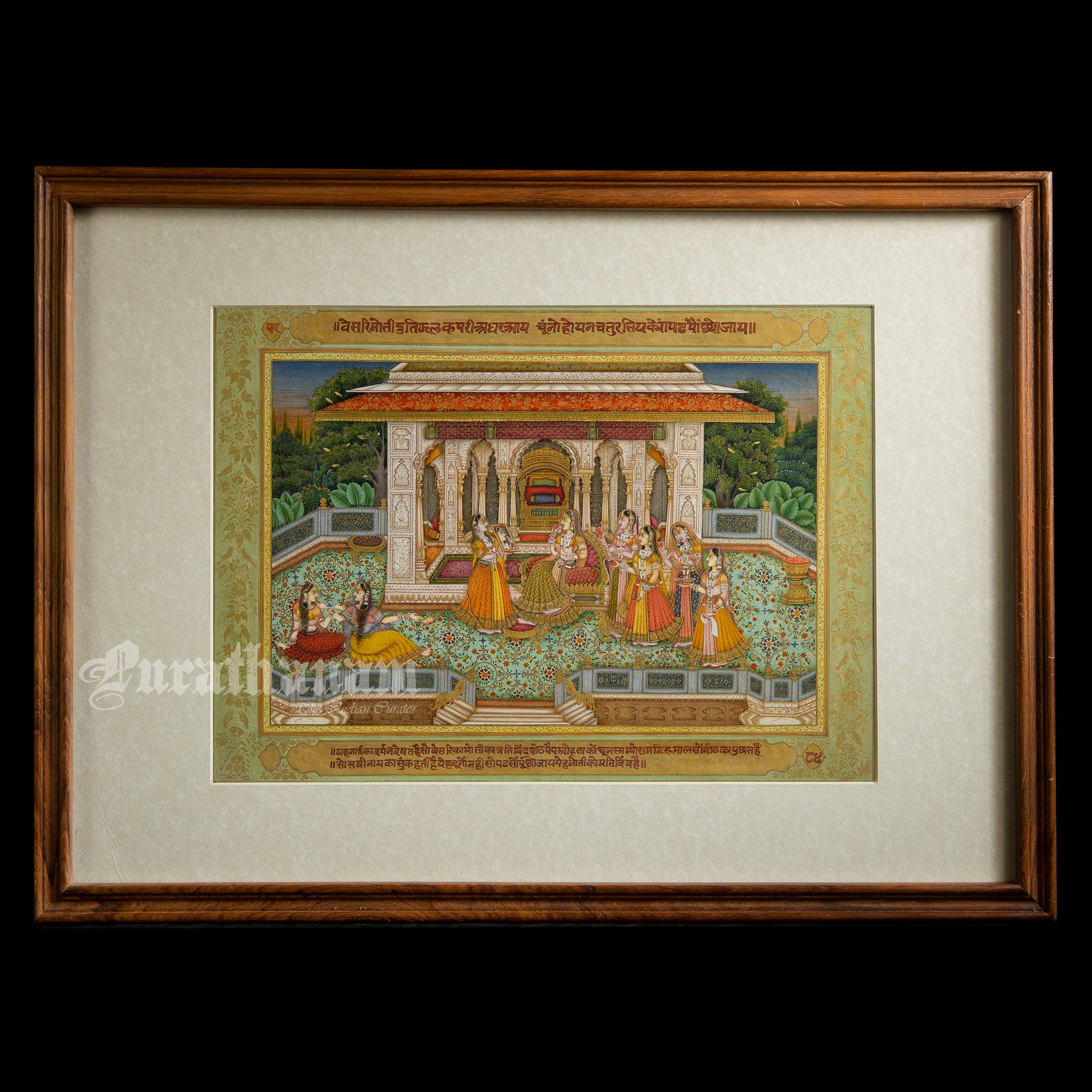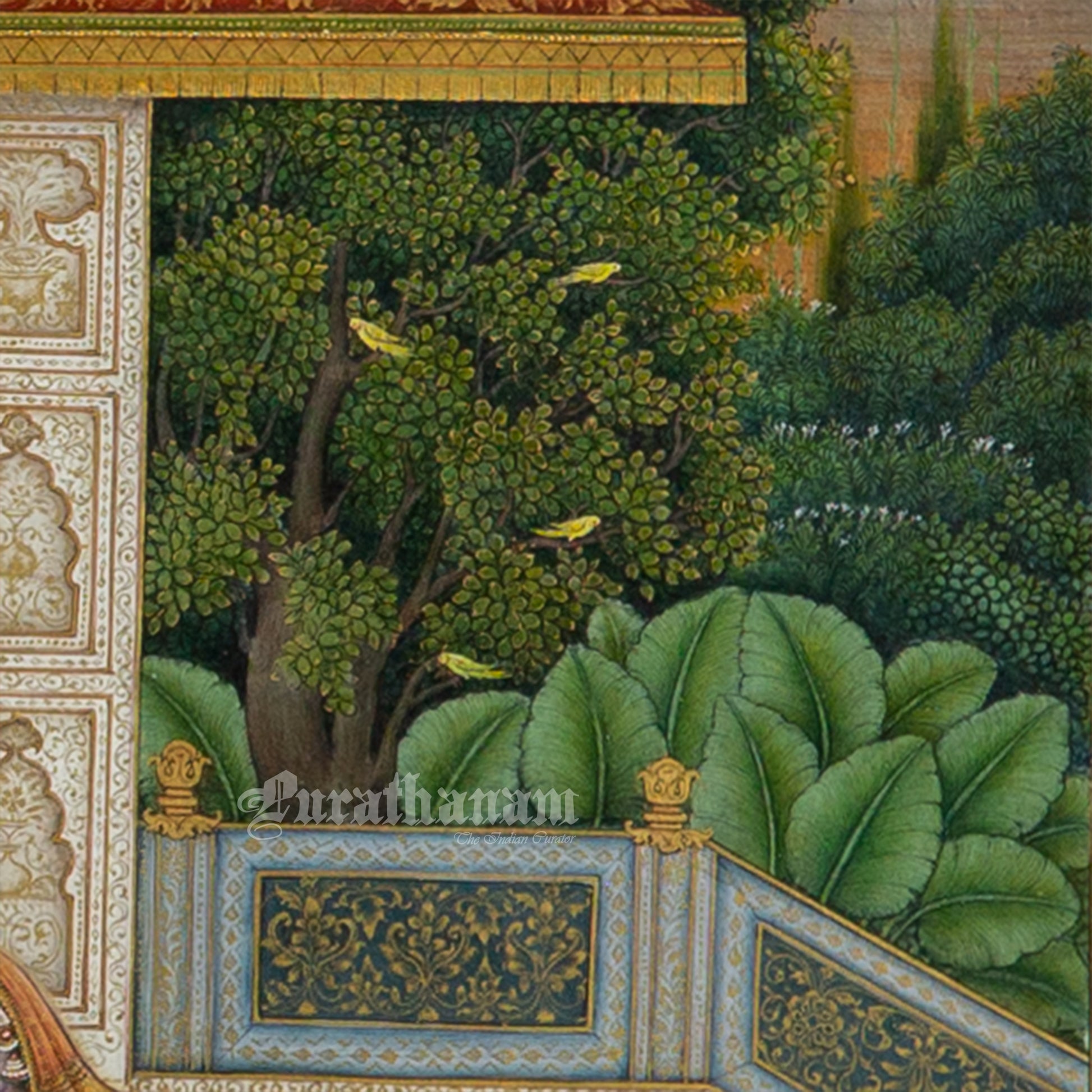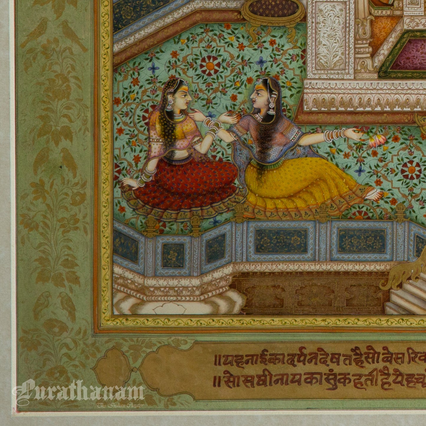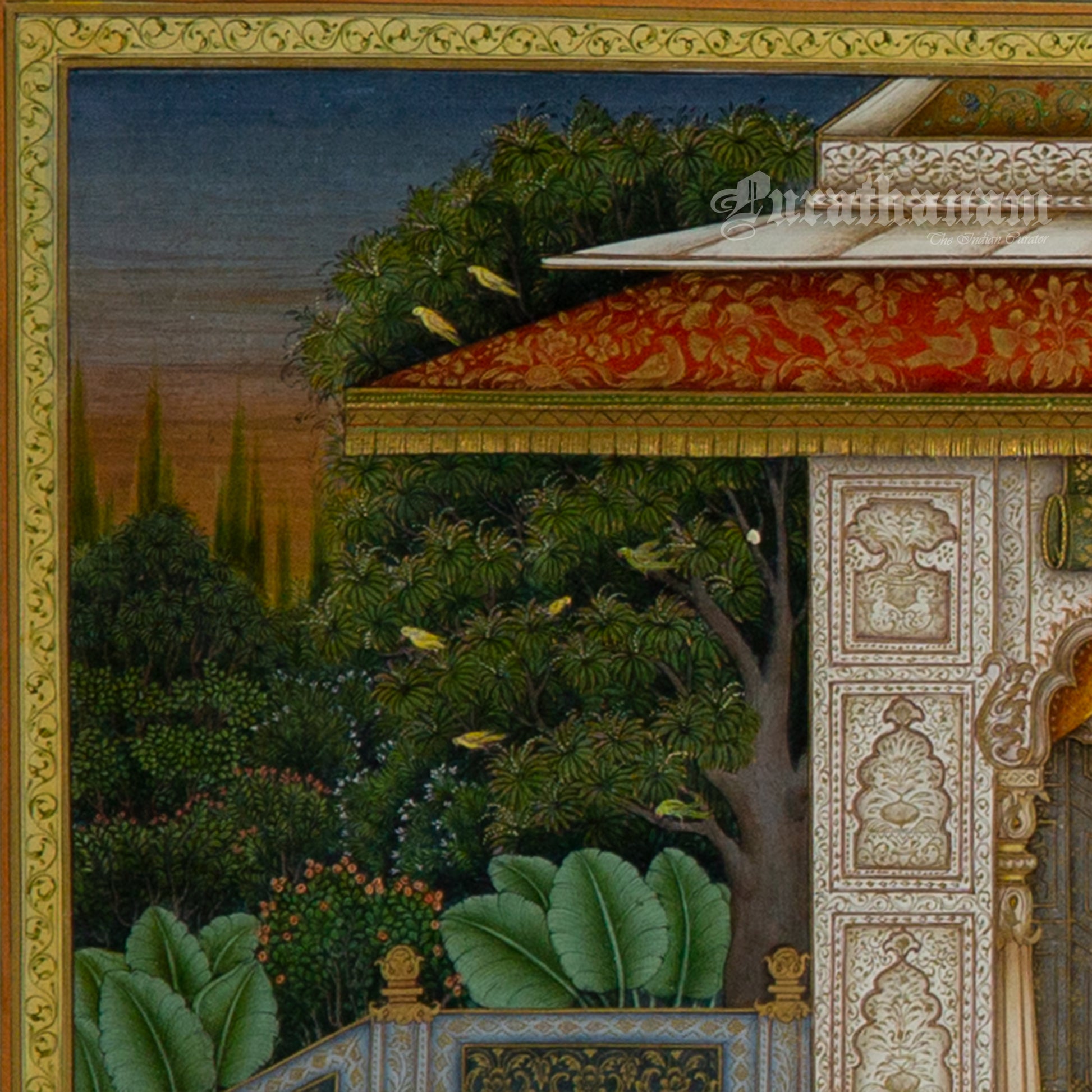 Every fold of fabric, every carved pillar is painted with remarkable care. The floral carpet, the garden courtyard, the soft gestures — all of it reflects the soul of Indian miniature art: small frames, big stories.