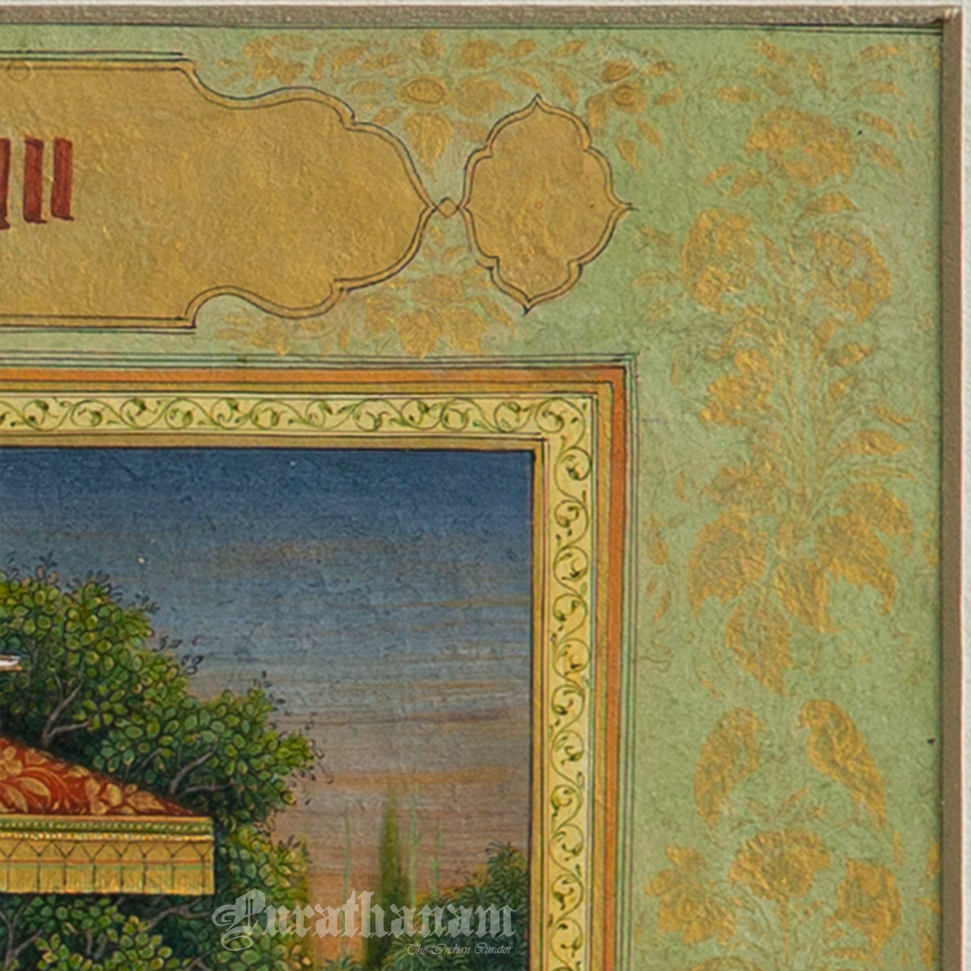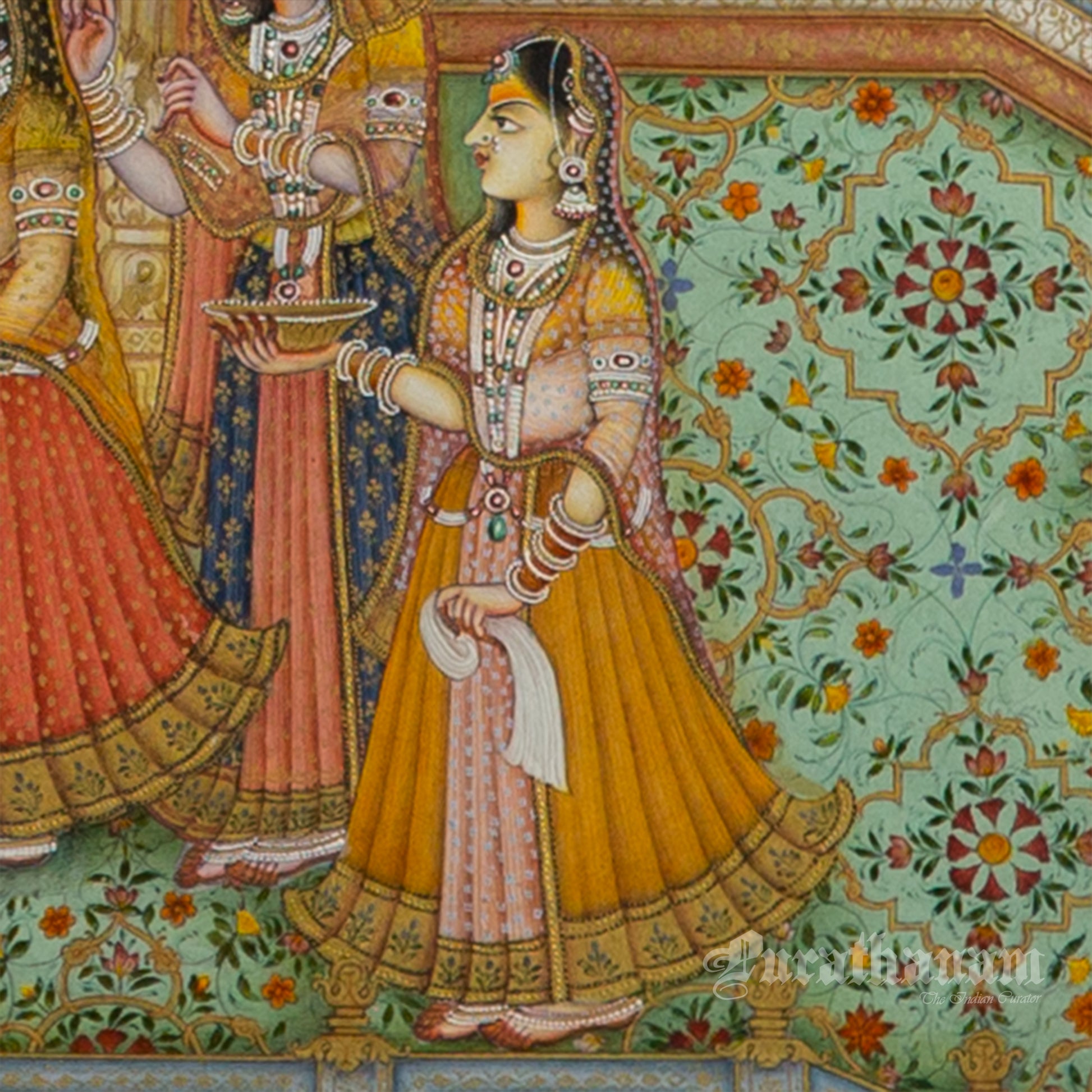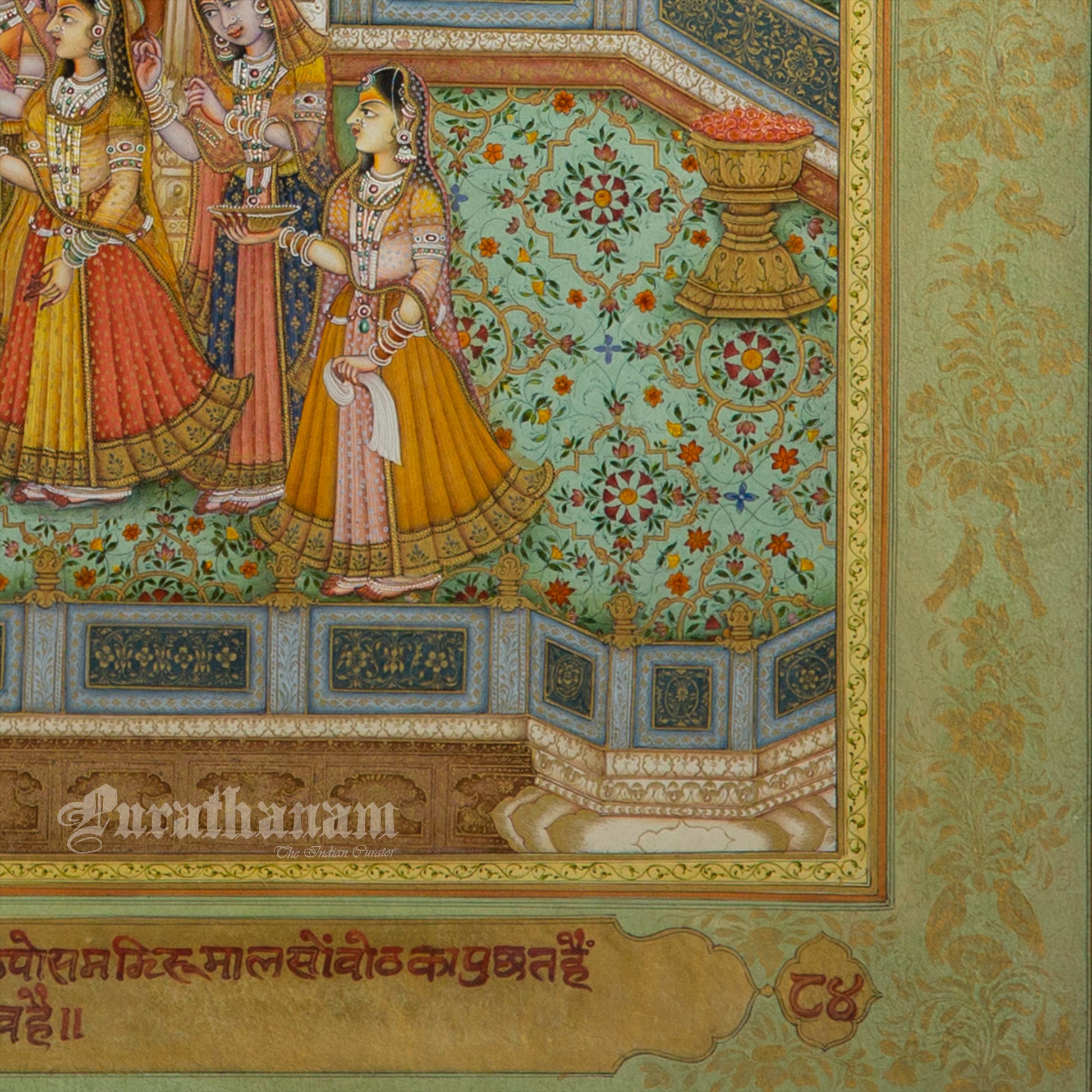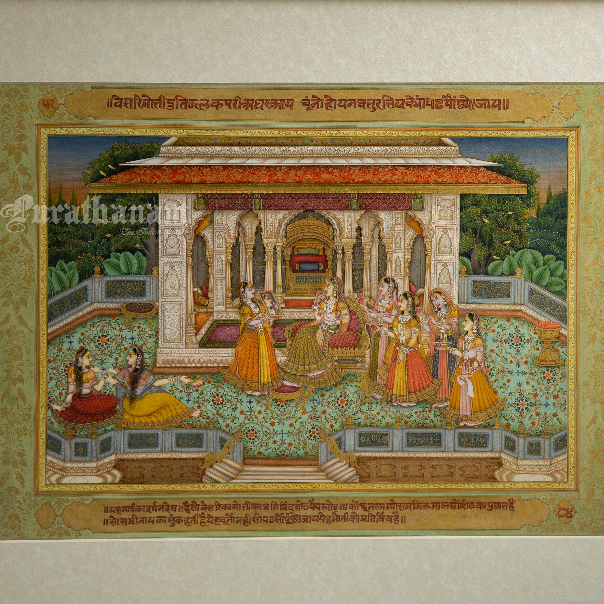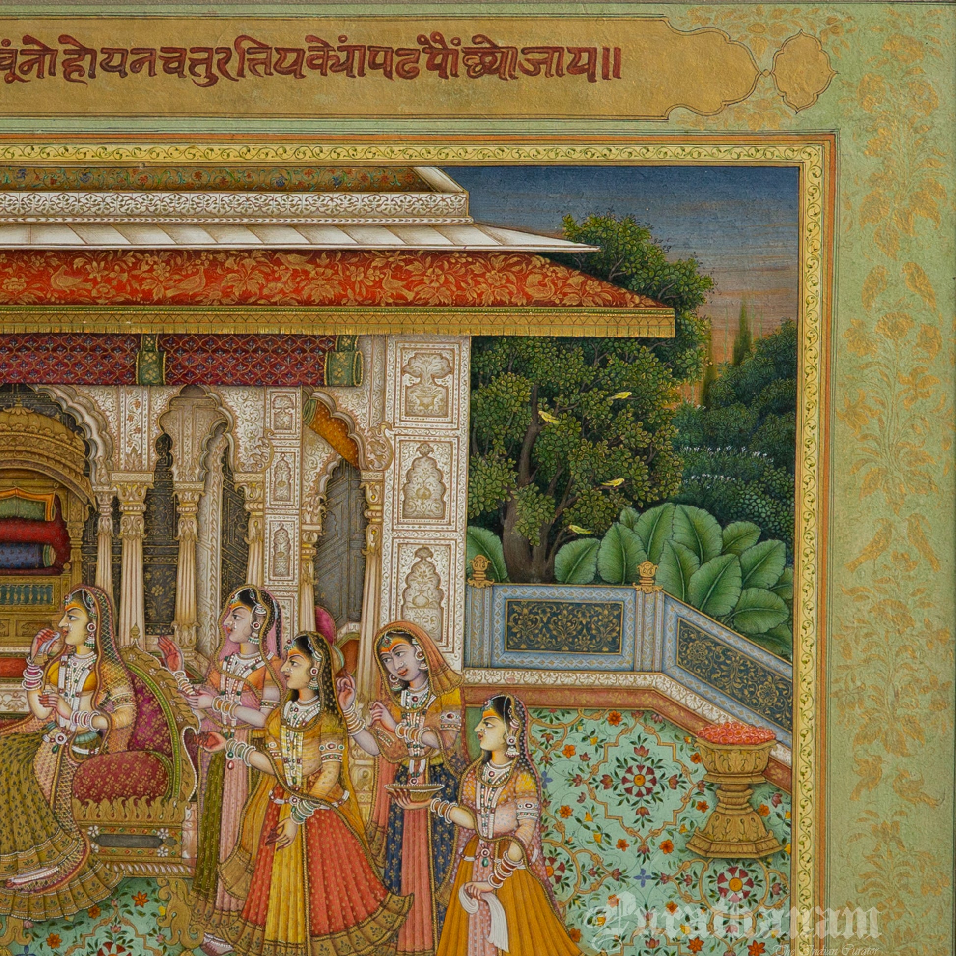 Every fold of fabric, every carved pillar is painted with remarkable care. The floral carpet, the garden courtyard, the soft gestures — all of it reflects the soul of Indian miniature art: small frames, big stories.