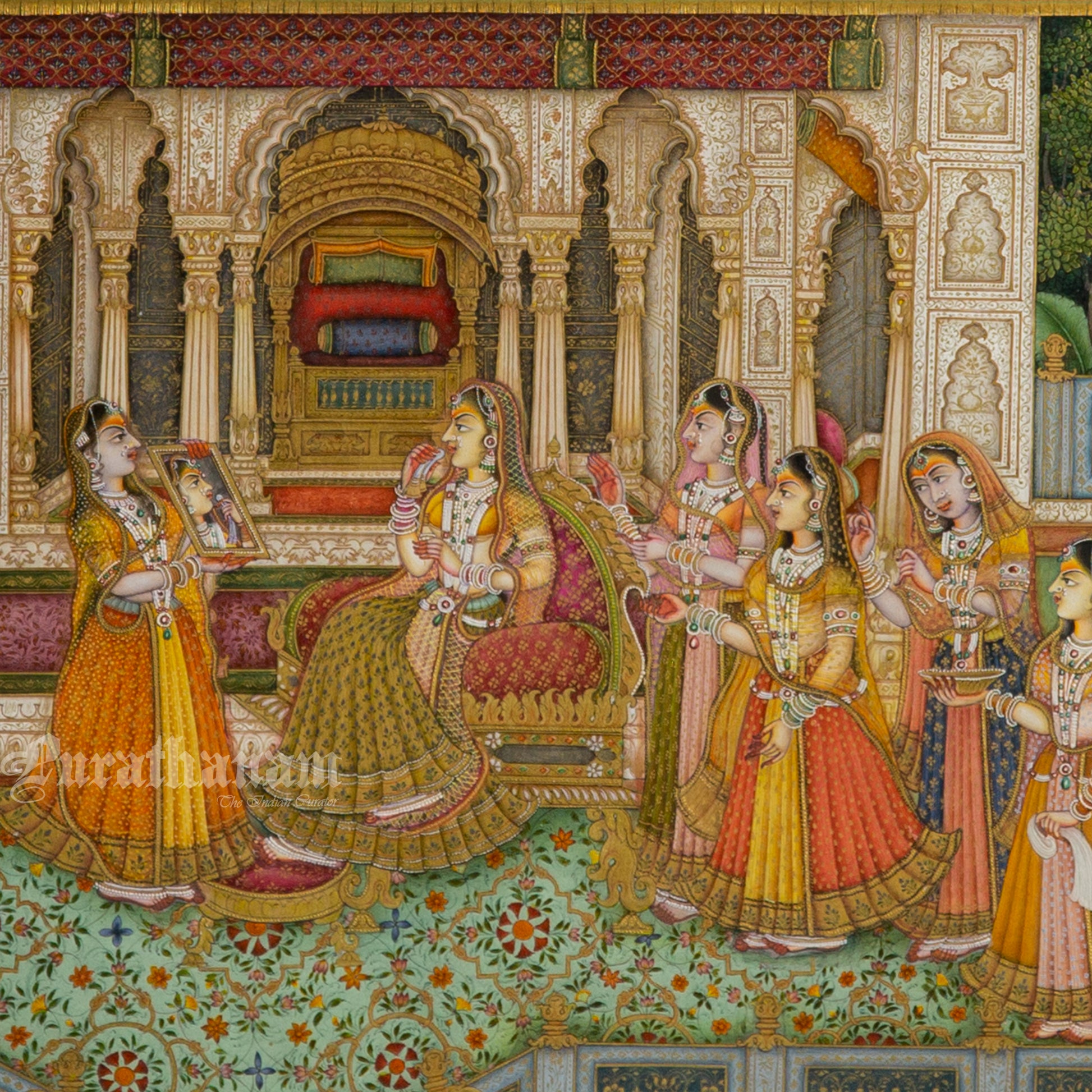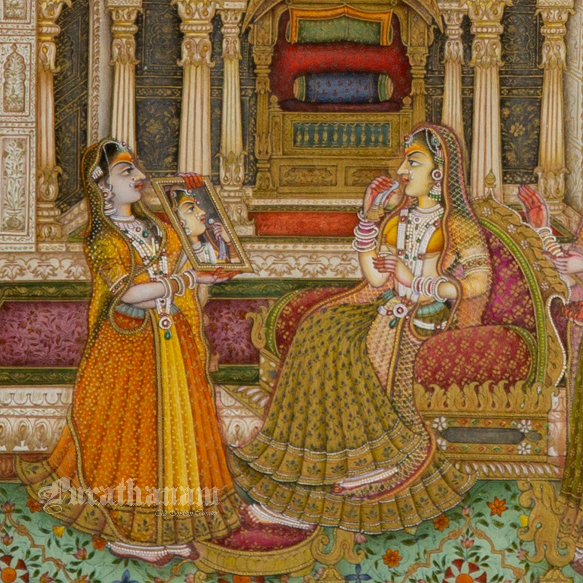 This is a beautiful Rajasthani miniature painting, created in 1970-80s in Jaipur, Rajasthan. It captures a quiet, graceful moment inside the royal ‘Zenana’—the women’s quarters of a palace where the queen or princess is seated in her garden courtyard, surrounded by her companions or attendees. The depiction shows that one of the Queen’s attendants holding a mirror, while another one brings her a bowl of water and a piece of cloth and rest of them looking puzzled. The atmosphere is soft and intimate, full of elegance, friendship, and the quiet beauty of life behind palace walls.
