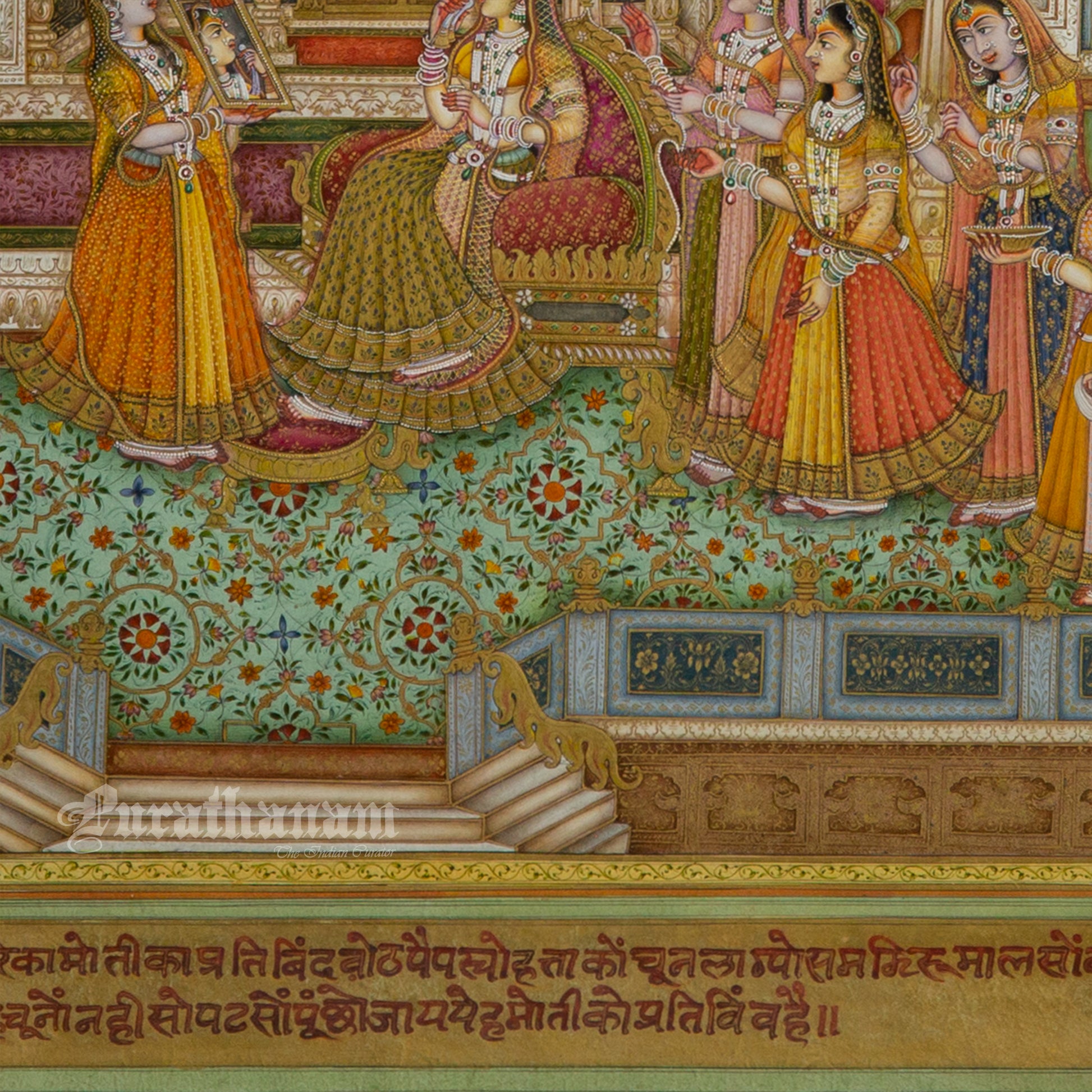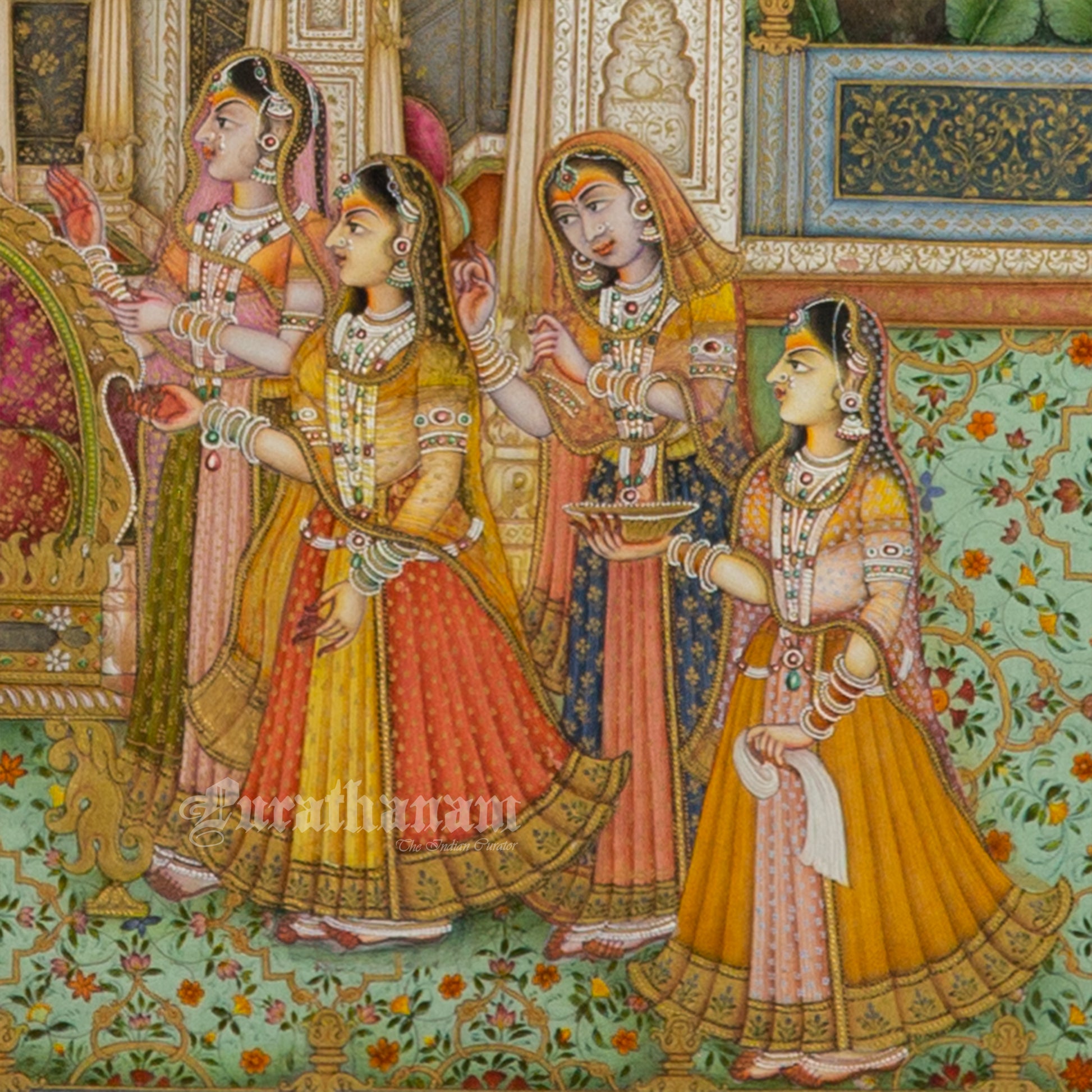 This Miniature painting “The Royal Zenana” was made using watercolours and real gold leaf on paper. It follows the classic miniature tradition, known for its intricate details, fine lines, and graceful elegance.
