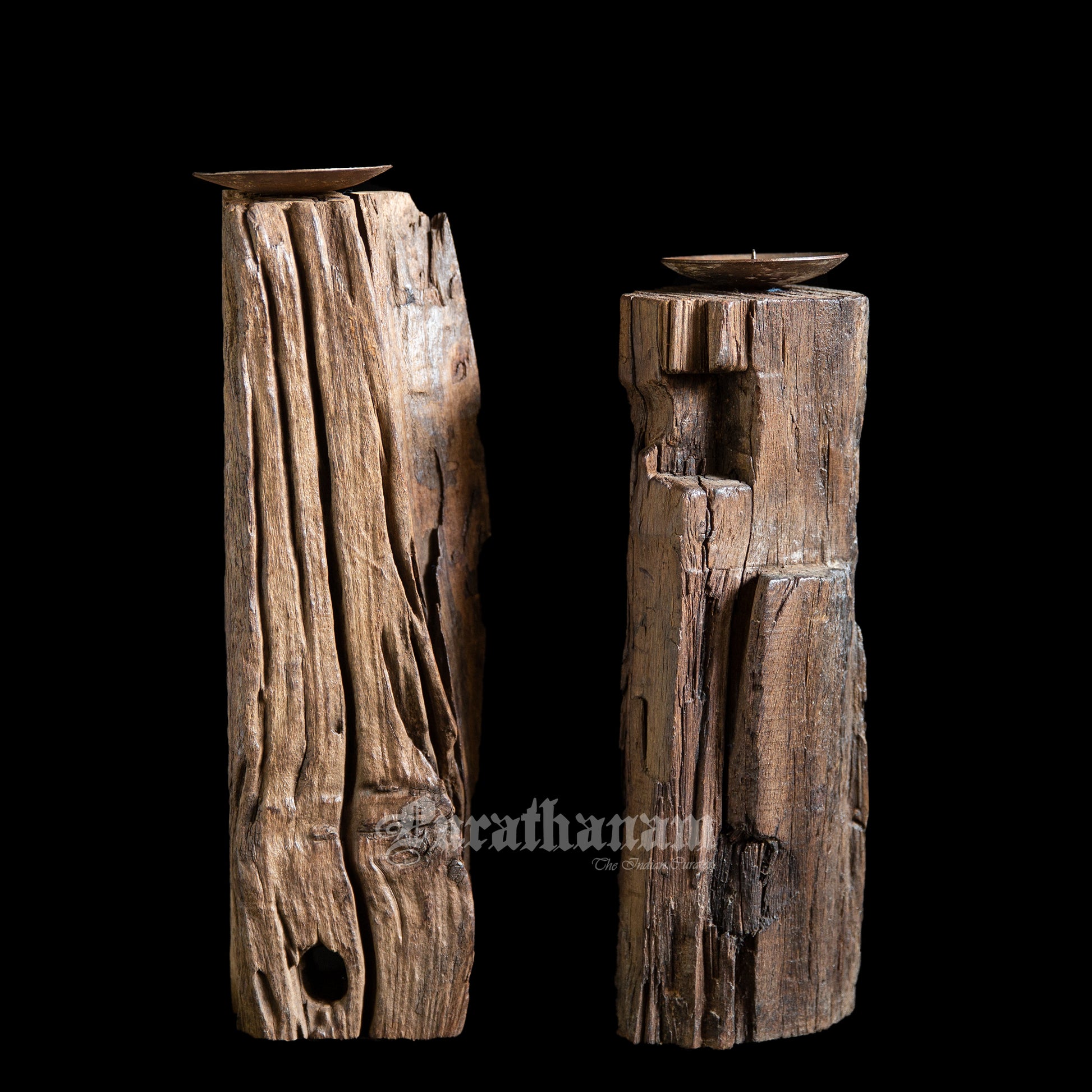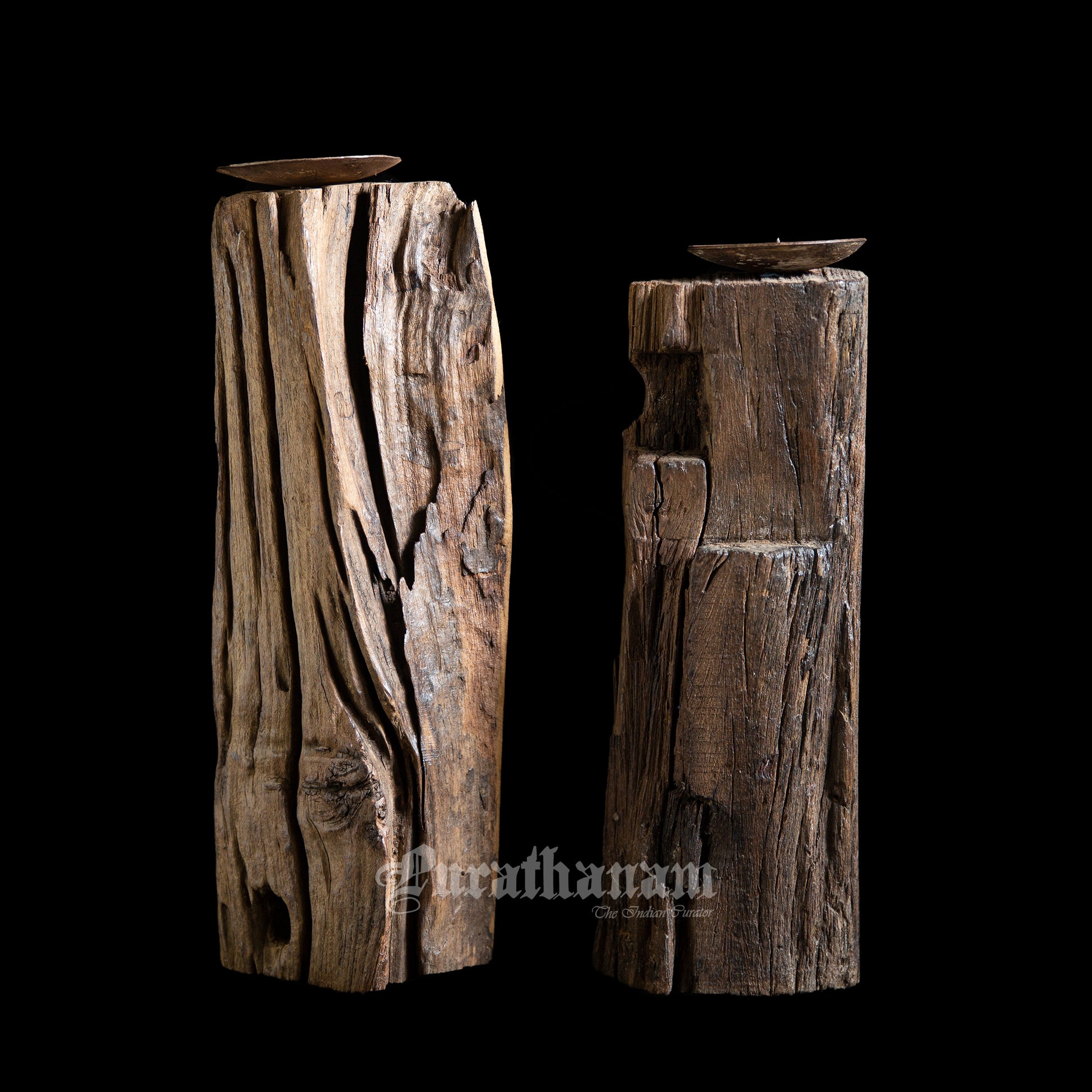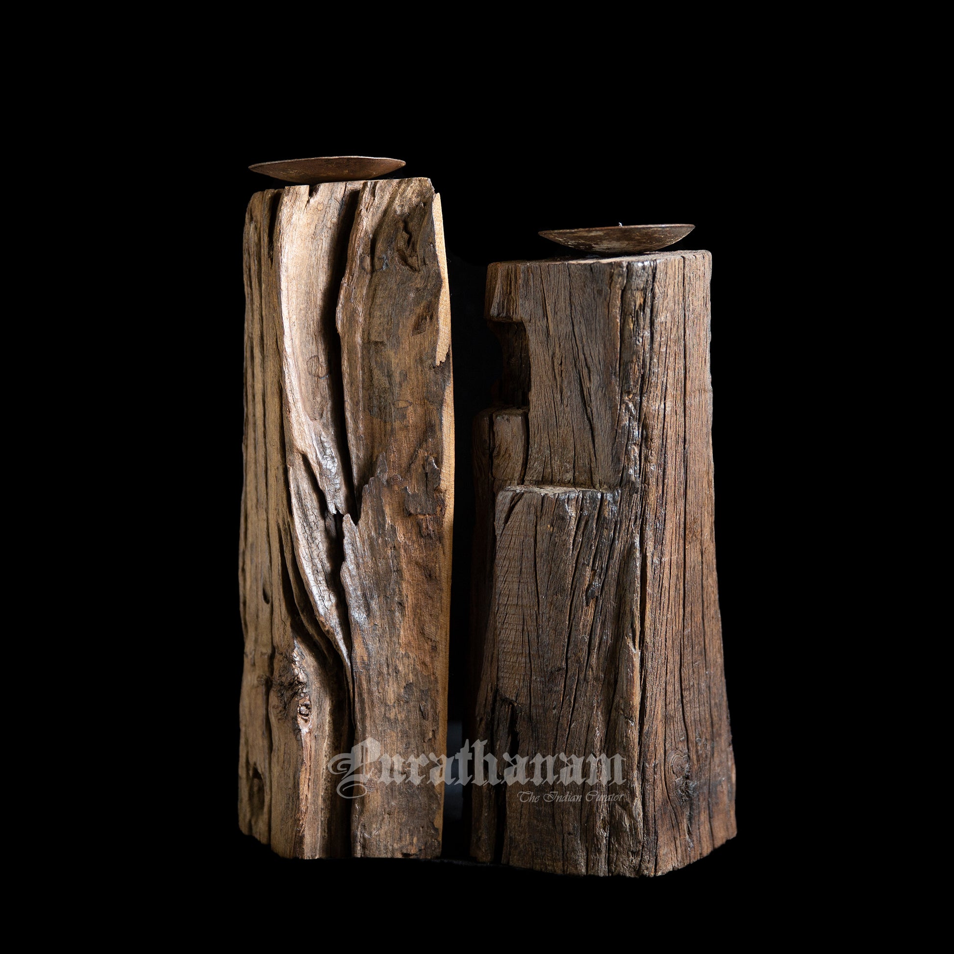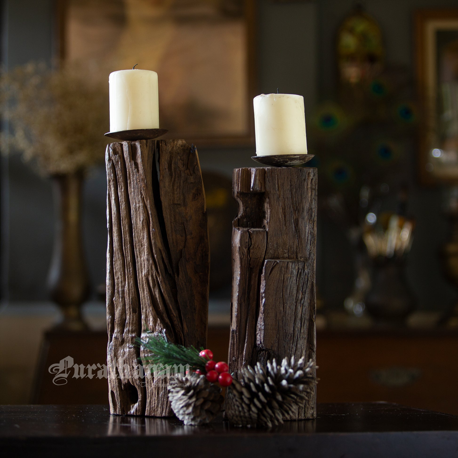 Description: We have here a pair of rustic wooden candle sticks up-cycled from old door frame.