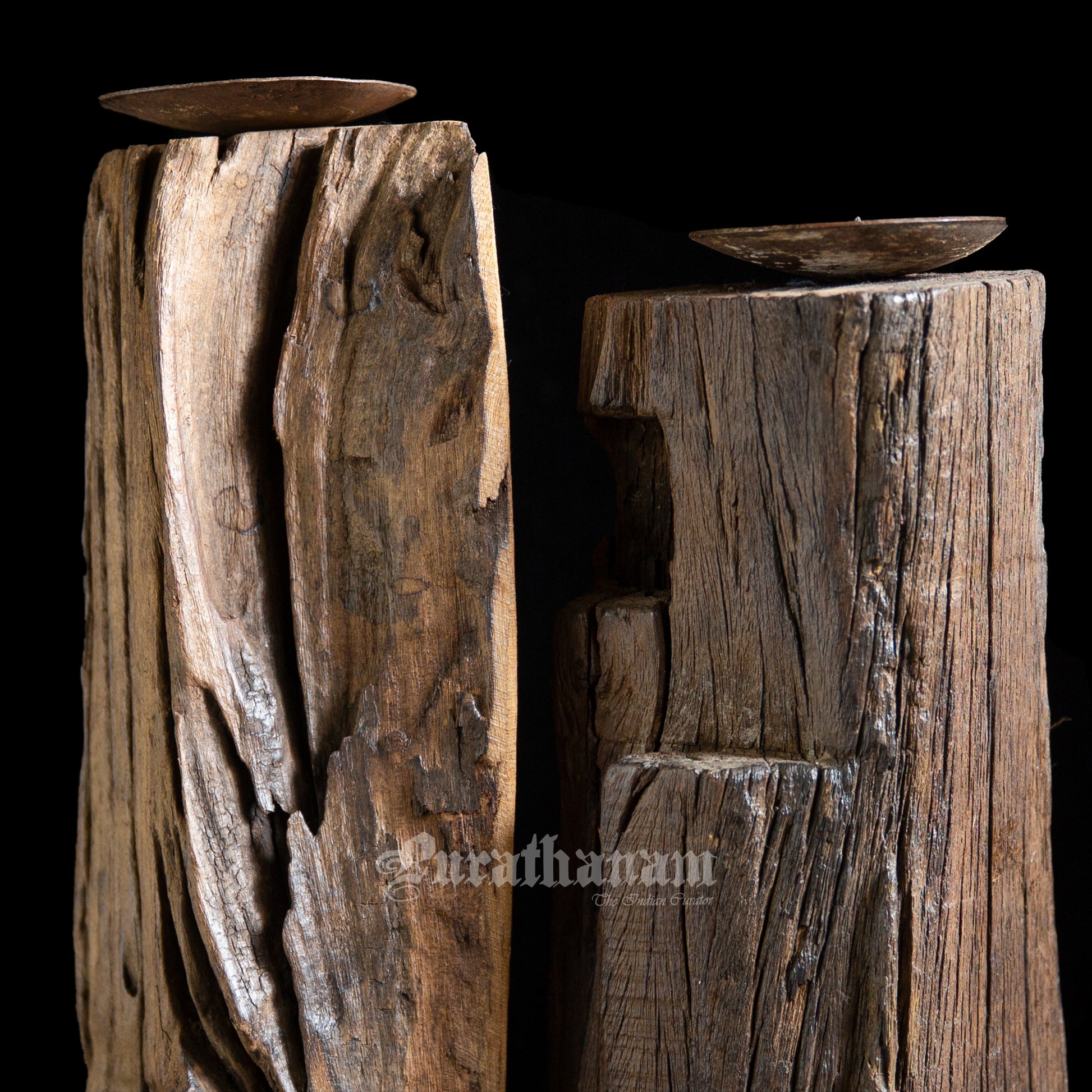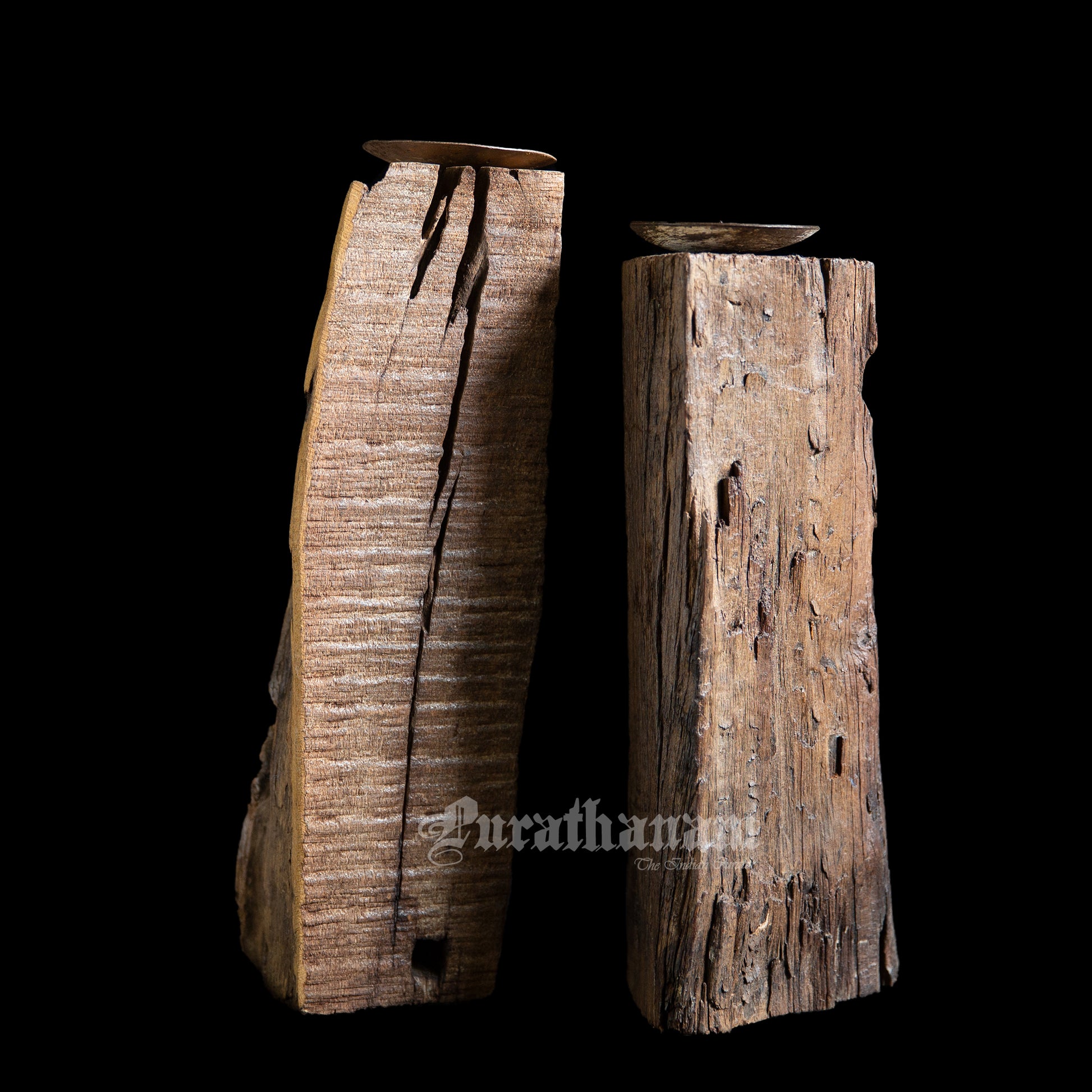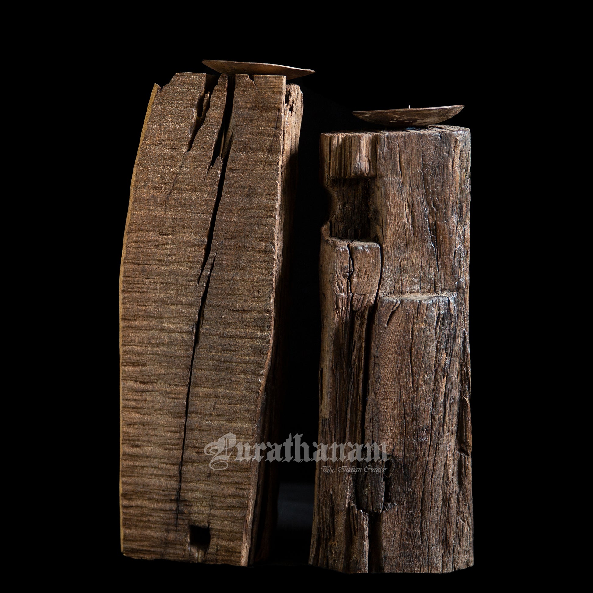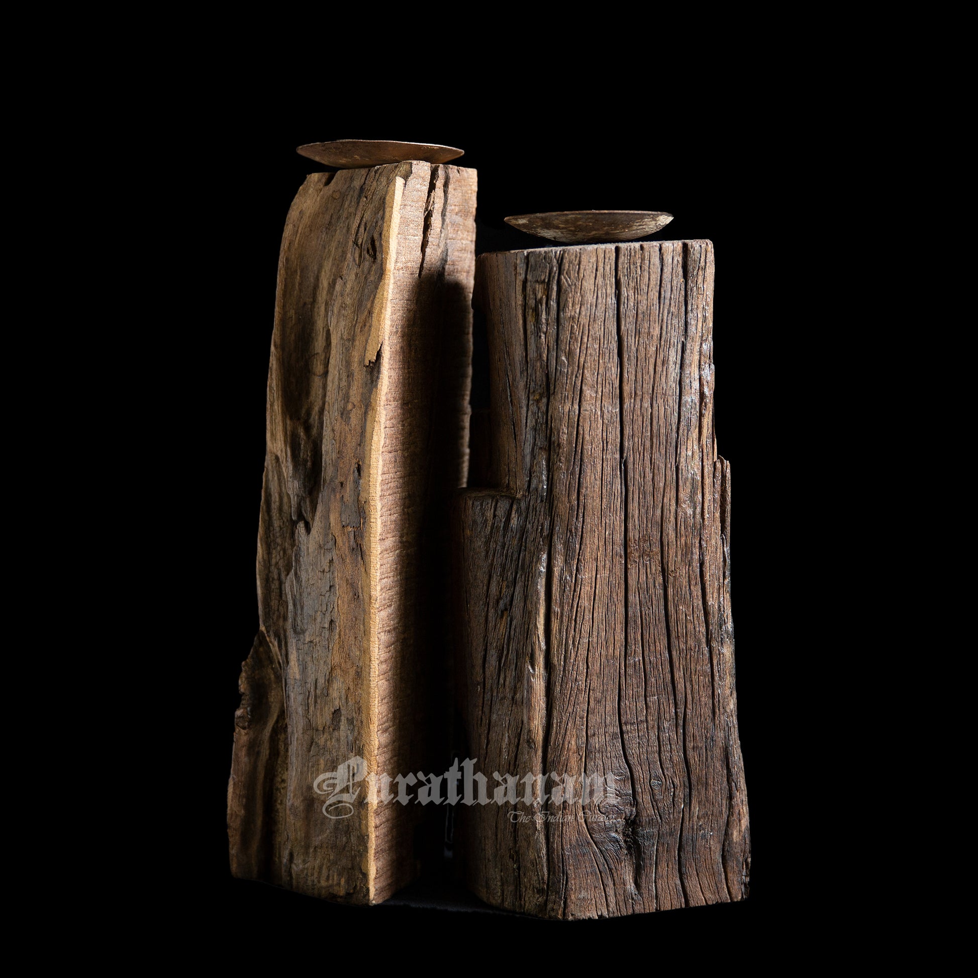 Description: We have here a pair of rustic wooden candle sticks up-cycled from old door frame.