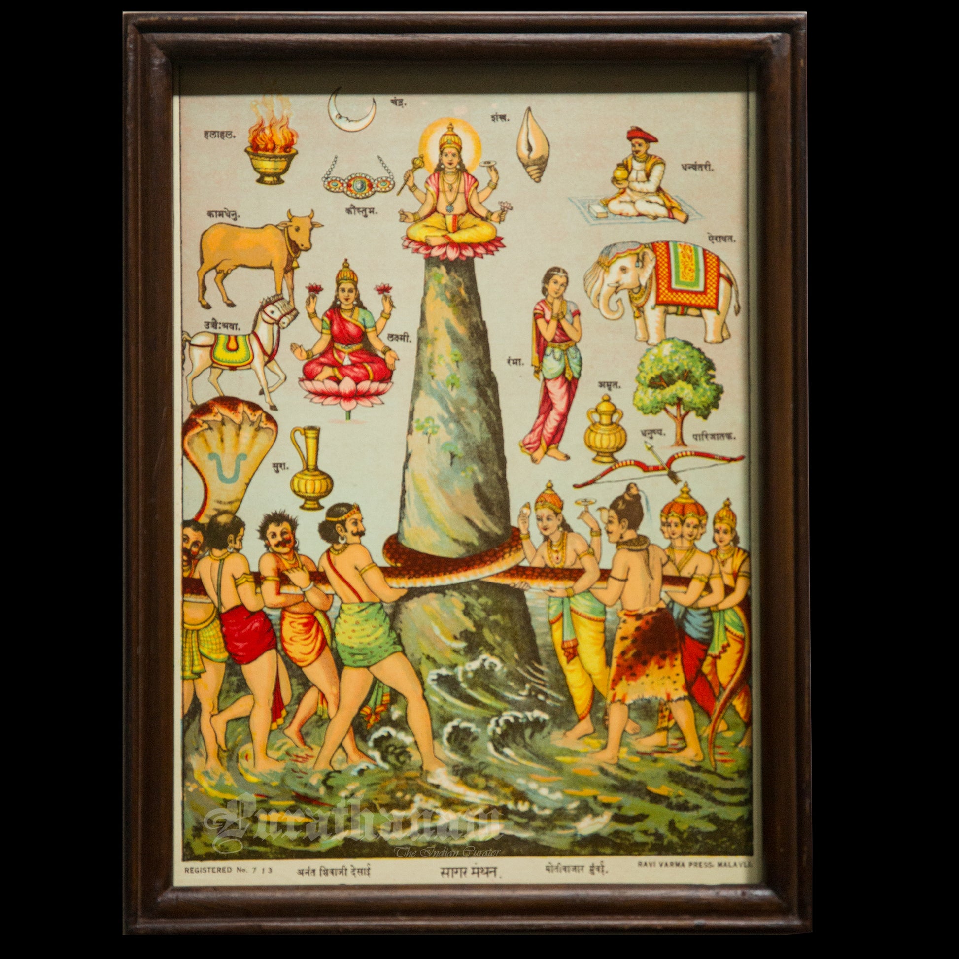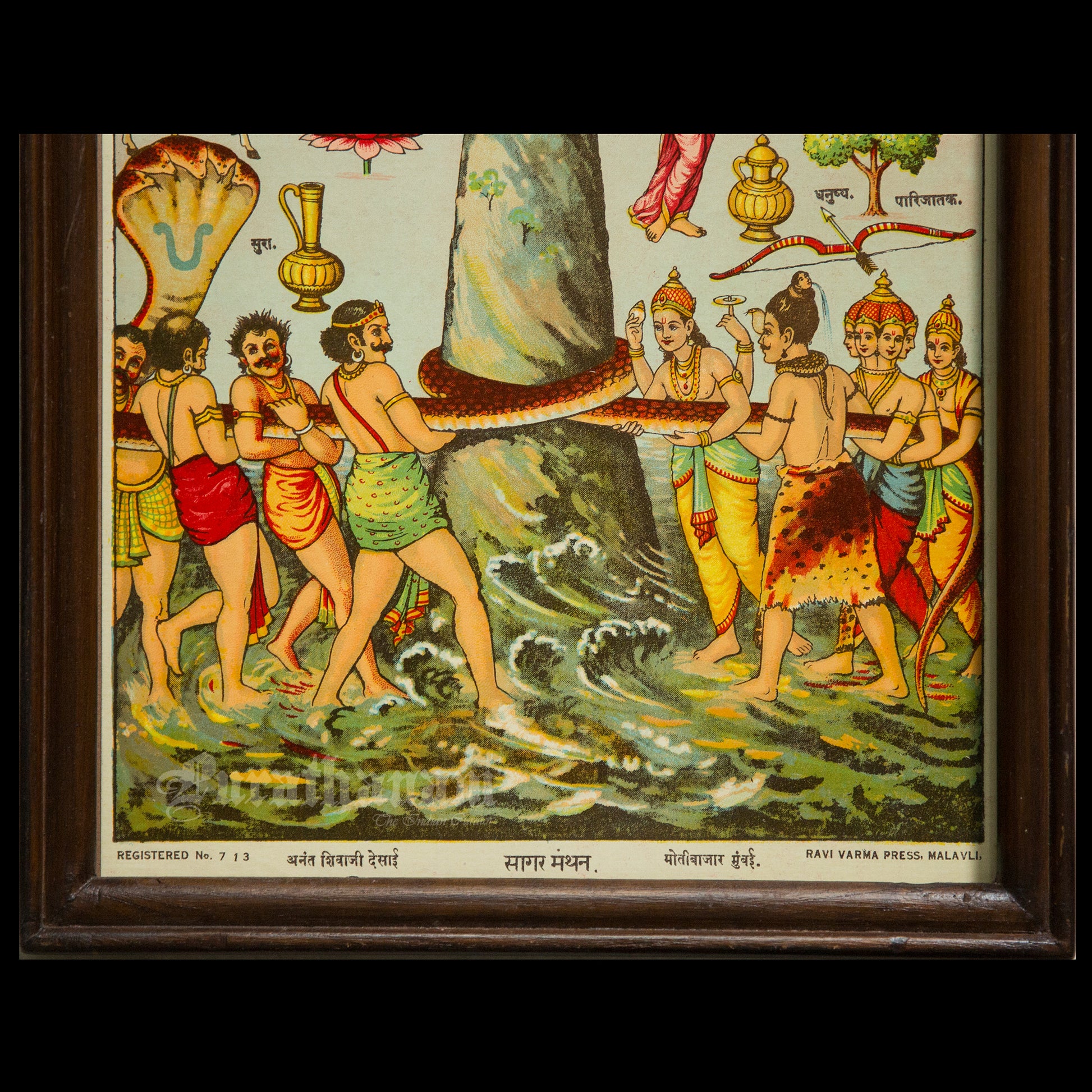 This is an oleograph print from 1920s- 1930s of Sagar Manthan by Ravi Varma an Indian painter who achieved recognition for his depiction of scenes from the epics of the Mahabharata and Ramayana.