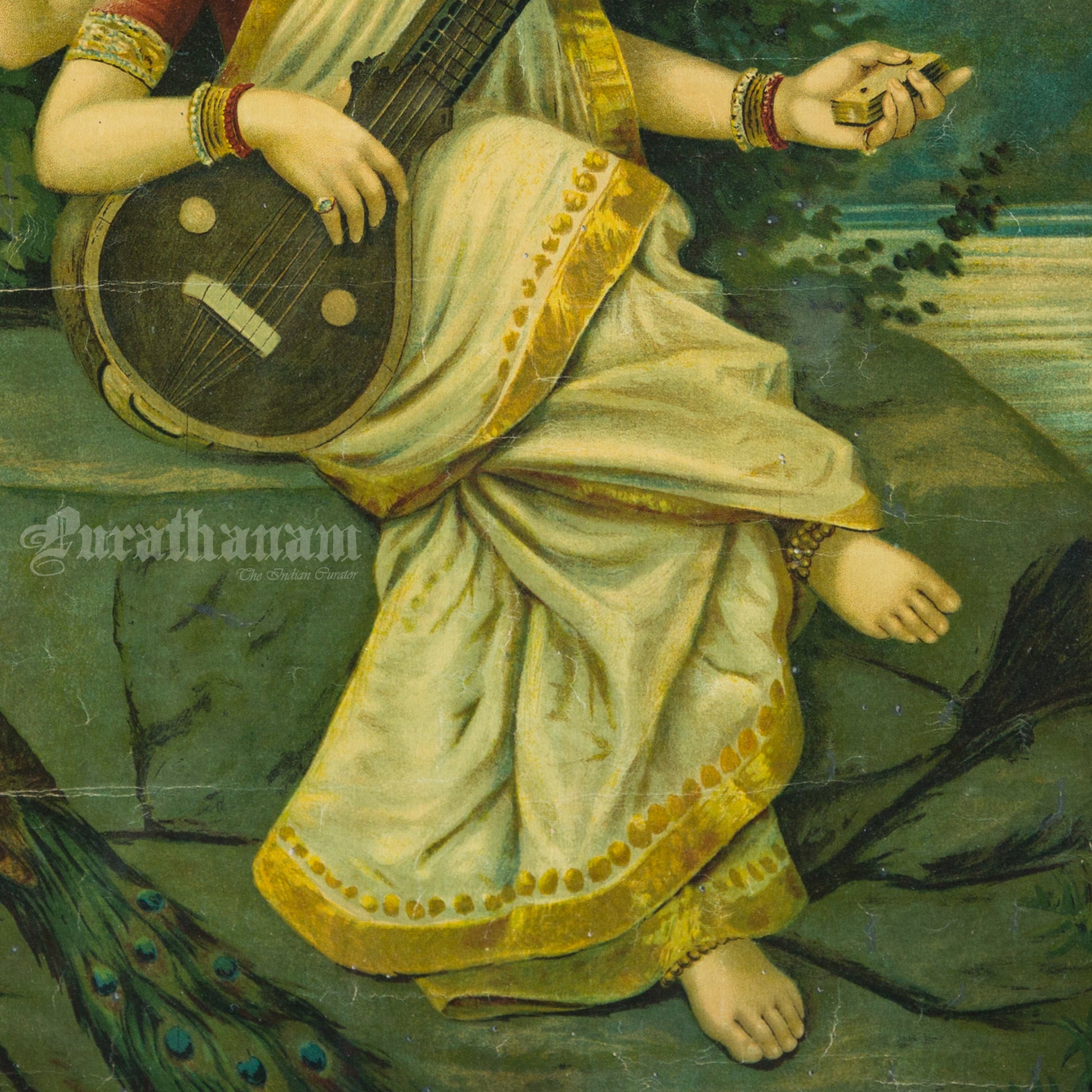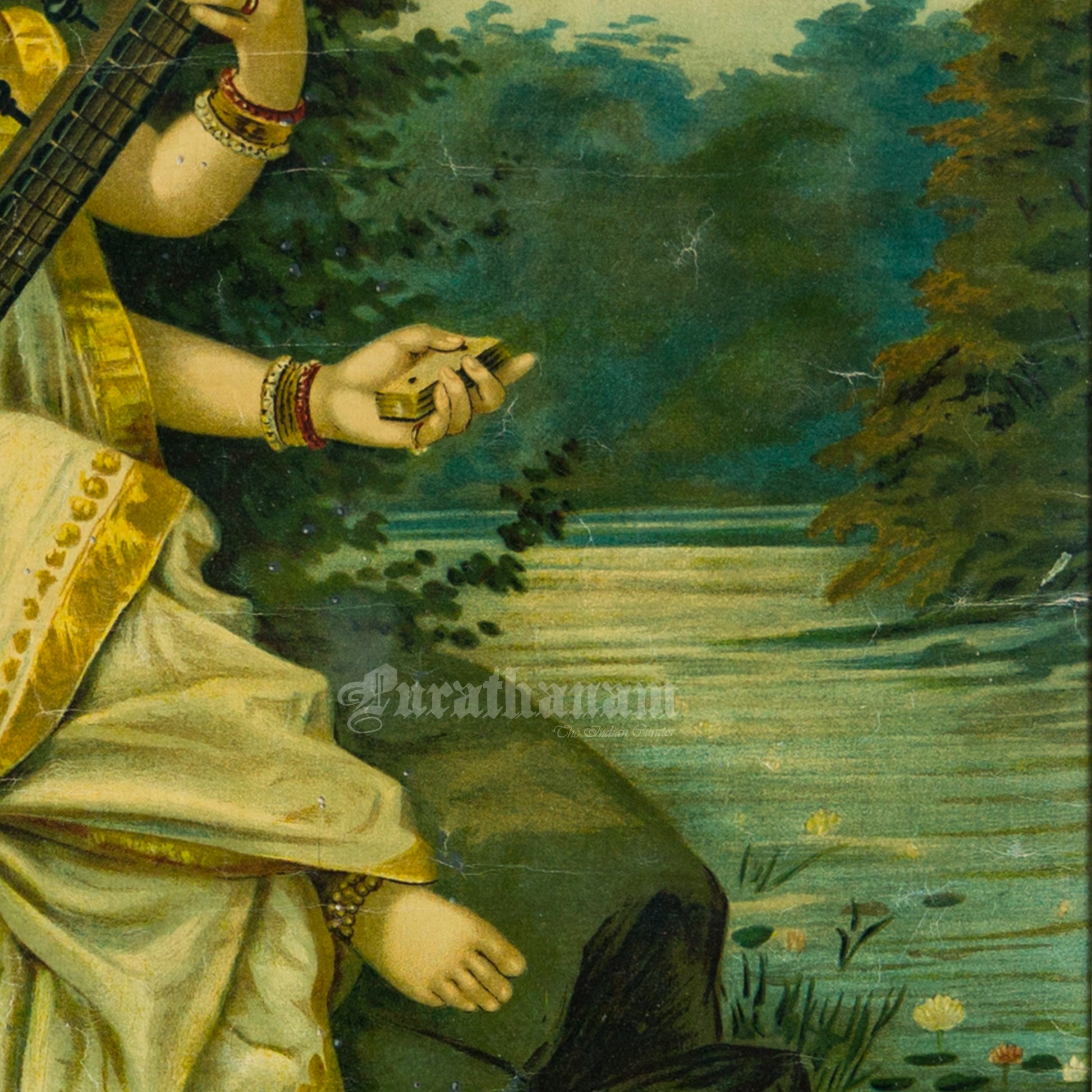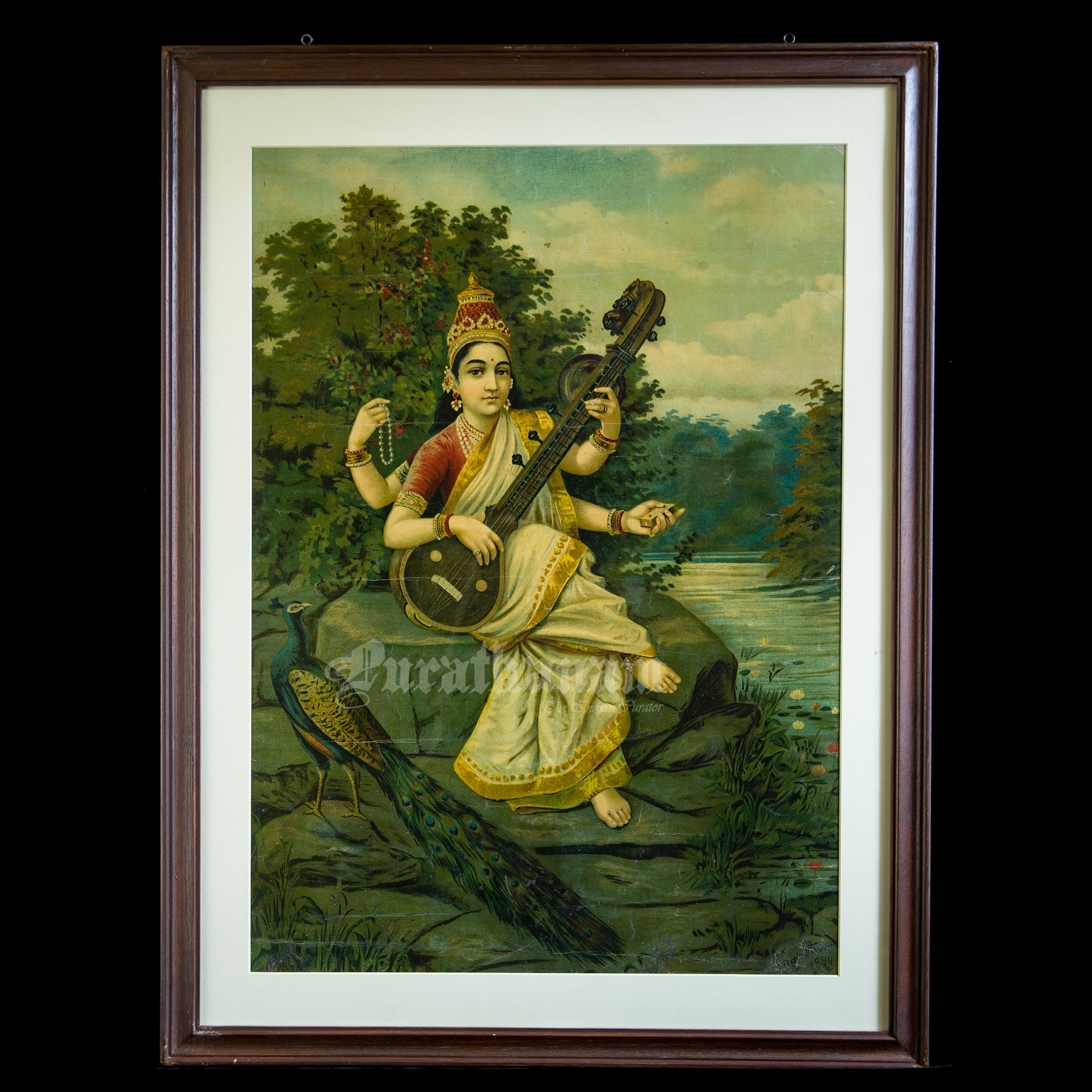 This is an oleograph print from 1920s of Saraswati by Ravi Varma an Indian who achieved recognition for his depiction of scenes from the epics of the Mahabharata and Ramayana.
