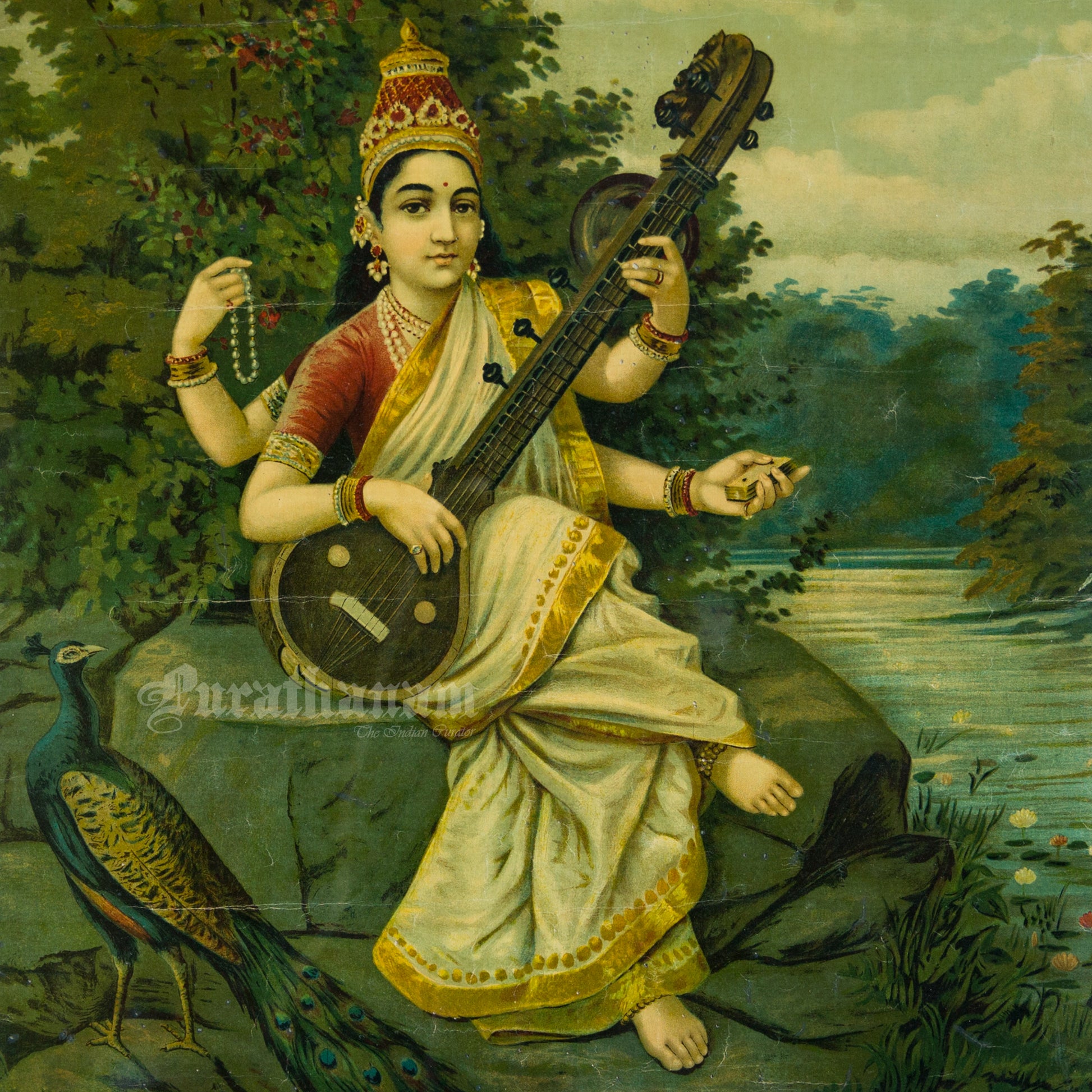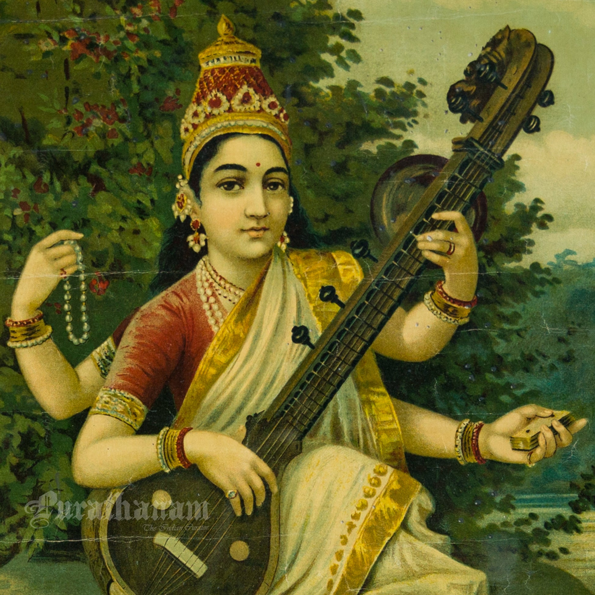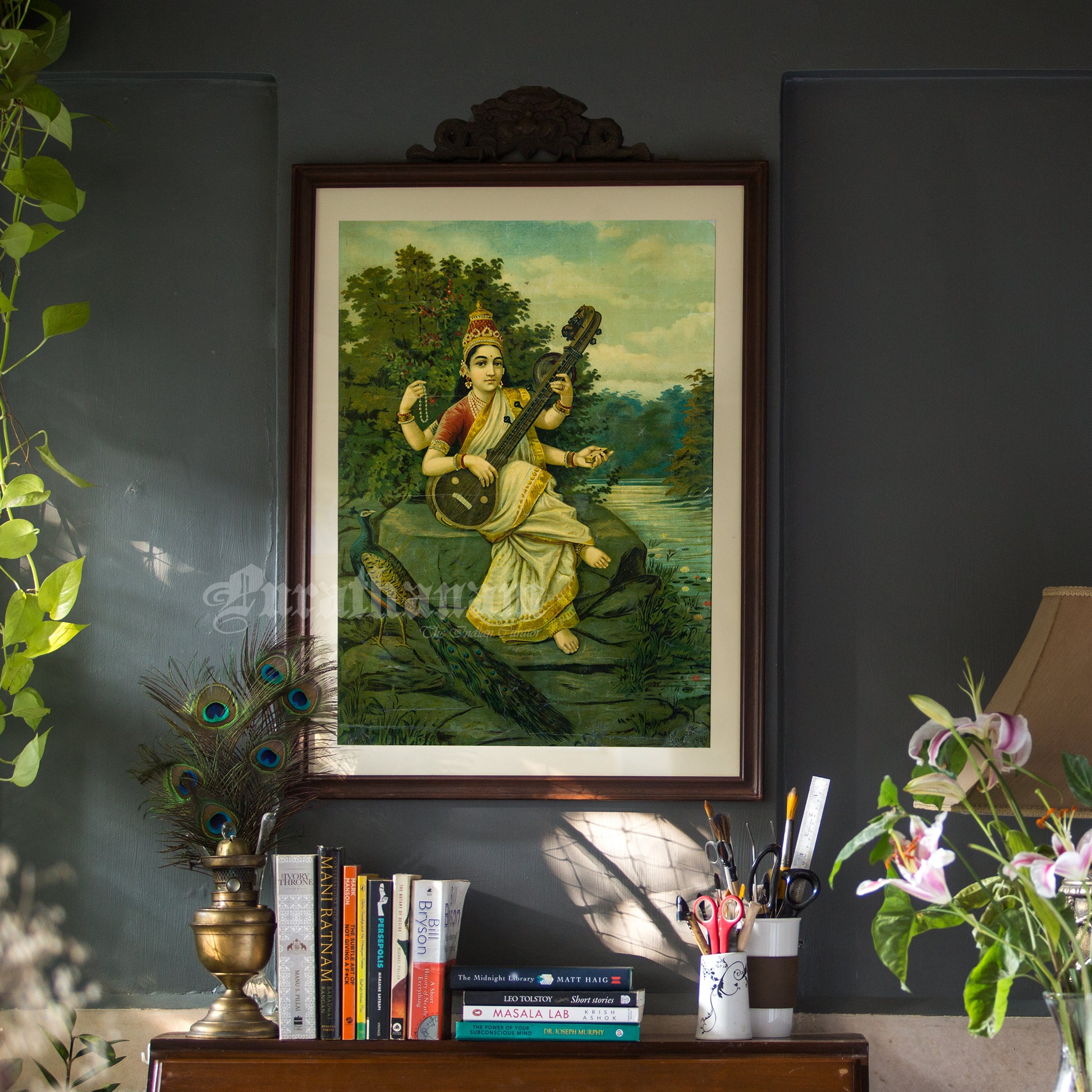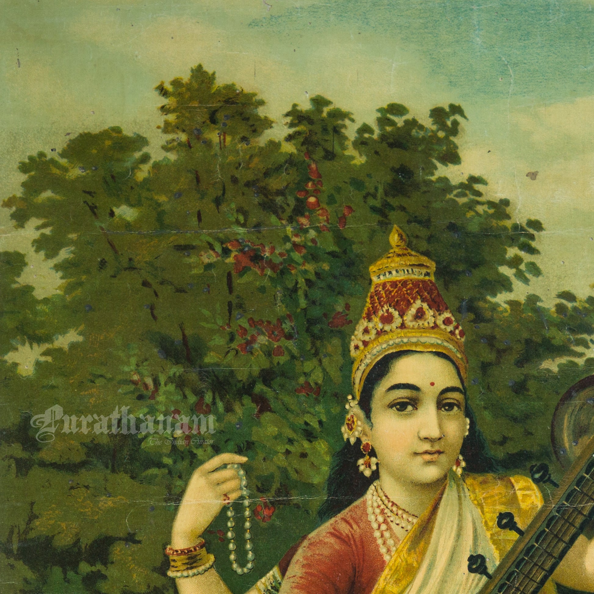This is an oleograph print from 1920s of Saraswati by Ravi Varma an Indian who achieved recognition for his depiction of scenes from the epics of the Mahabharata and Ramayana.