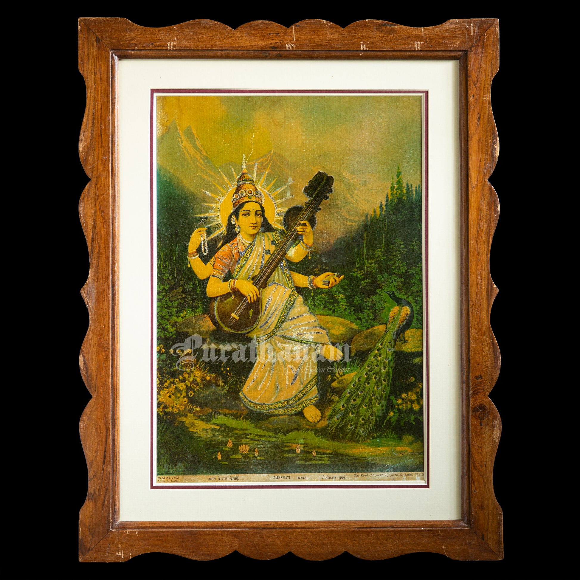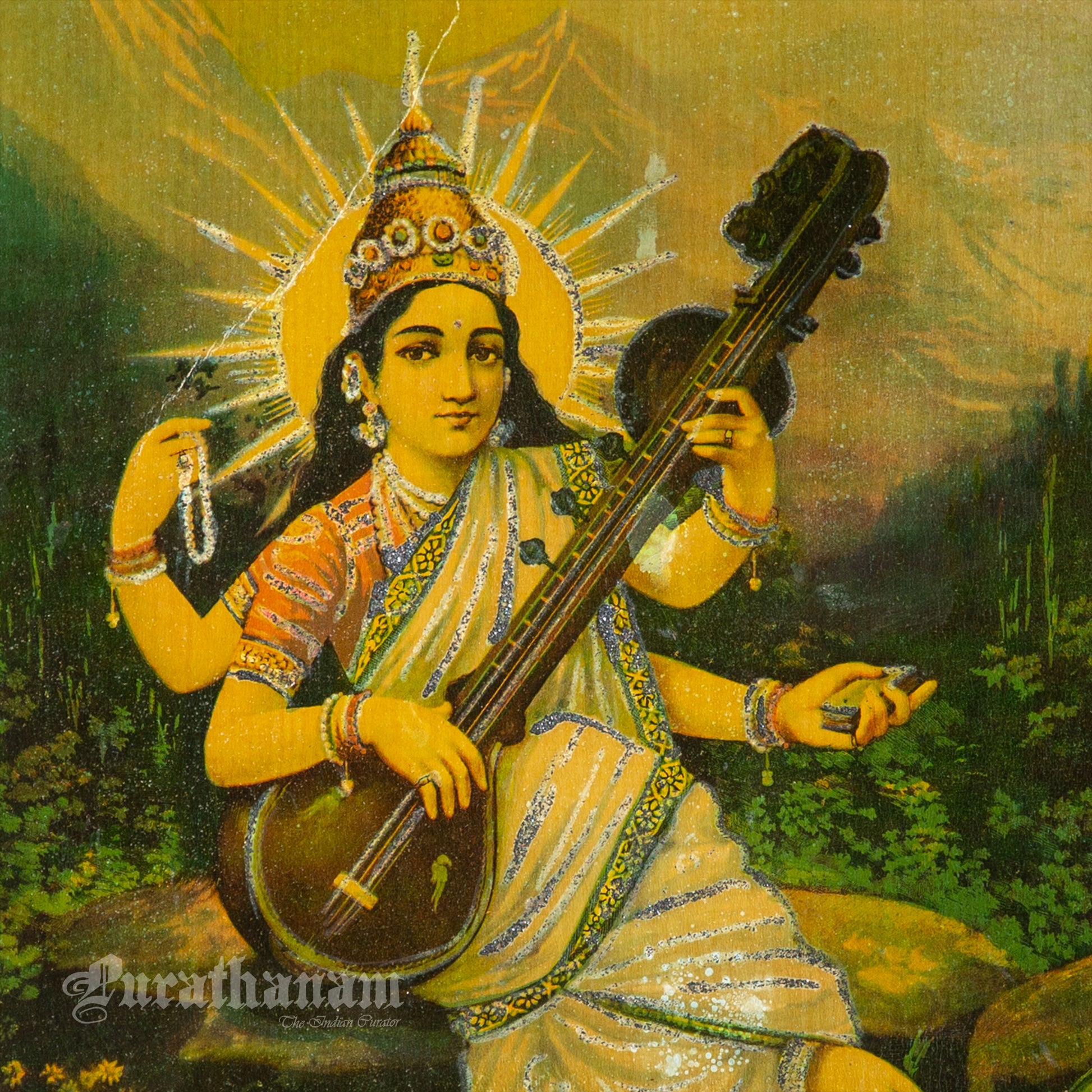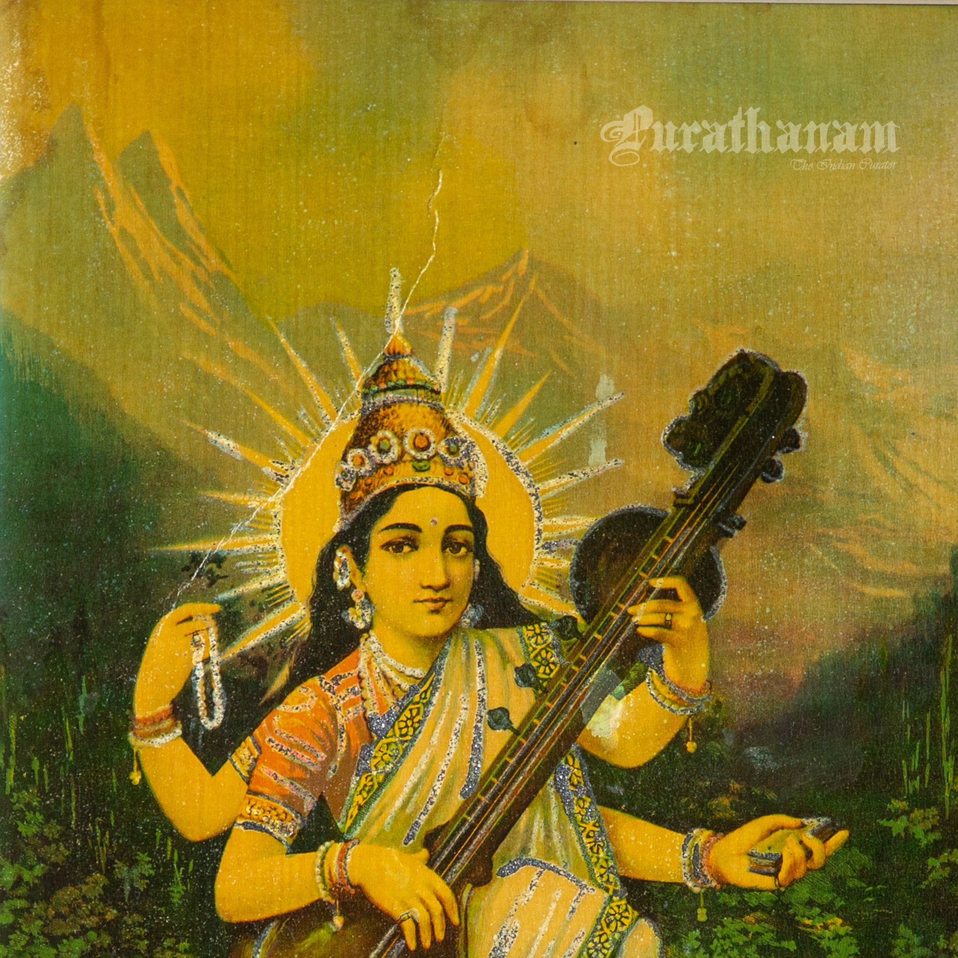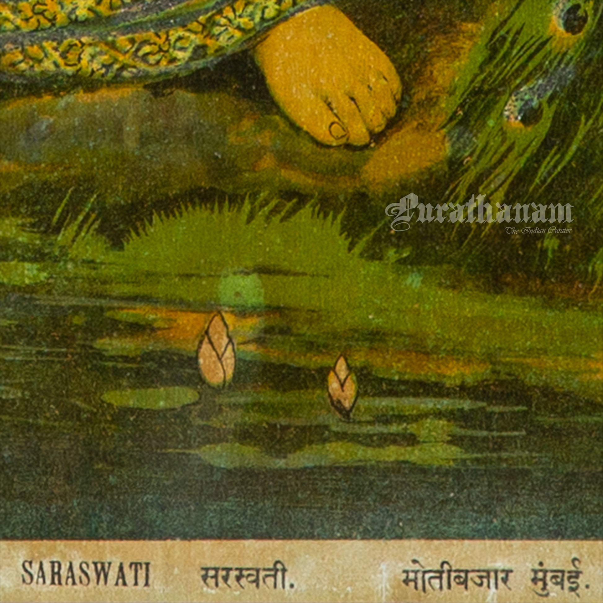 This is an Oleograph print from 1920s of Saraswati from M. A. Joshi & Co. The print is embellished with silver sparkling powder.