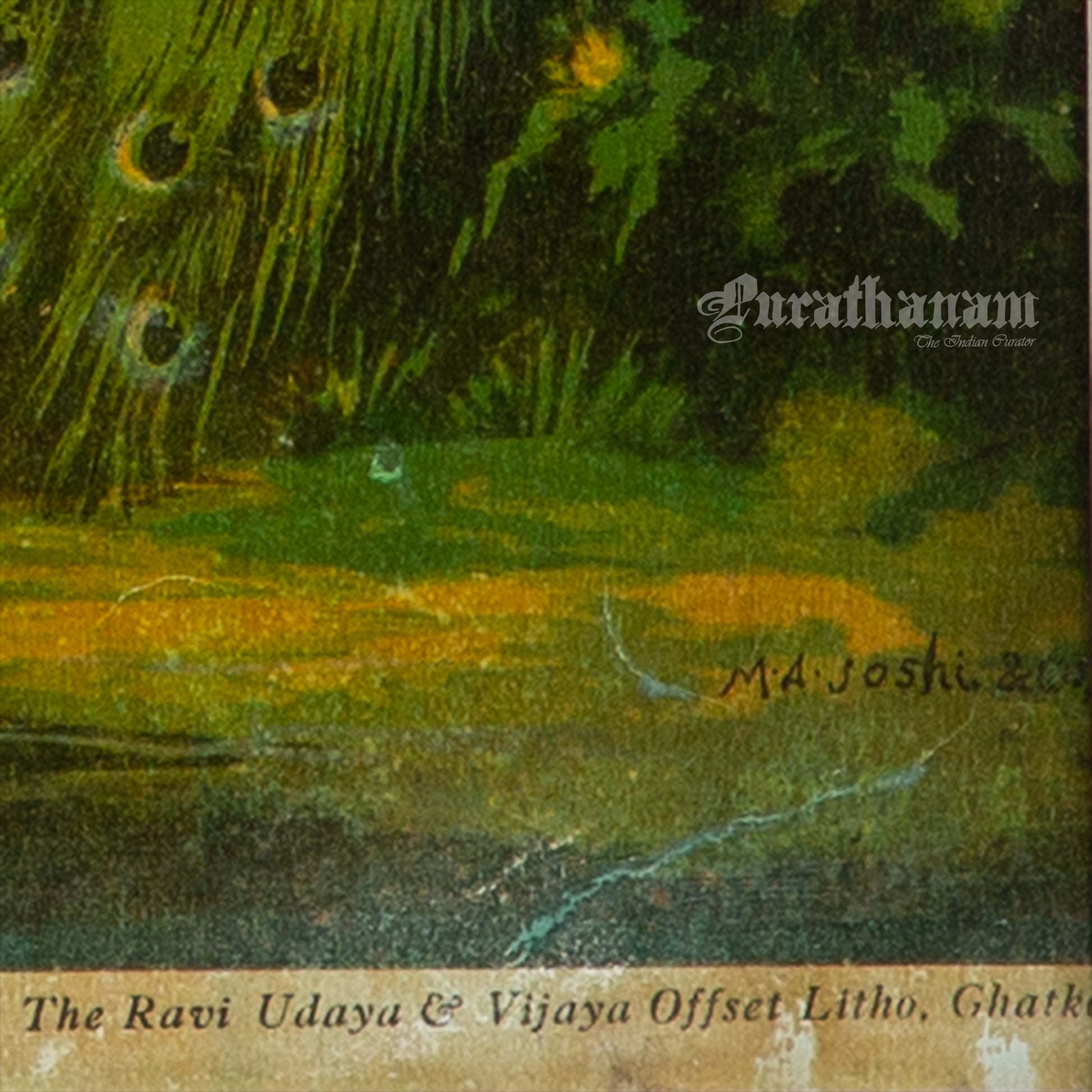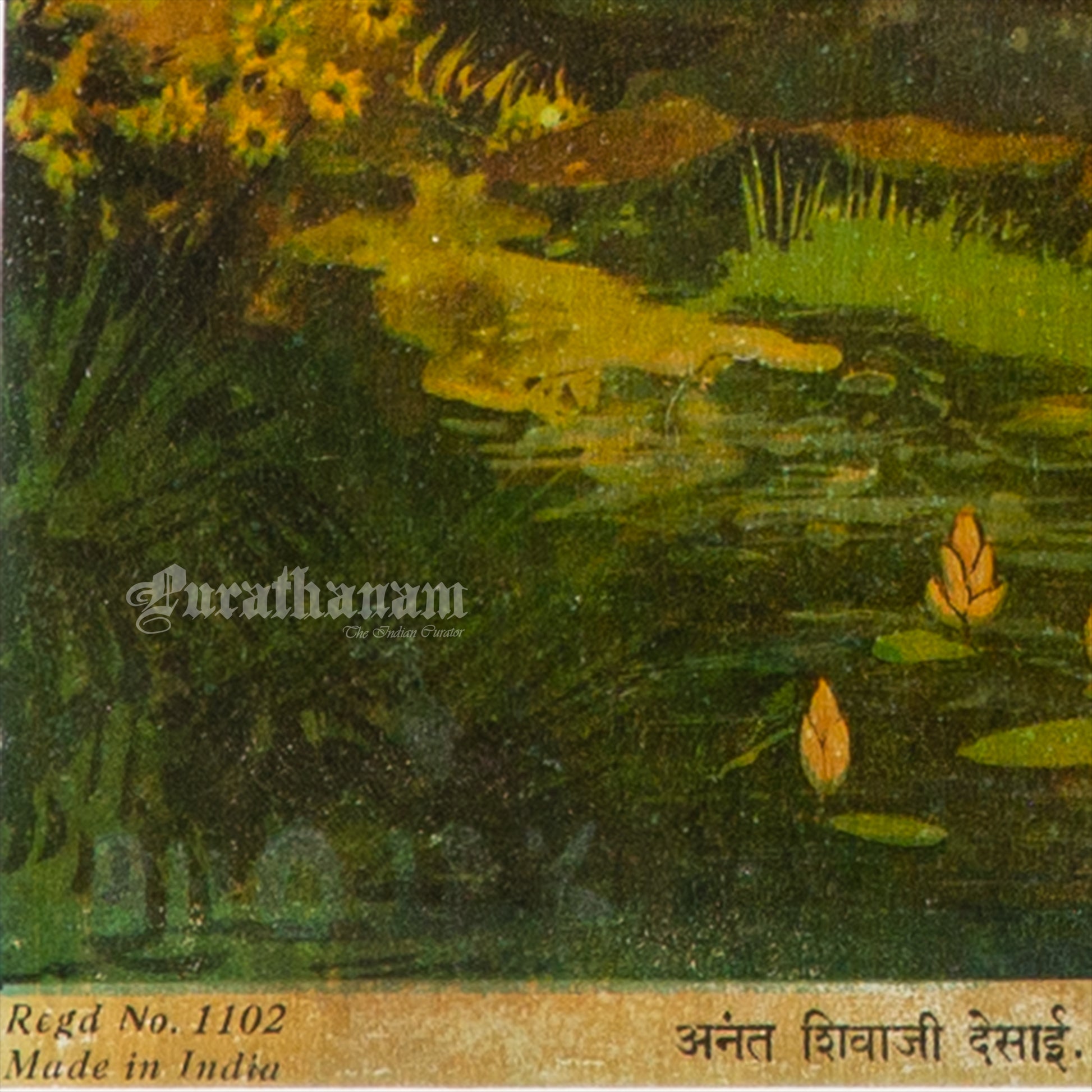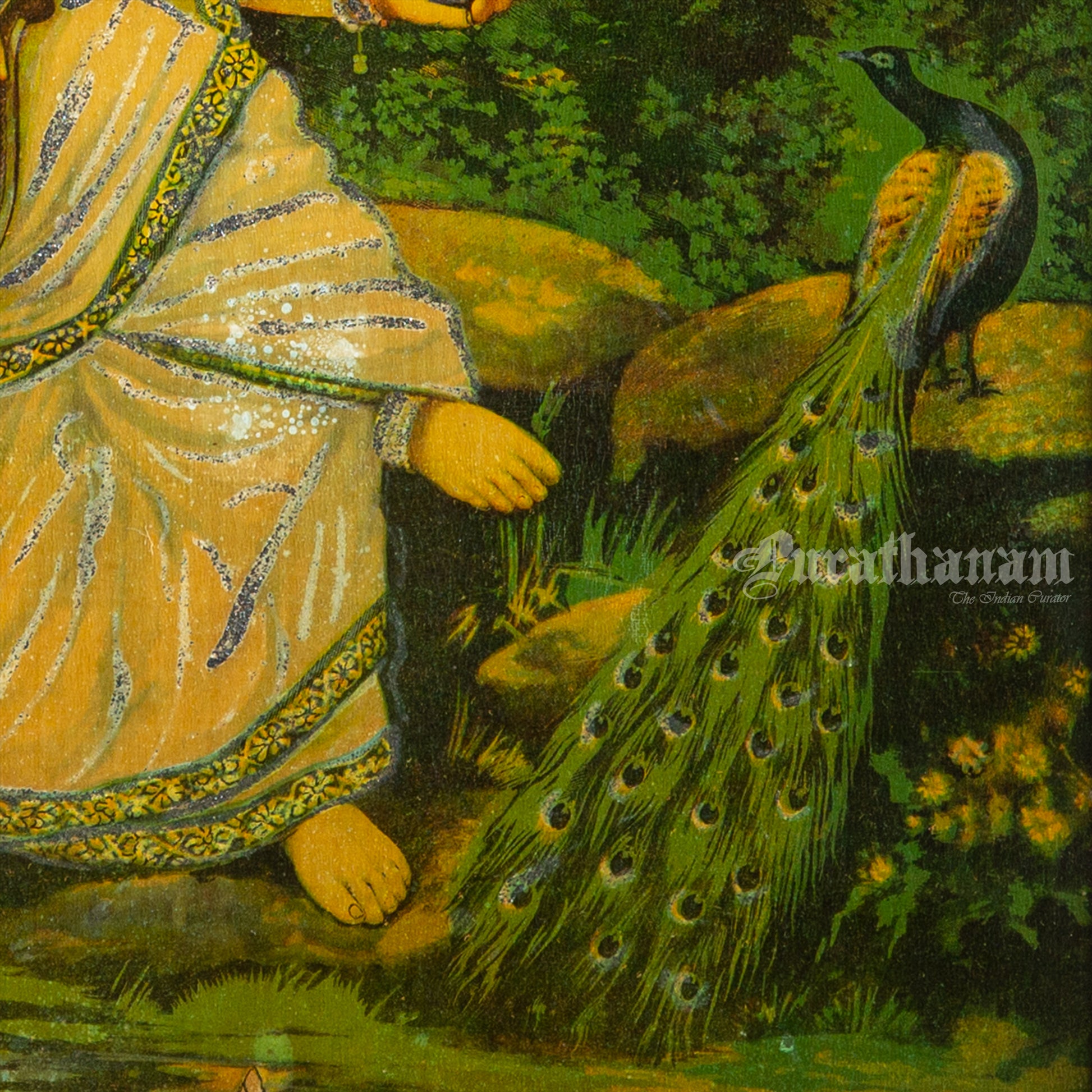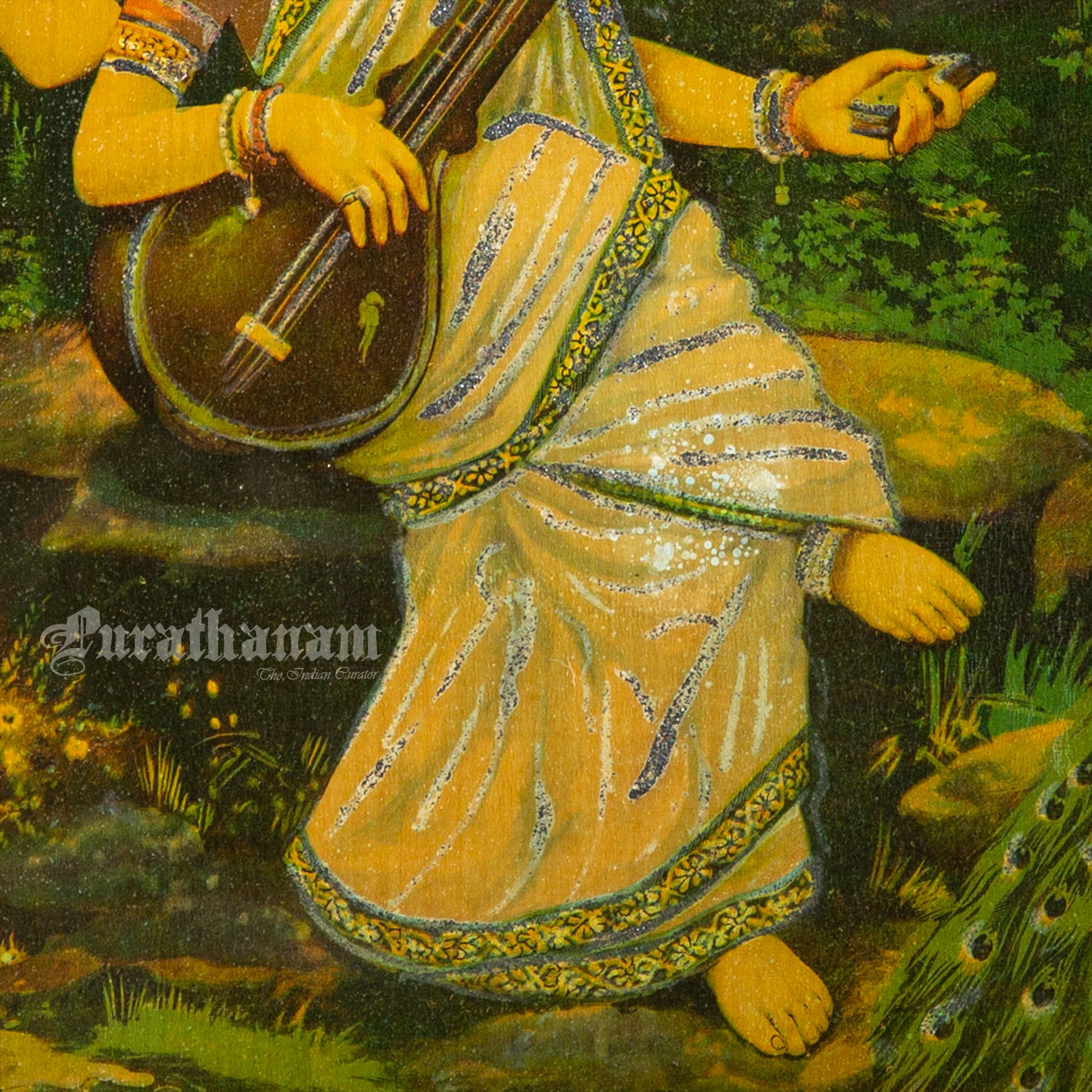 This is an Oleograph print from 1920s of Saraswati from M. A. Joshi & Co. The print is embellished with silver sparkling powder.
