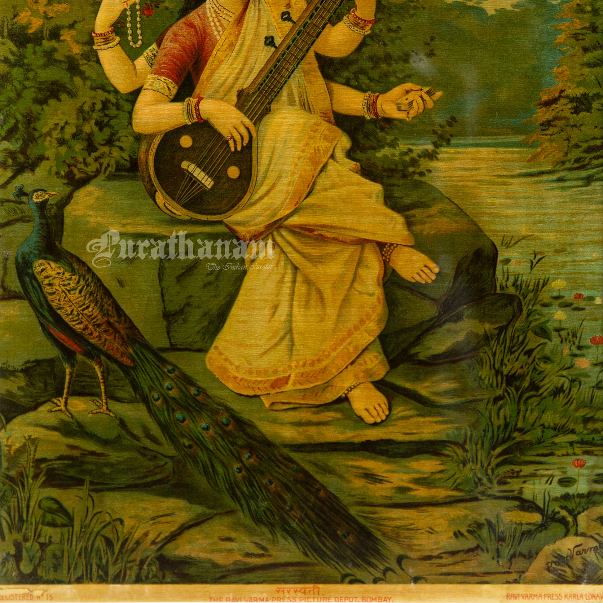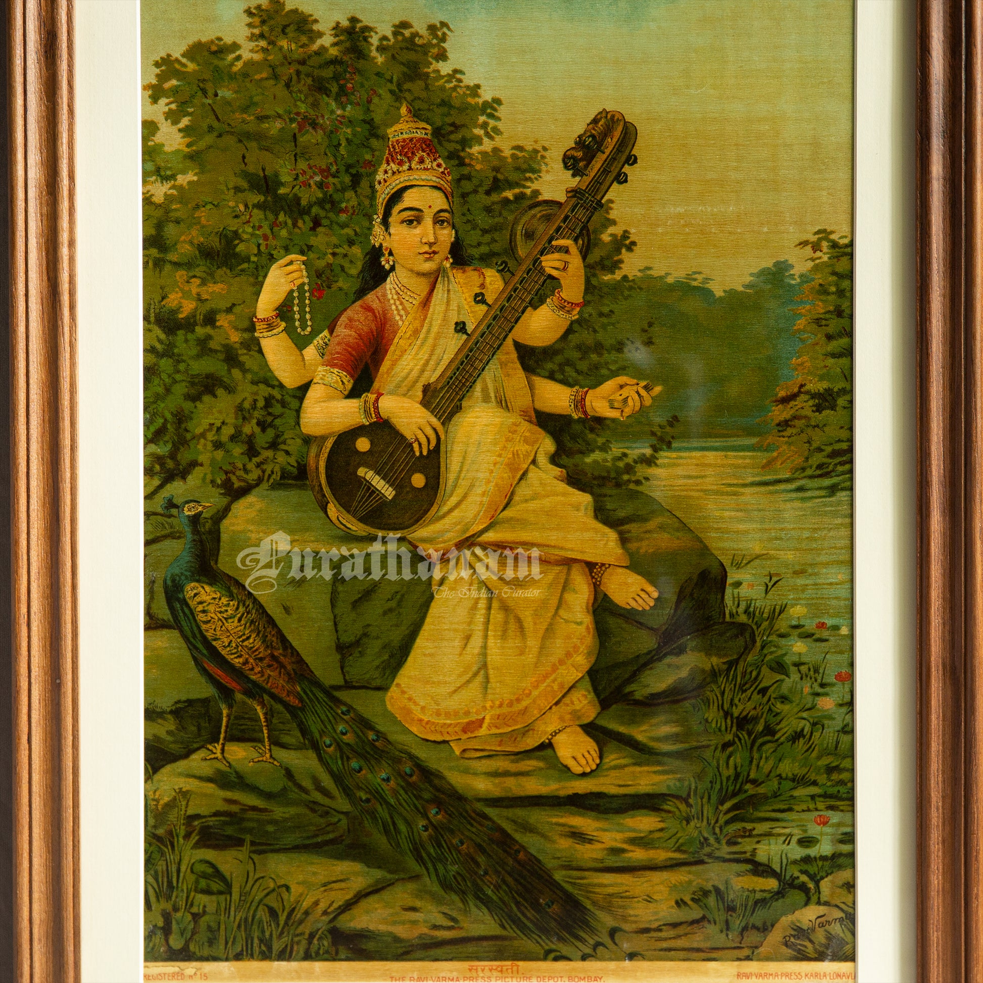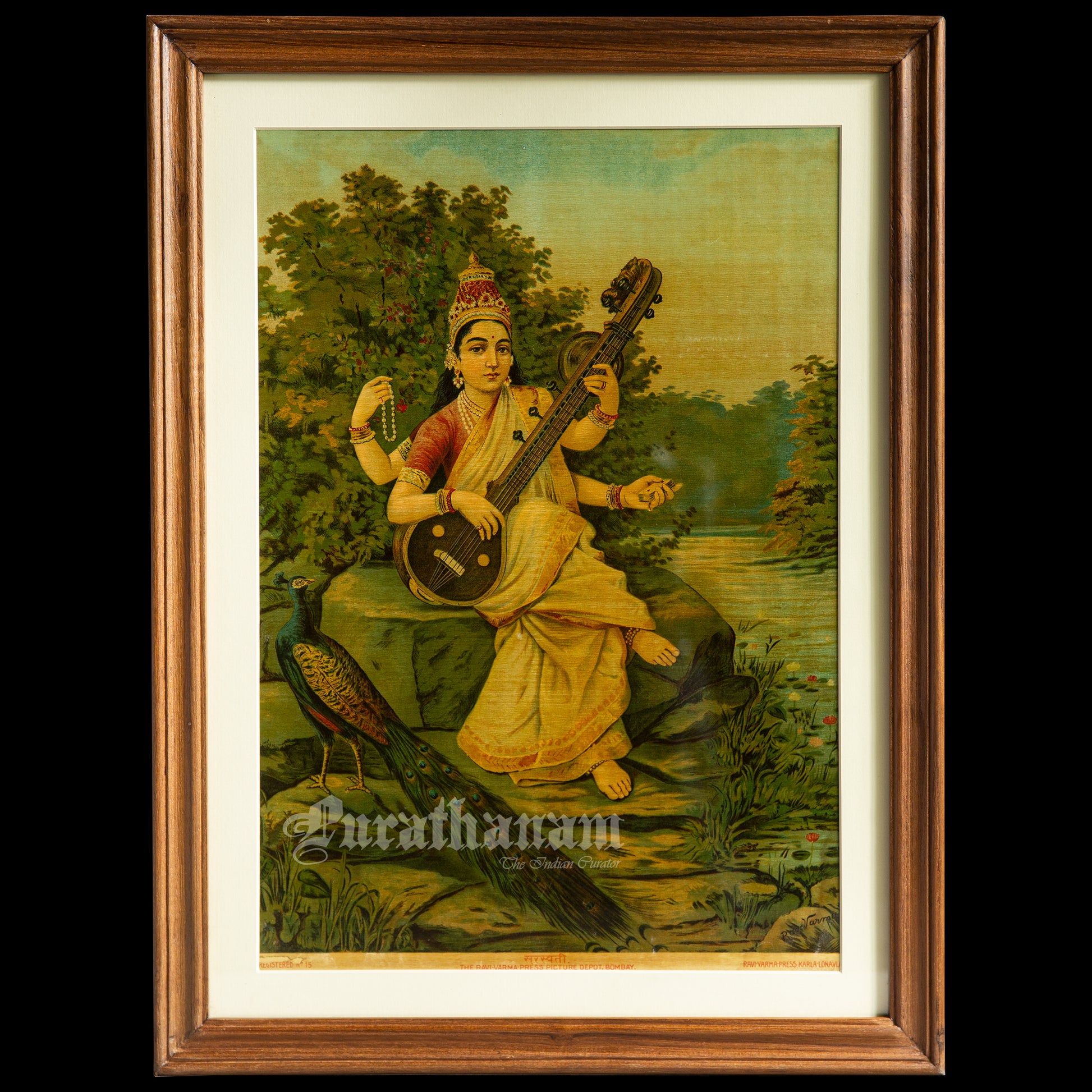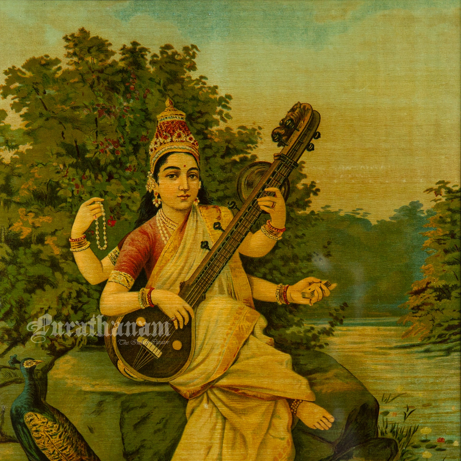 This is an oleograph print from 1920s of Sarasaati by Ravi Varma an Indian artist who achieved recognition for his depiction of scenes from the epics of the Mahabharata and Ramayana.