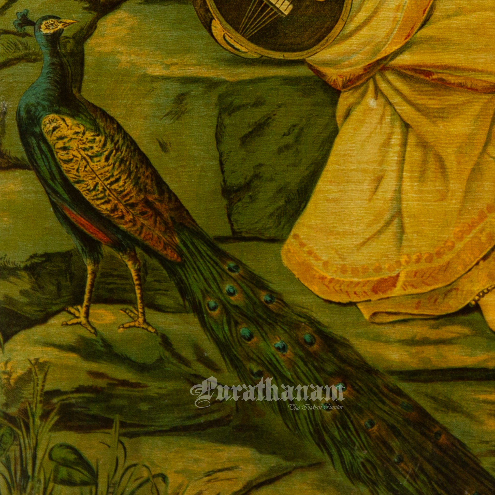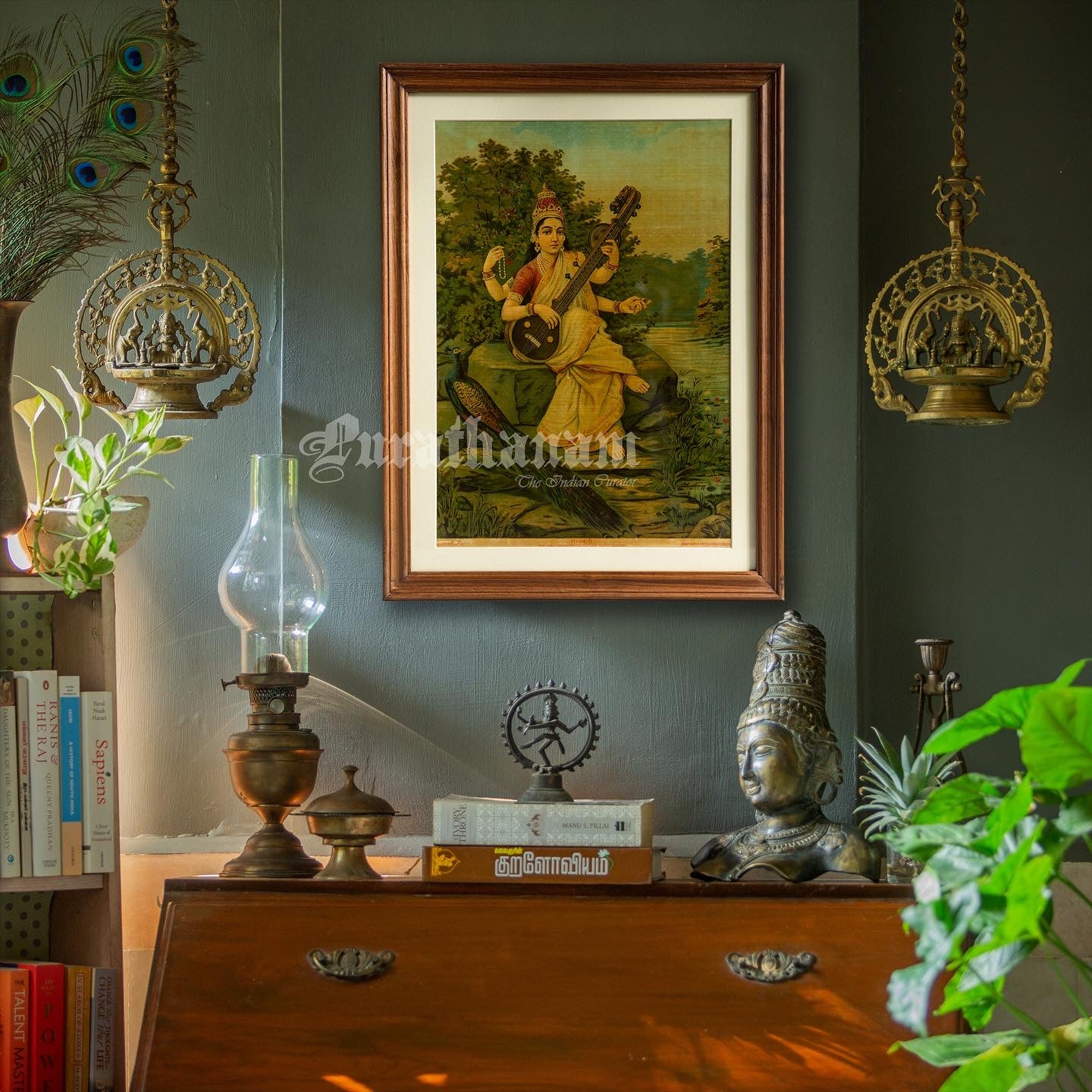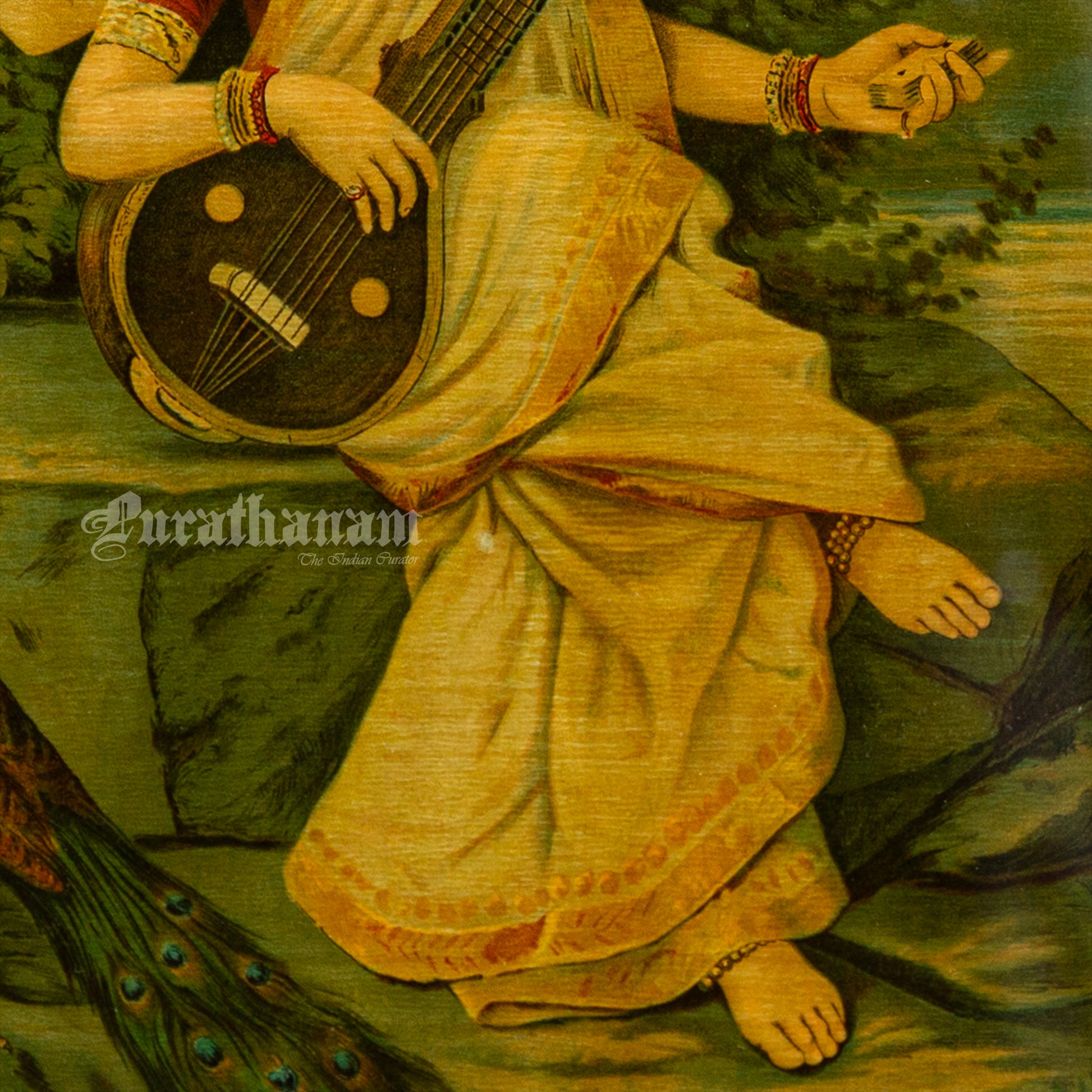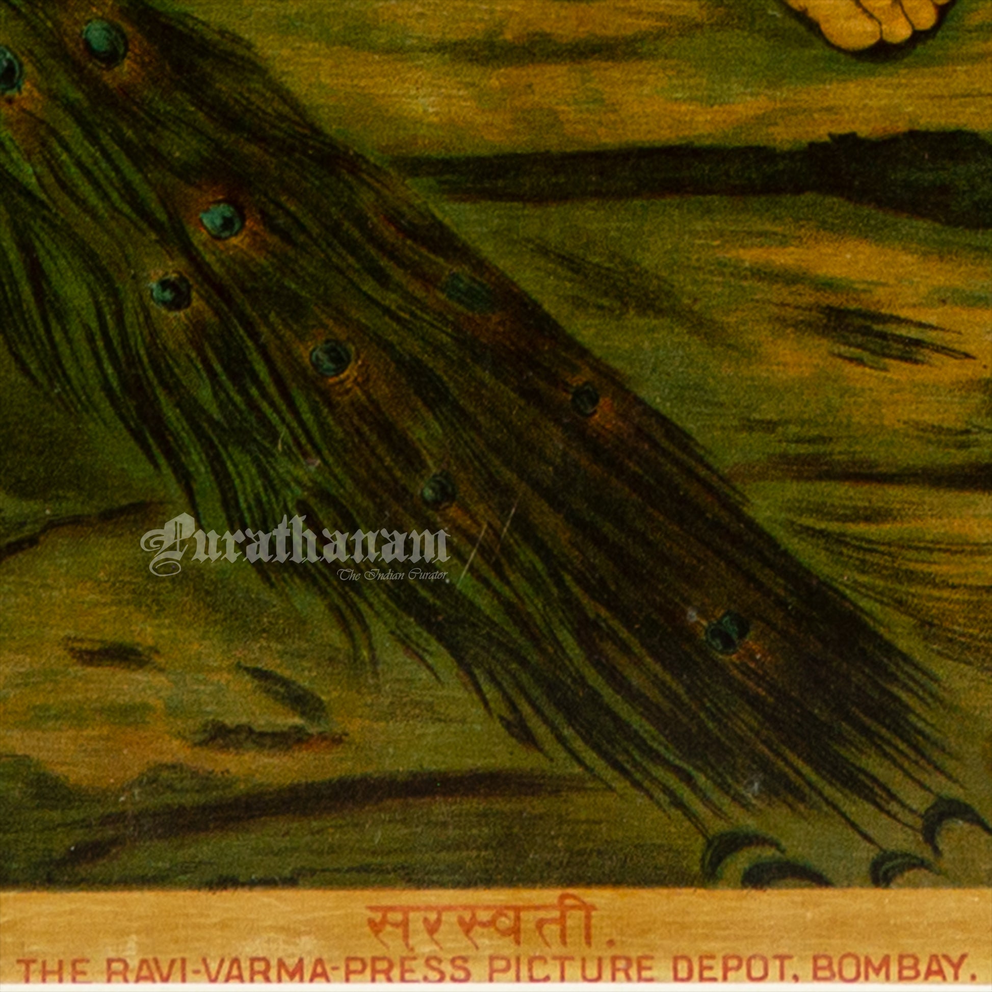 This is an oleograph print from 1920s of Sarasaati by Ravi Varma an Indian artist who achieved recognition for his depiction of scenes from the epics of the Mahabharata and Ramayana.