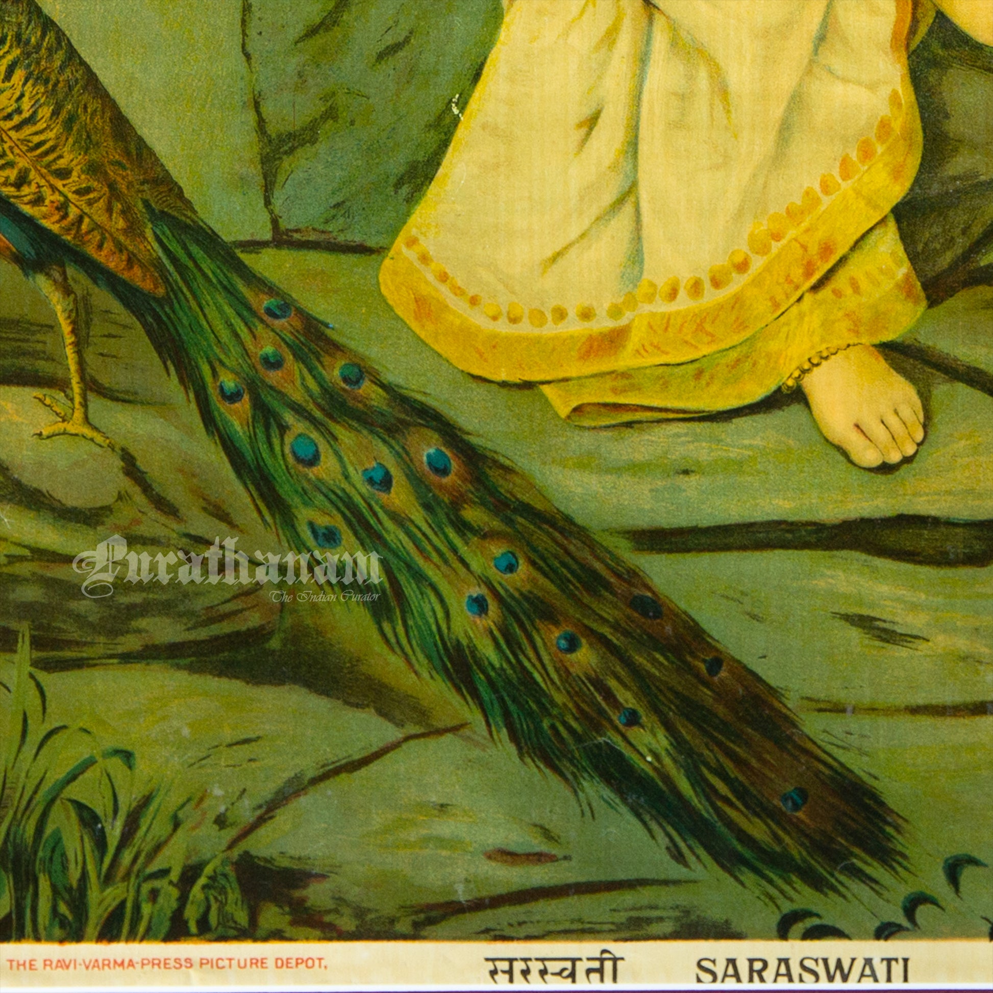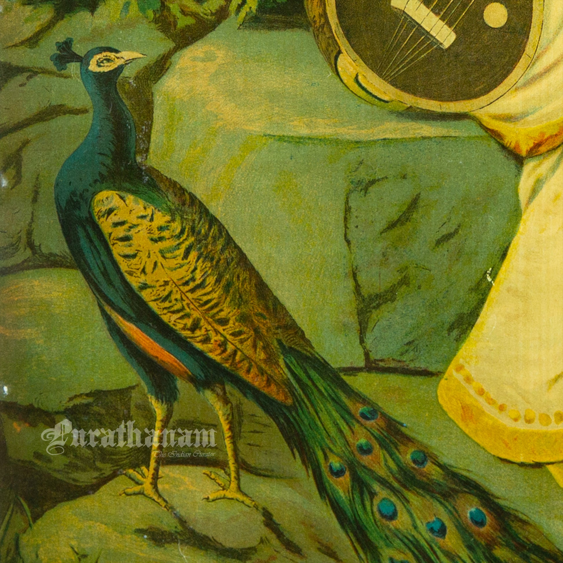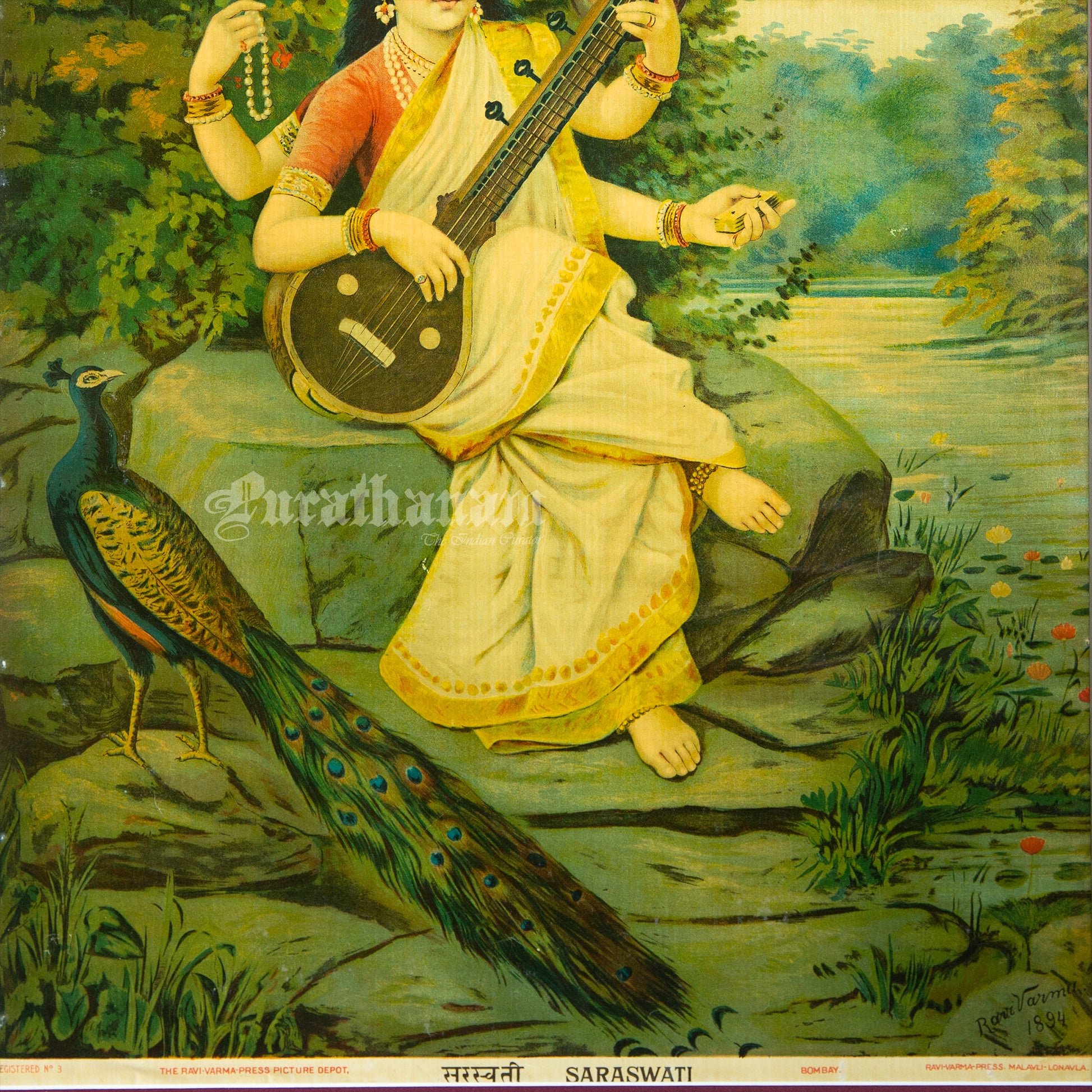 This is an oleograph print from 1890 -1900s of Saraswati by Ravi Varma an Indian artist who achieved recognition for his depiction of scenes from the epics of the Mahabharata and Ramayana.