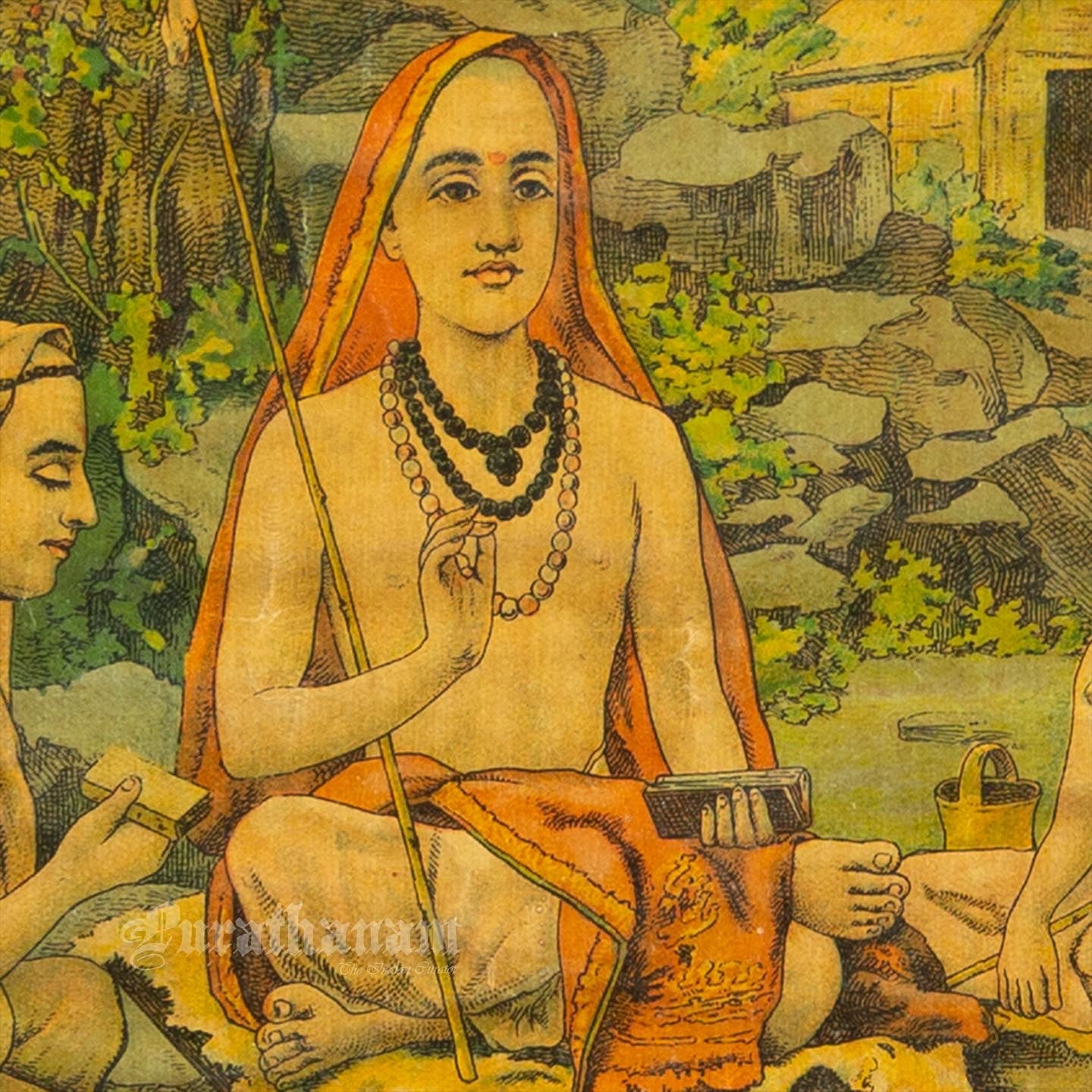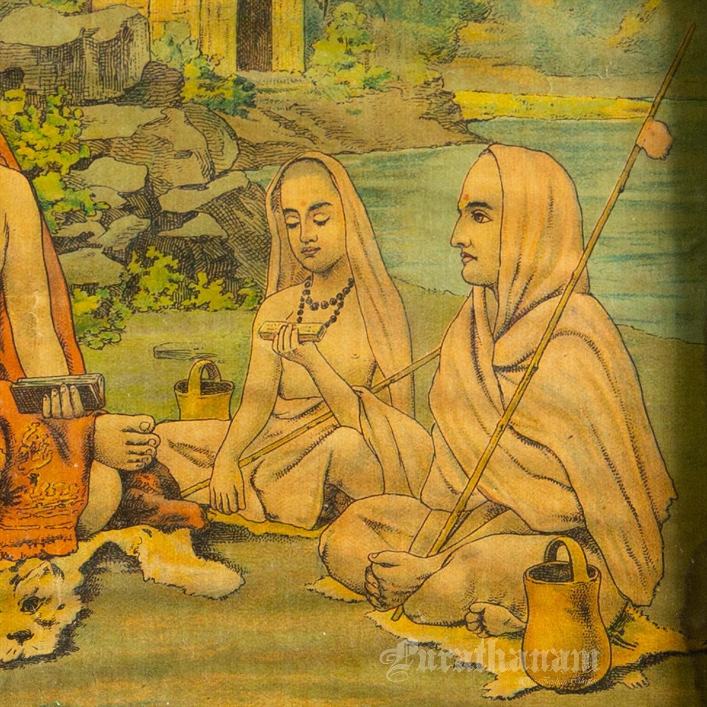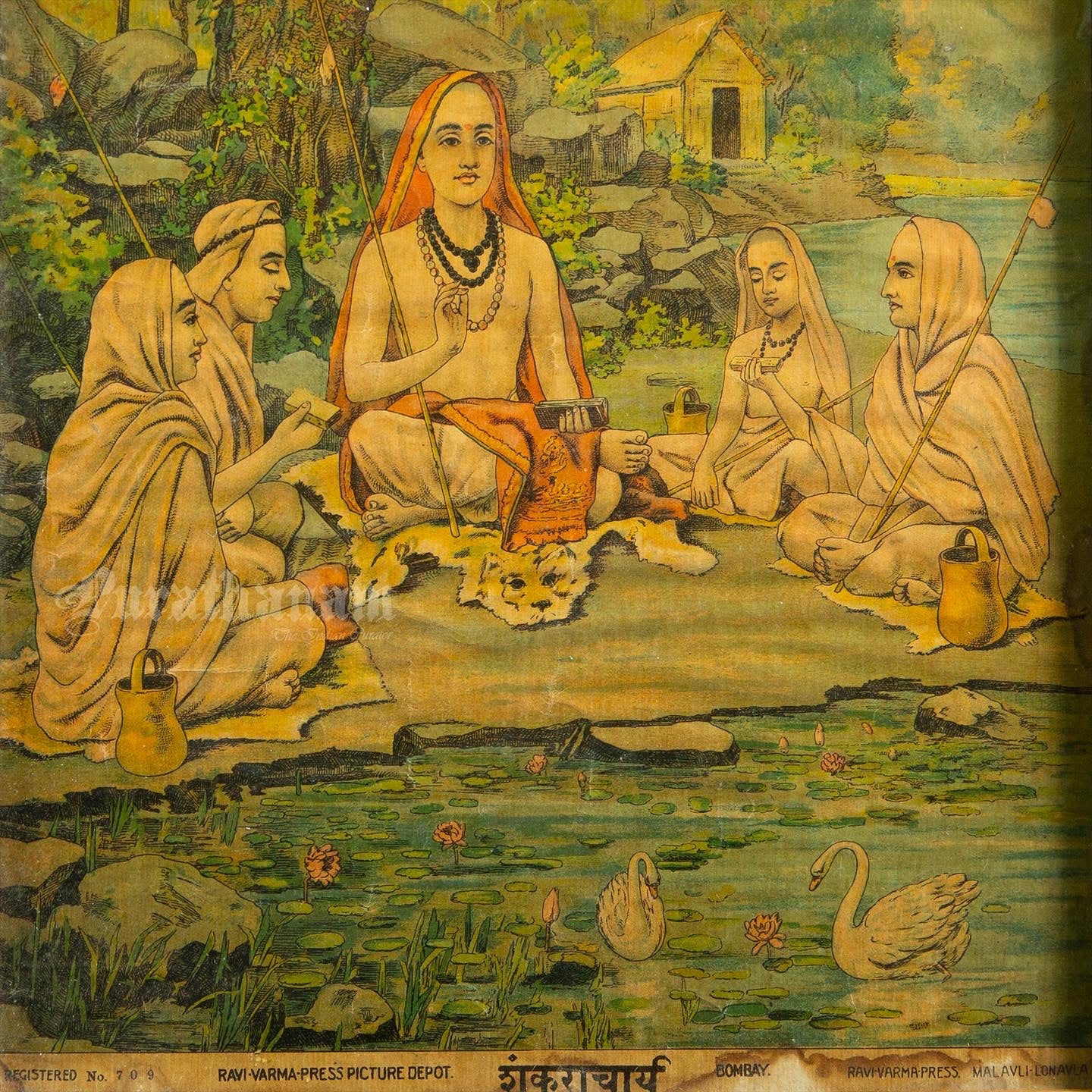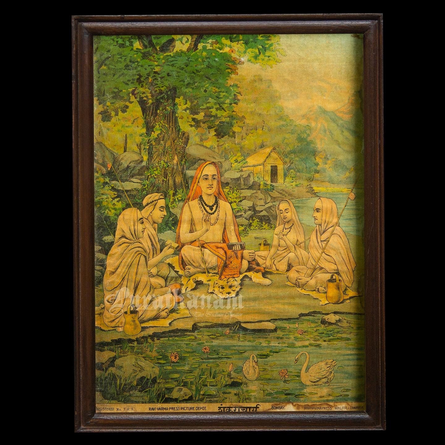 This is an oleograph print from 1920s of Shankarachari by Ravi Varma an Indian who achieved recognition for his depiction of scenes from the epics of the Mahabharata and Ramayana.