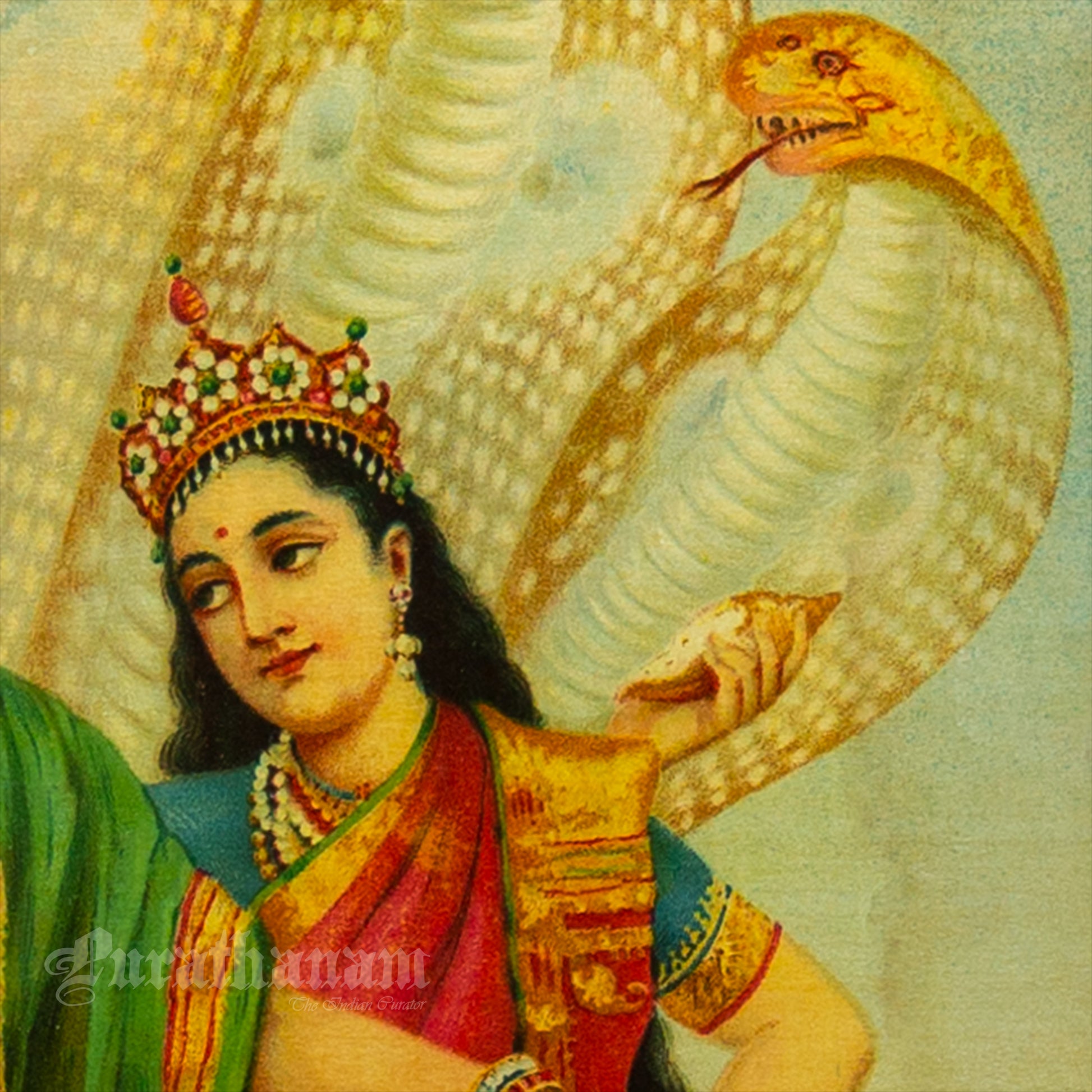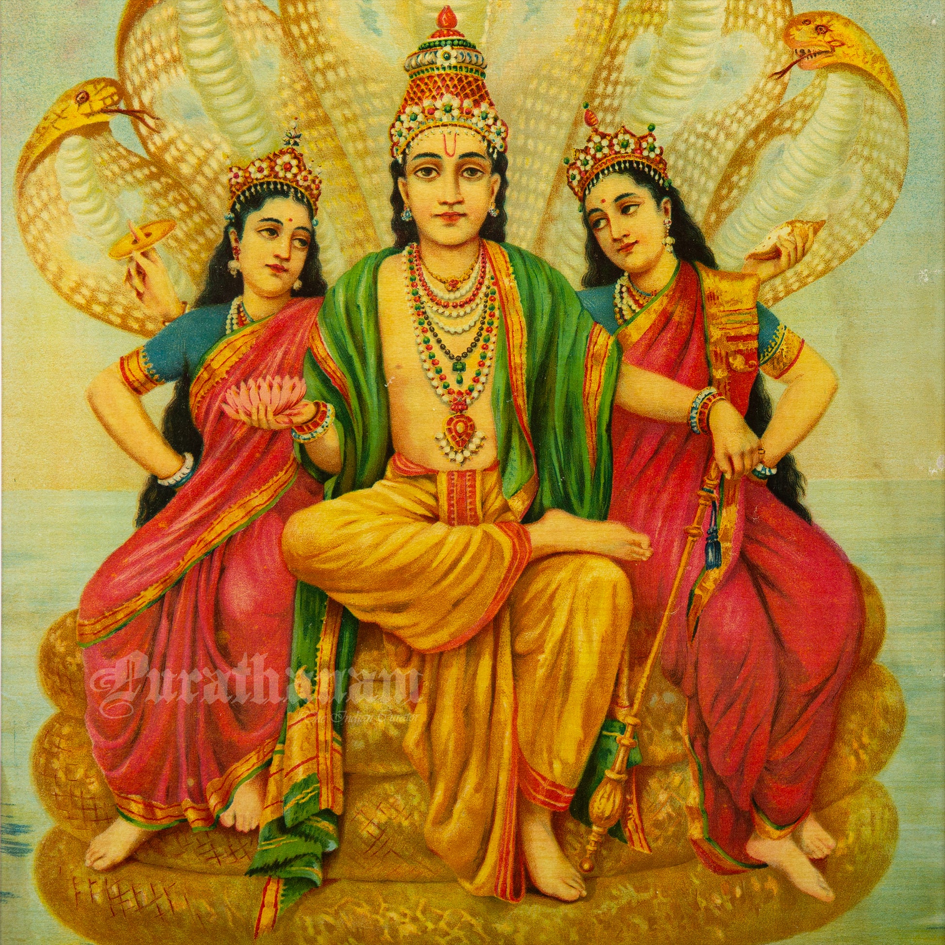 This is an oleograph print from 1920s- 1930s of Shesh Narayan by Ravi Varma by Ravi Varma an Indian painter who achieved recognition for his depiction of scenes from the epics of the Mahabharata and Ramayana.