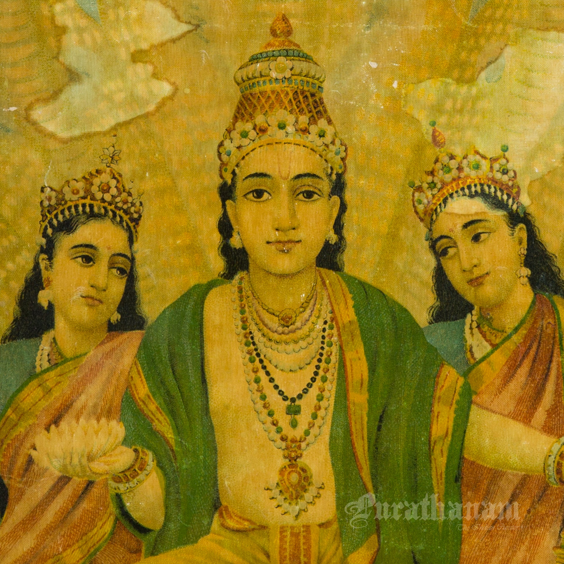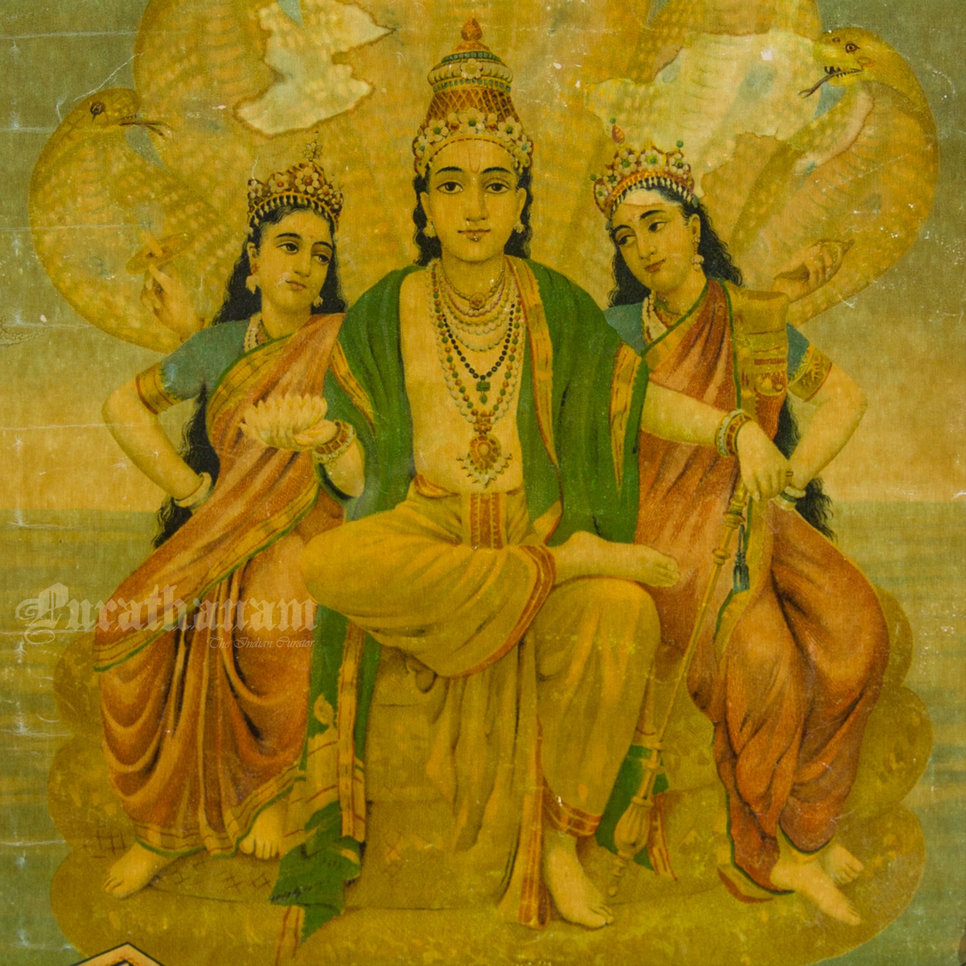 This is an oleograph print from 1920s of Shesh Narayan by Ravi Varma an Indian artist who achieved recognition for his depiction of scenes from the epics of the Mahabharata and Ramayana.