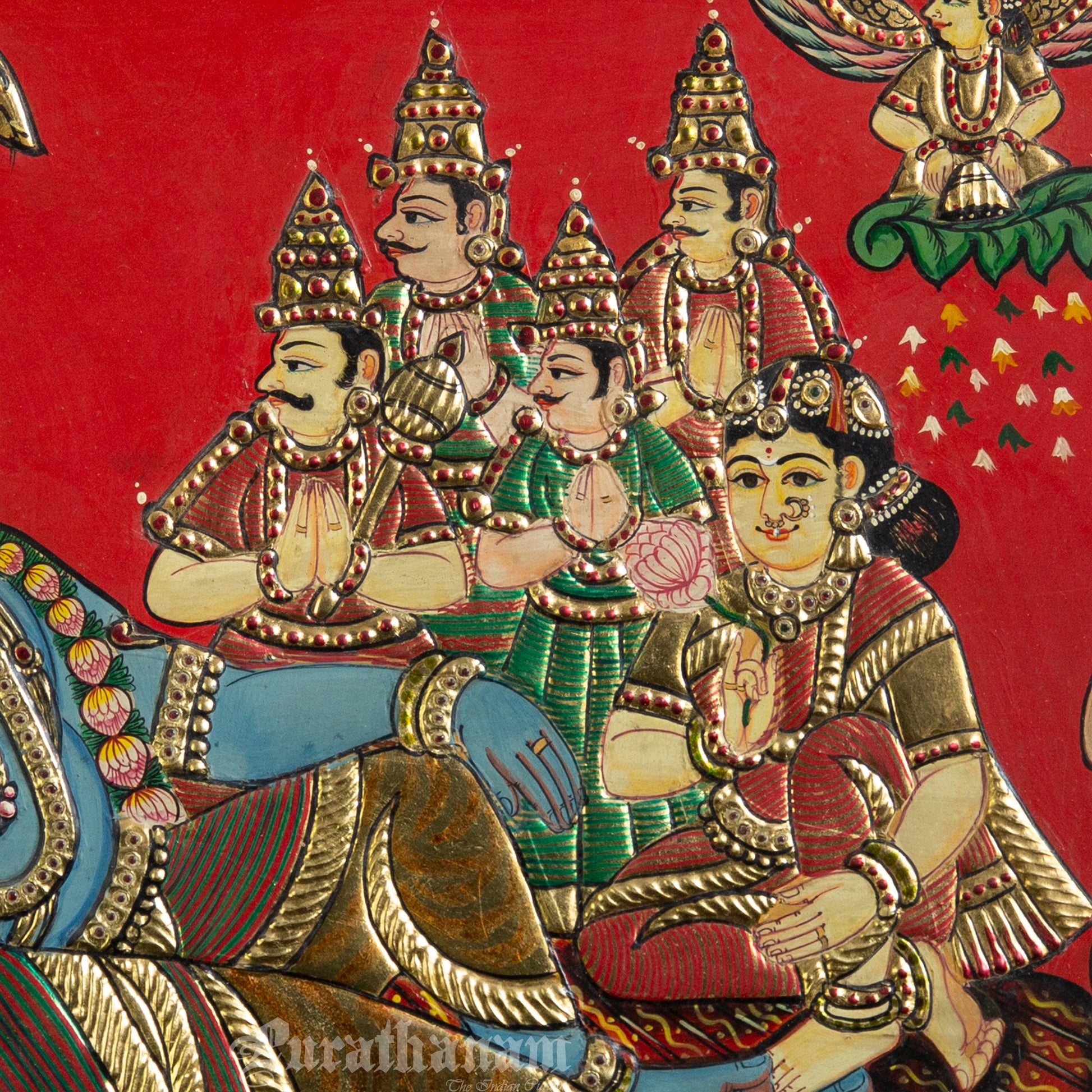- Natural Colors: The color medium used in early Tanjavur paintings was made from organic vegetable dyes, resulting in lighter shades compared to modern-day Tanjore paintings. These natural colors were not affected by light exposure at the time, as the paintings were mostly kept indoors and lit by dim traditional lamps. However, with the invention of electricity and the use of brighter lighting, it became harder for these colors to survive over time.