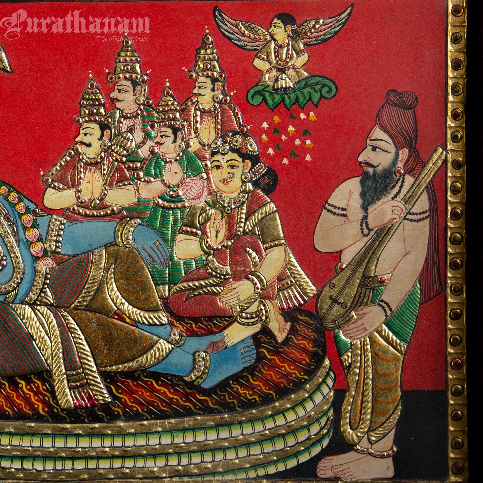 This stunning Tanjore painting captures a unique depiction of Shesha Shayi Krishna, blending the classical iconography of Lord Vishnu reclining on the cosmic serpent with the softer features and peacock feather of Lord Krishna. Surrounded by celestial beings and the sage Narada, this artwork reflects a devotional fusion that evolved through the Bhakti movement, where Krishna and Vishnu were often worshipped as one. Handcrafted in traditional Tanjore style with rich colors, gold foil work, and intricate detailing, this piece brings home not just divine grace, but also a rare artistic perspective.