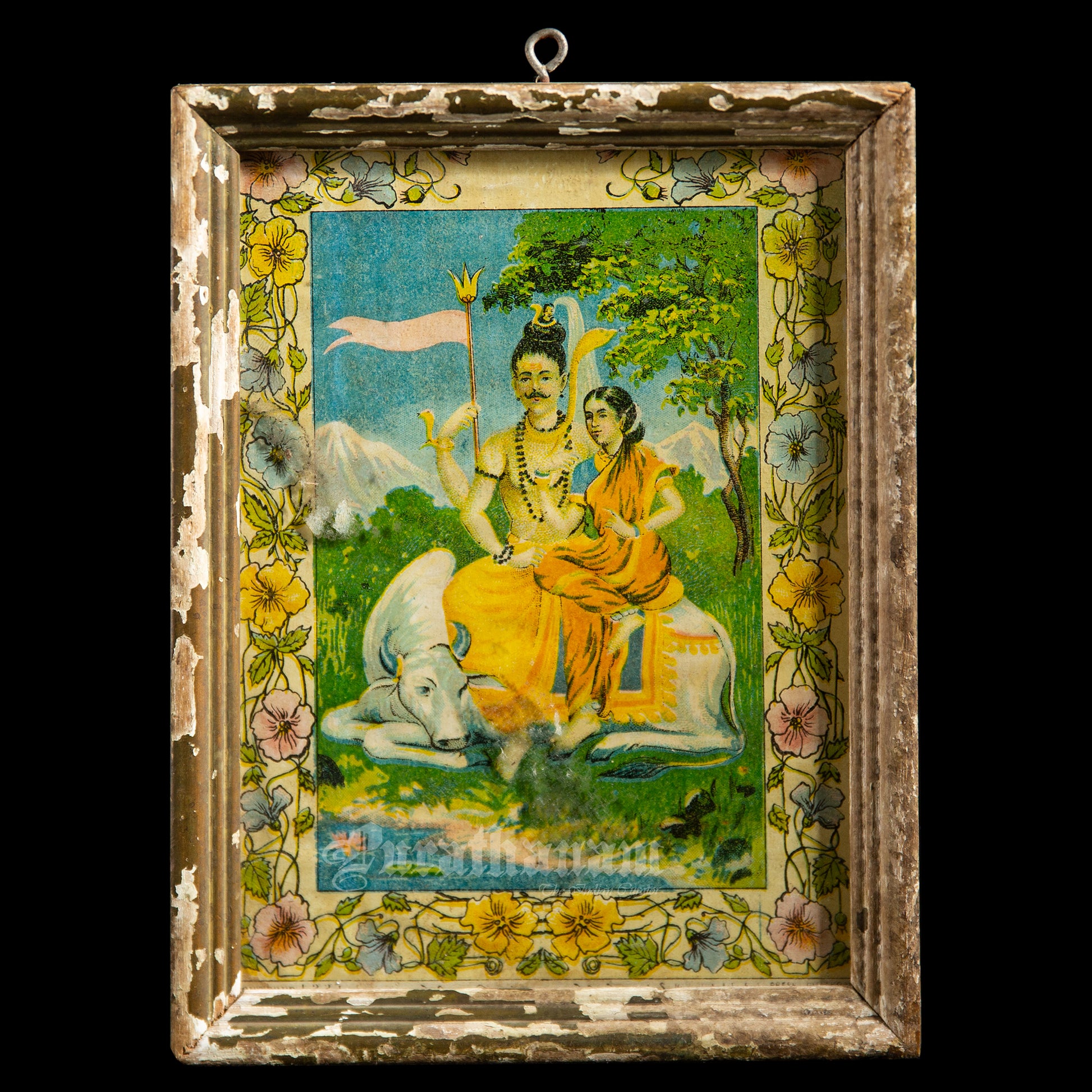 A mini lithograph print from 1920s of Shiva Parvati by Ravi Varma, an Indian who achieved recognition for his depiction of scenes from the epics of the Mahabharata and Ramayana.