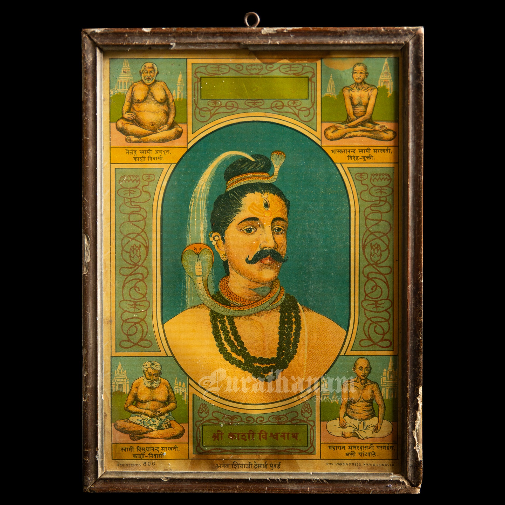 A mini lithograph print from 1920s of Shree Kasi Vishwanath by Ravi Varma, an Indian who achieved recognition for his depiction of scenes from the epics of the Mahabharata and Ramayana.