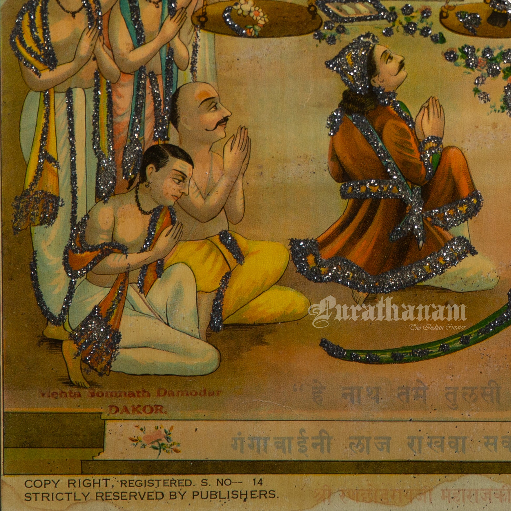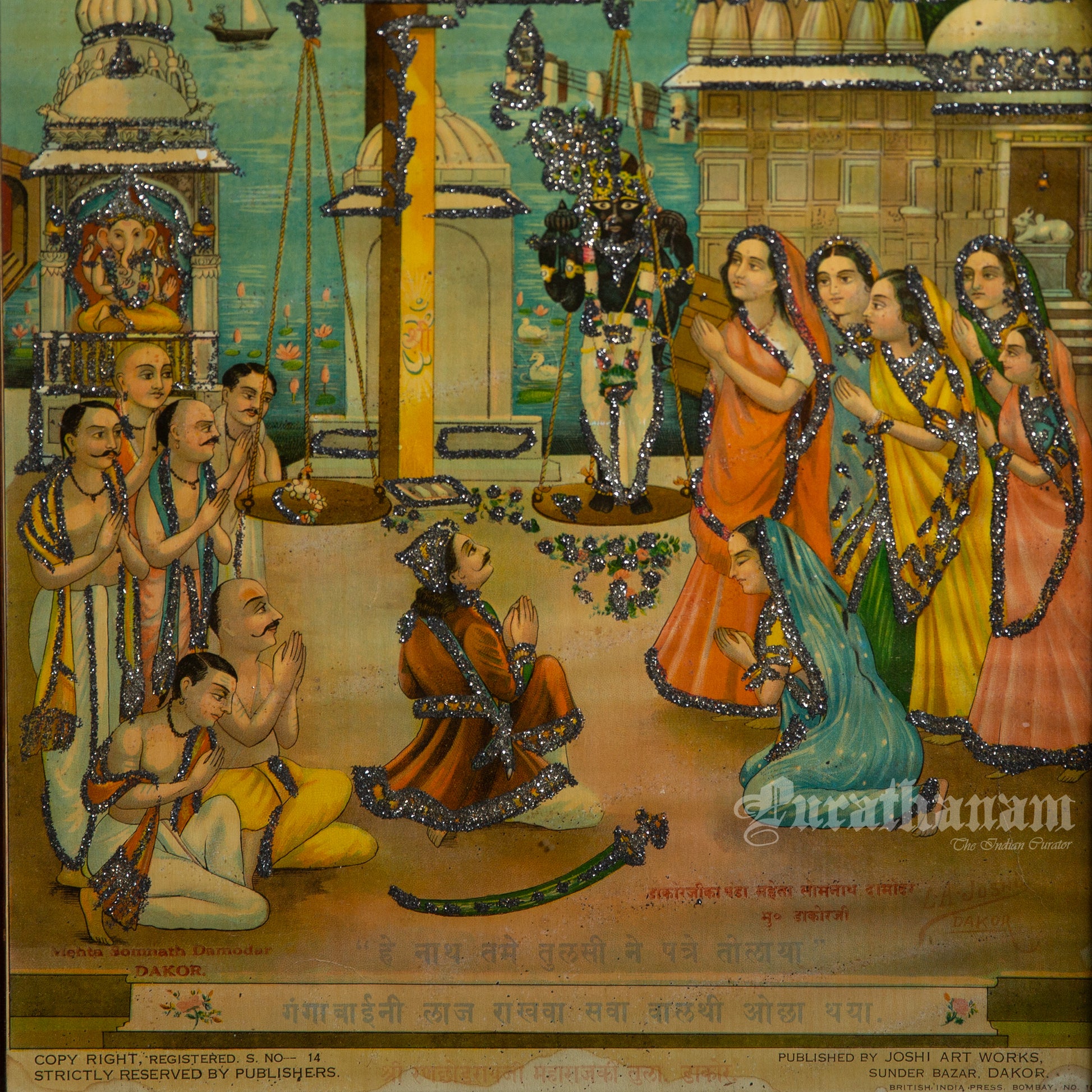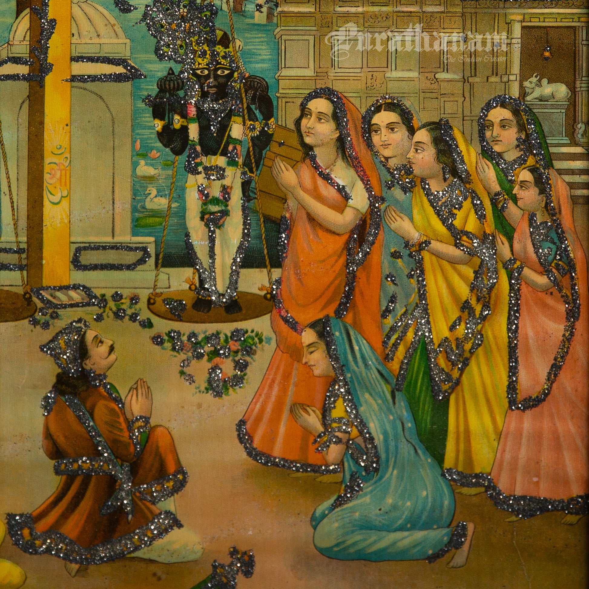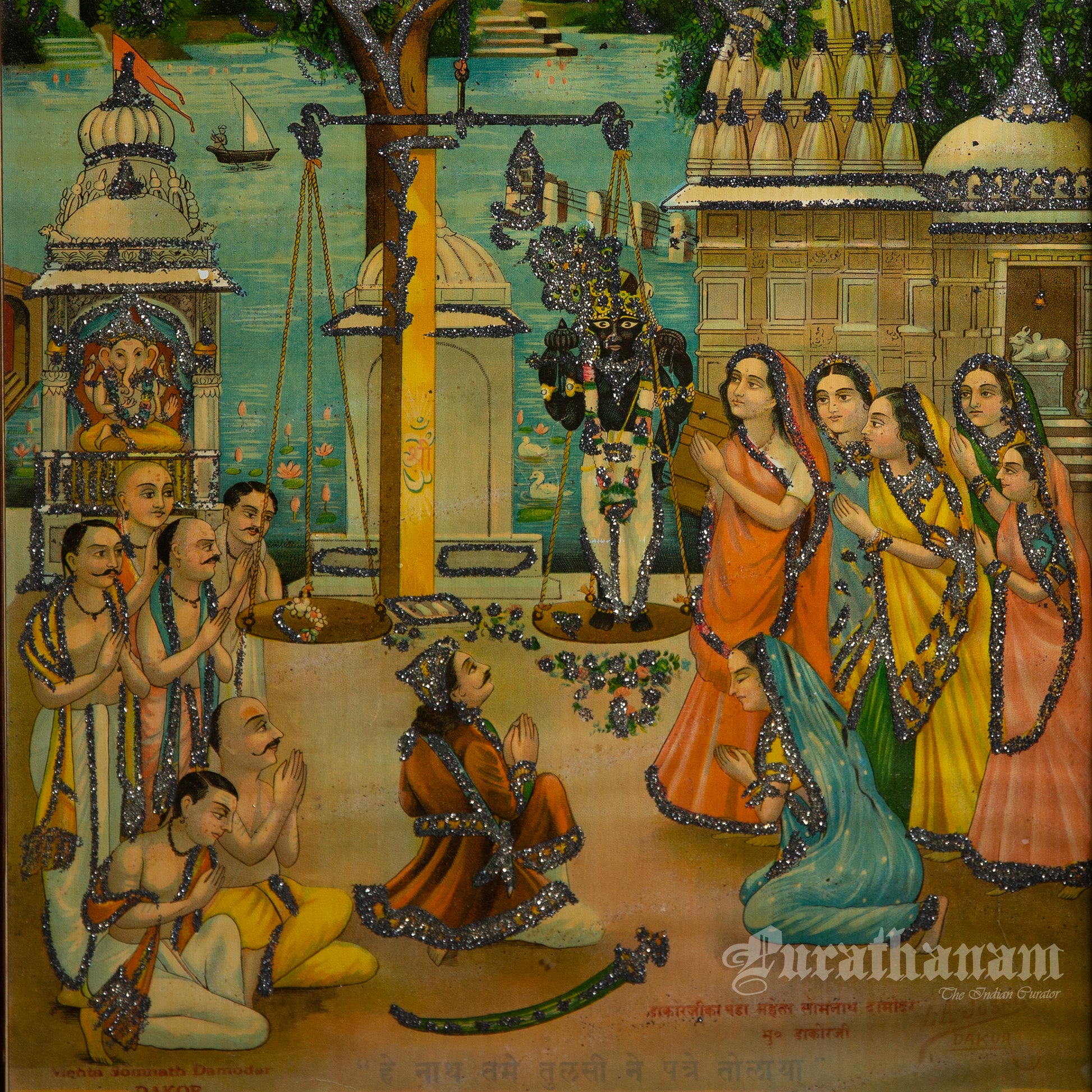 This is an embellished oleograph print from mid 1900s of Shree ranchod ji Maharaj, Dakor by an Indian painter L. A. Joshi.