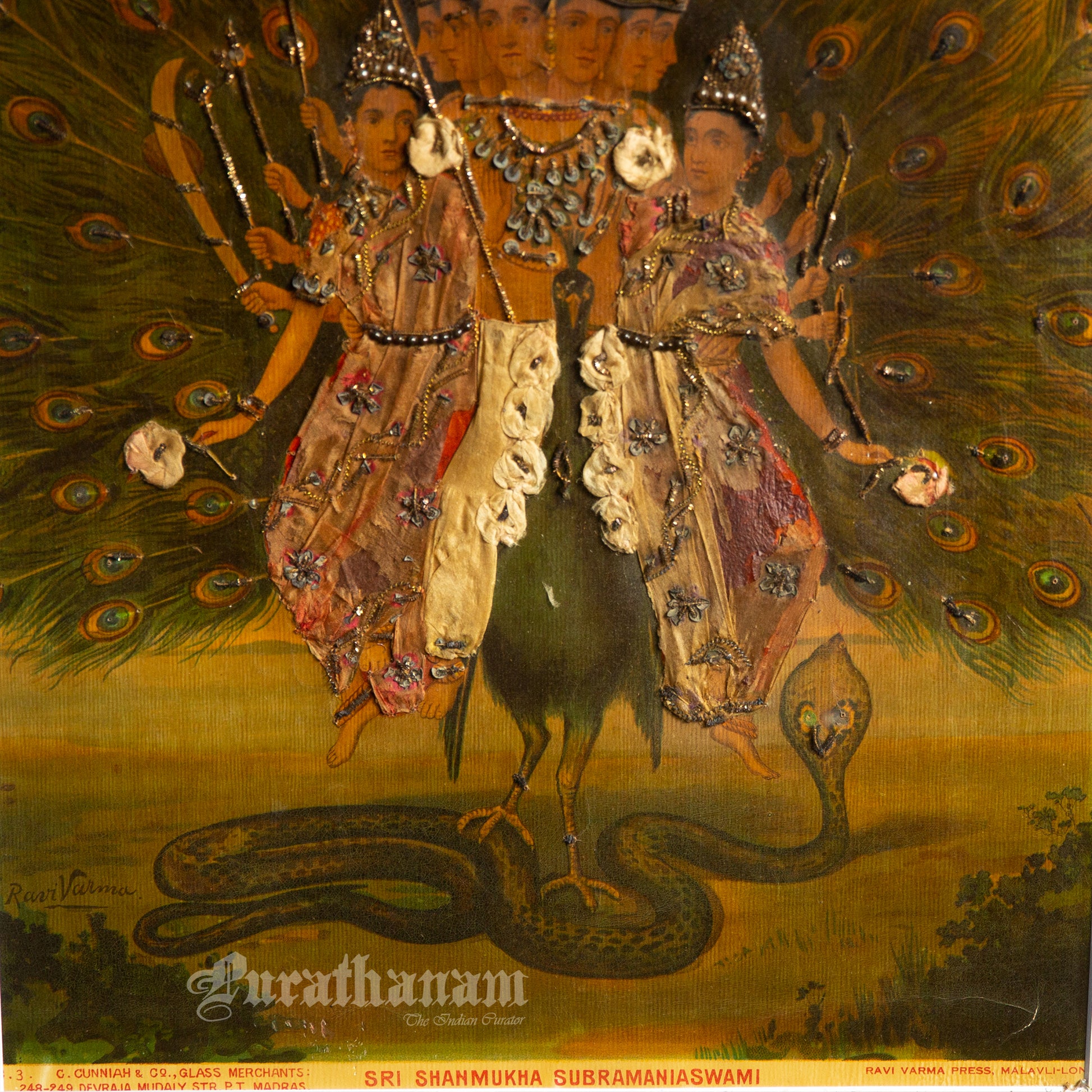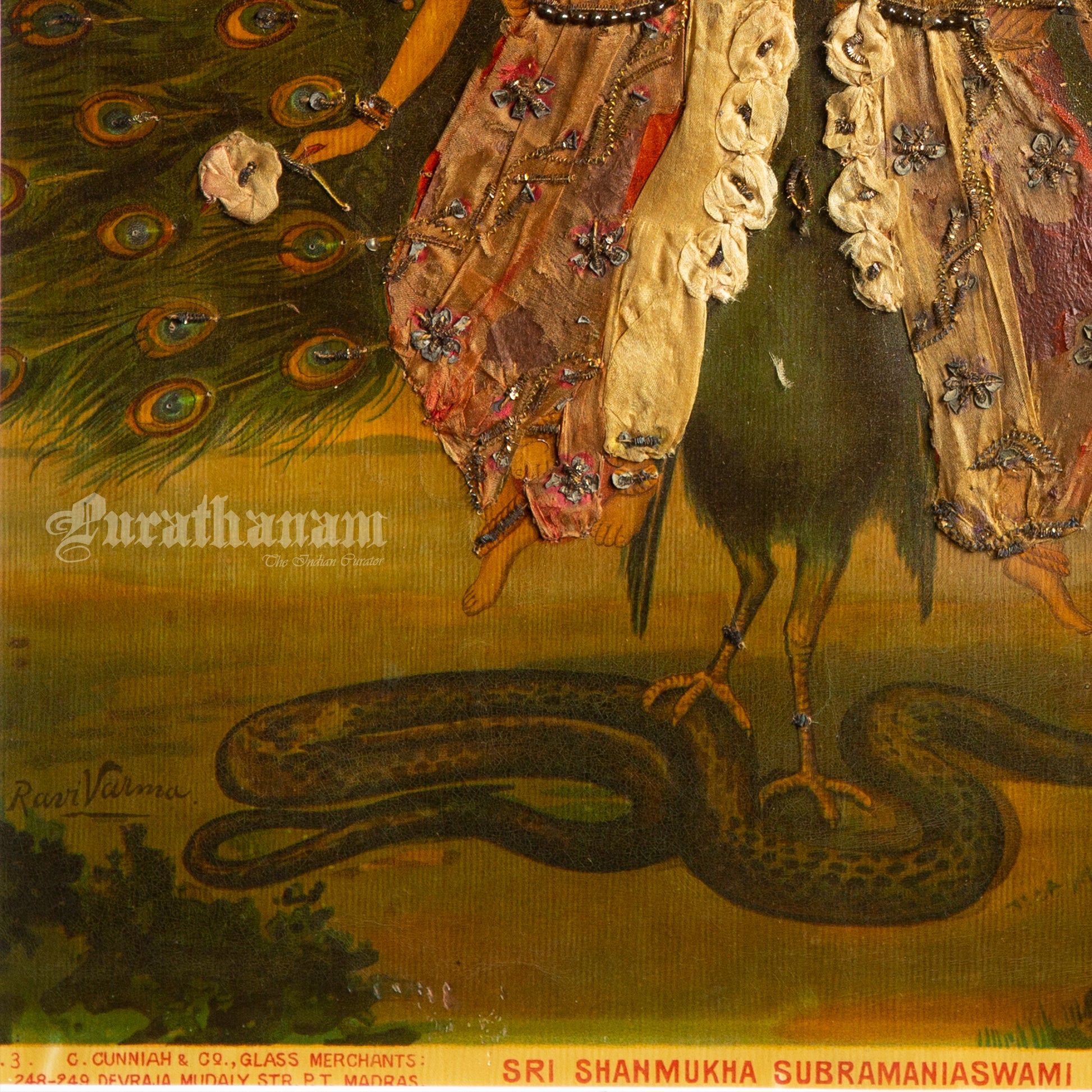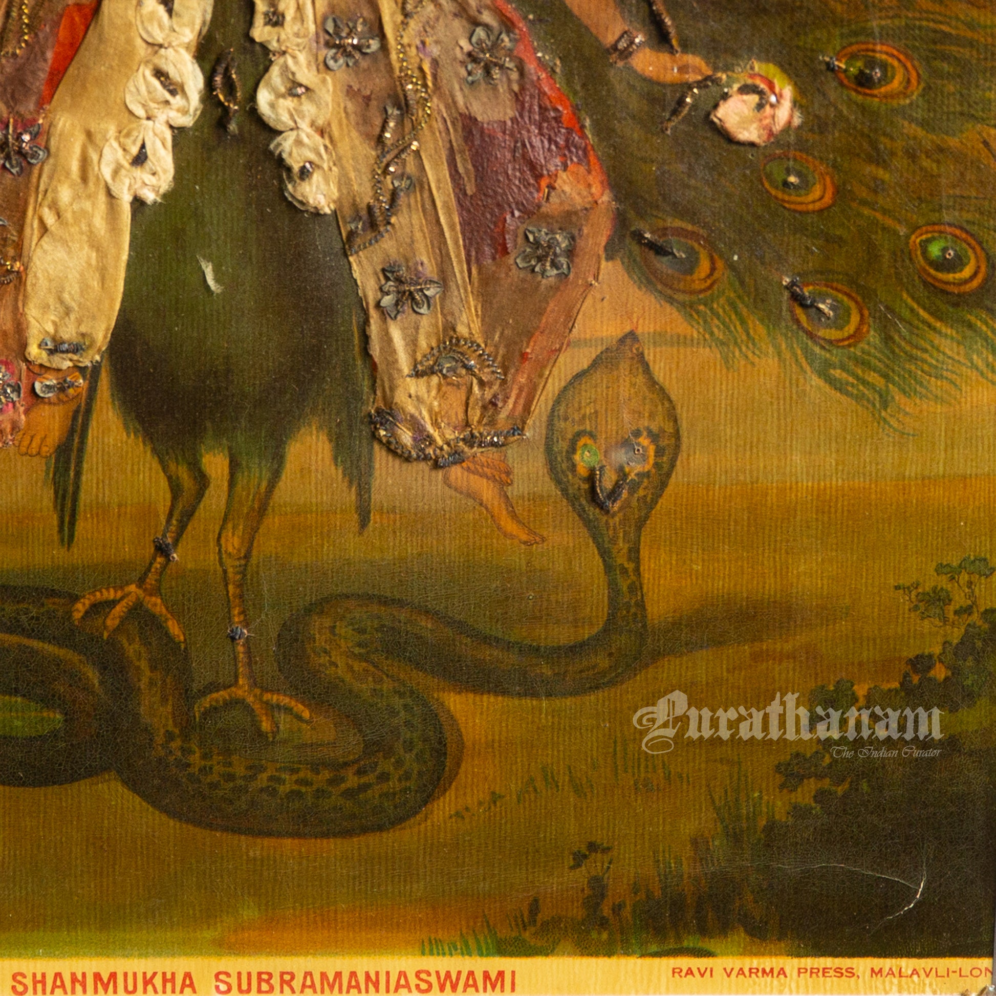 This is an embellished oleograph print from 1920s- 1930s Of Shri Shanmukha Subramaniaswami by Ravi Varma an Indian painter who achieved recognition for his depiction of scenes from the epics of the Mahabharata and Ramayana.