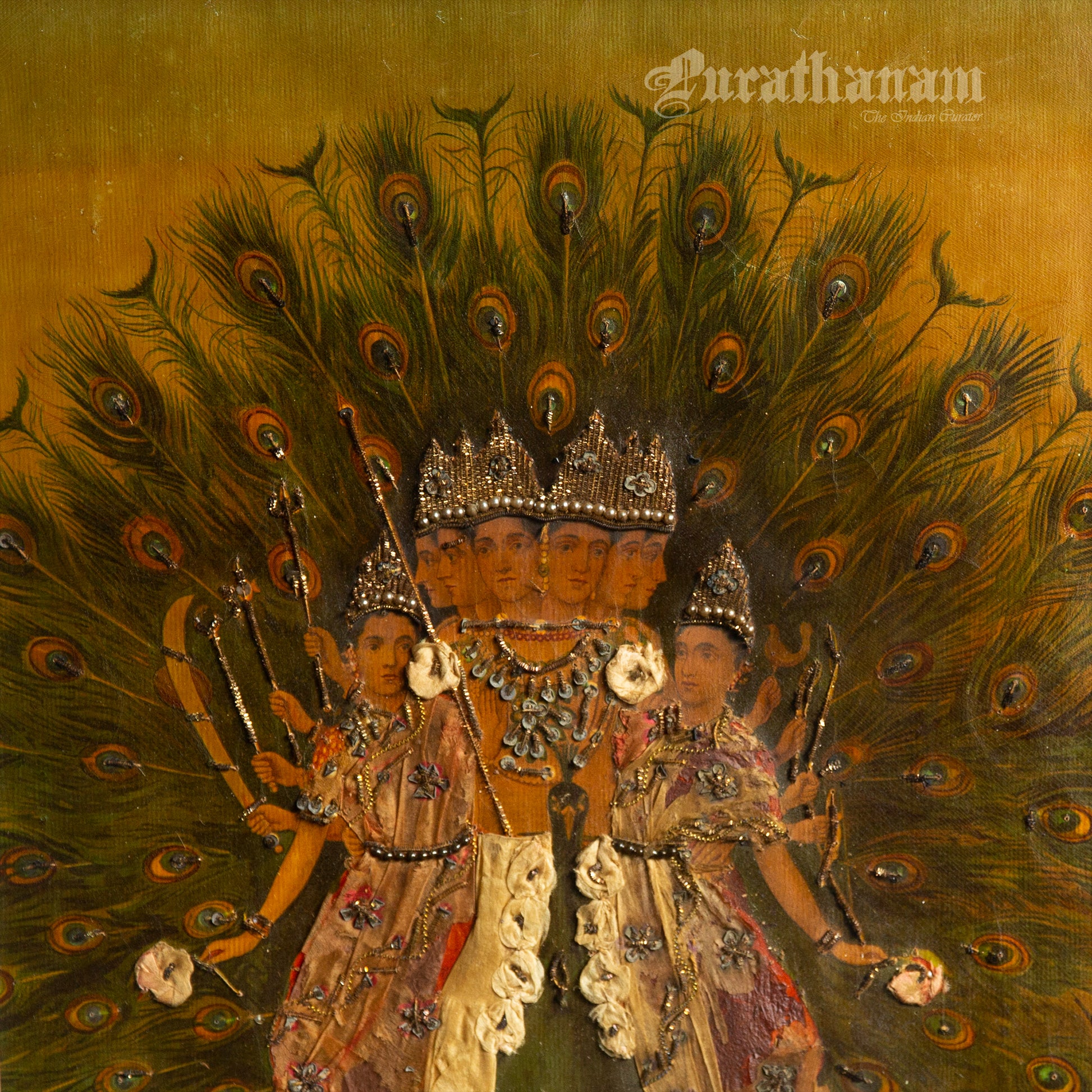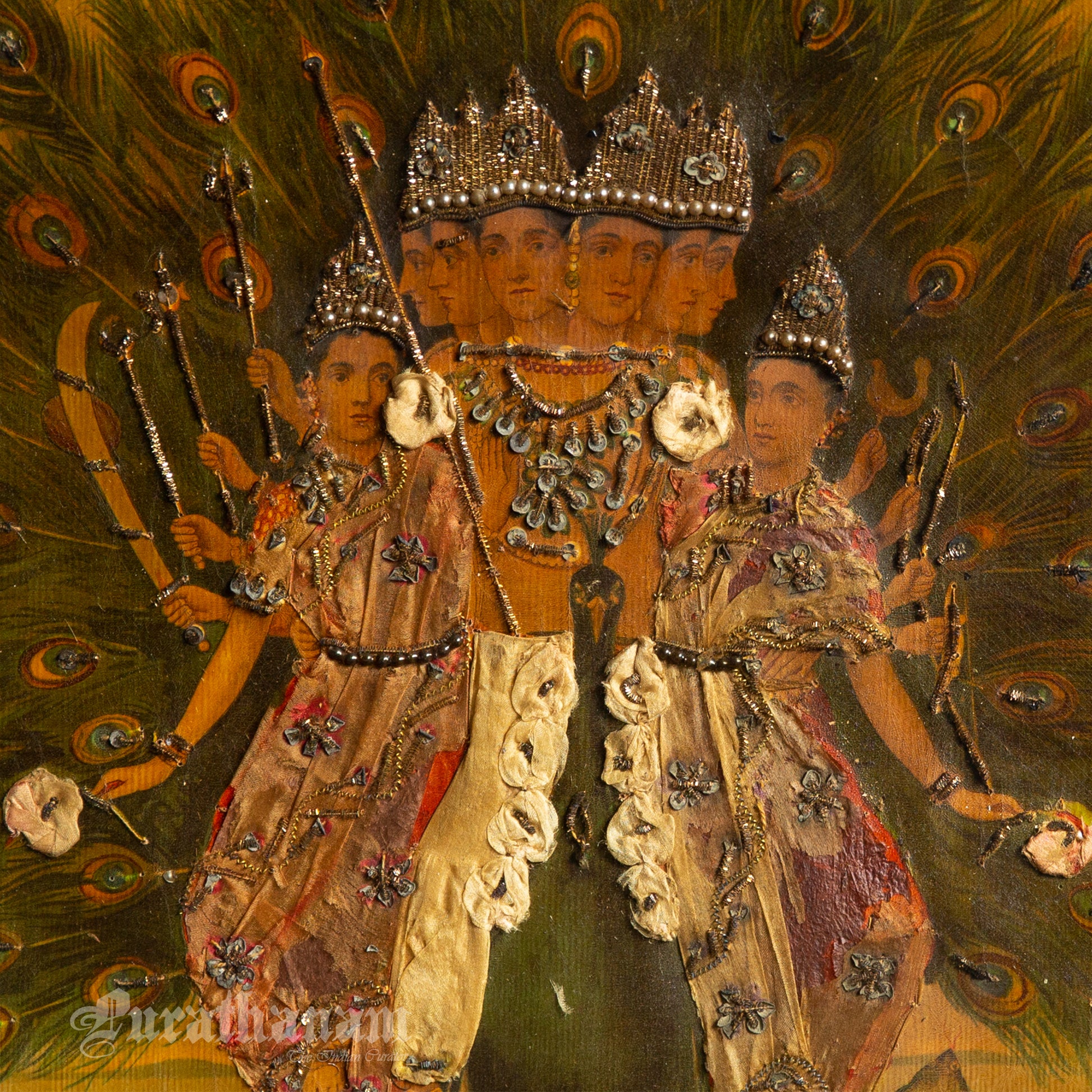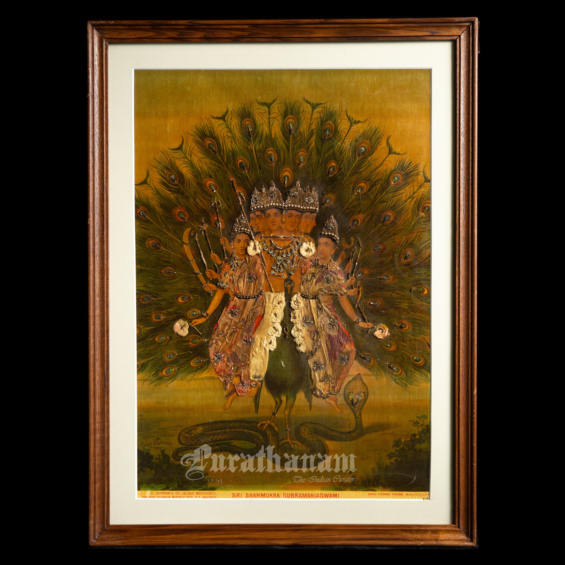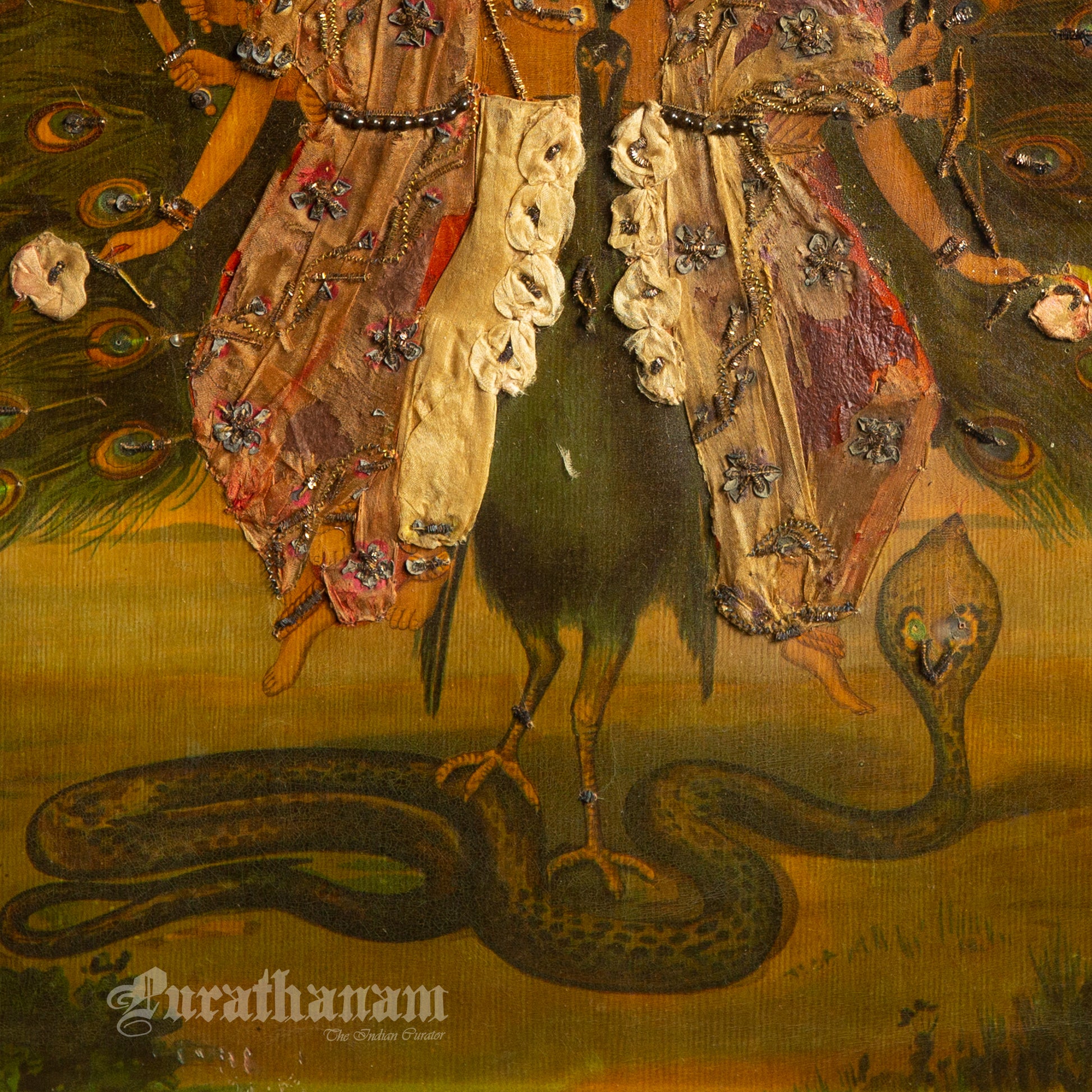 This is an embellished oleograph print from 1920s- 1930s Of Shri Shanmukha Subramaniaswami by Ravi Varma an Indian painter who achieved recognition for his depiction of scenes from the epics of the Mahabharata and Ramayana.